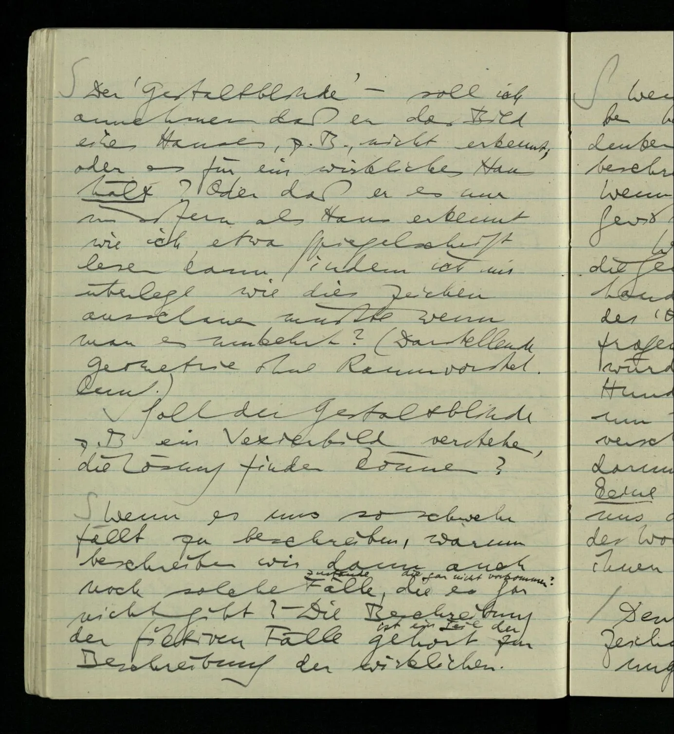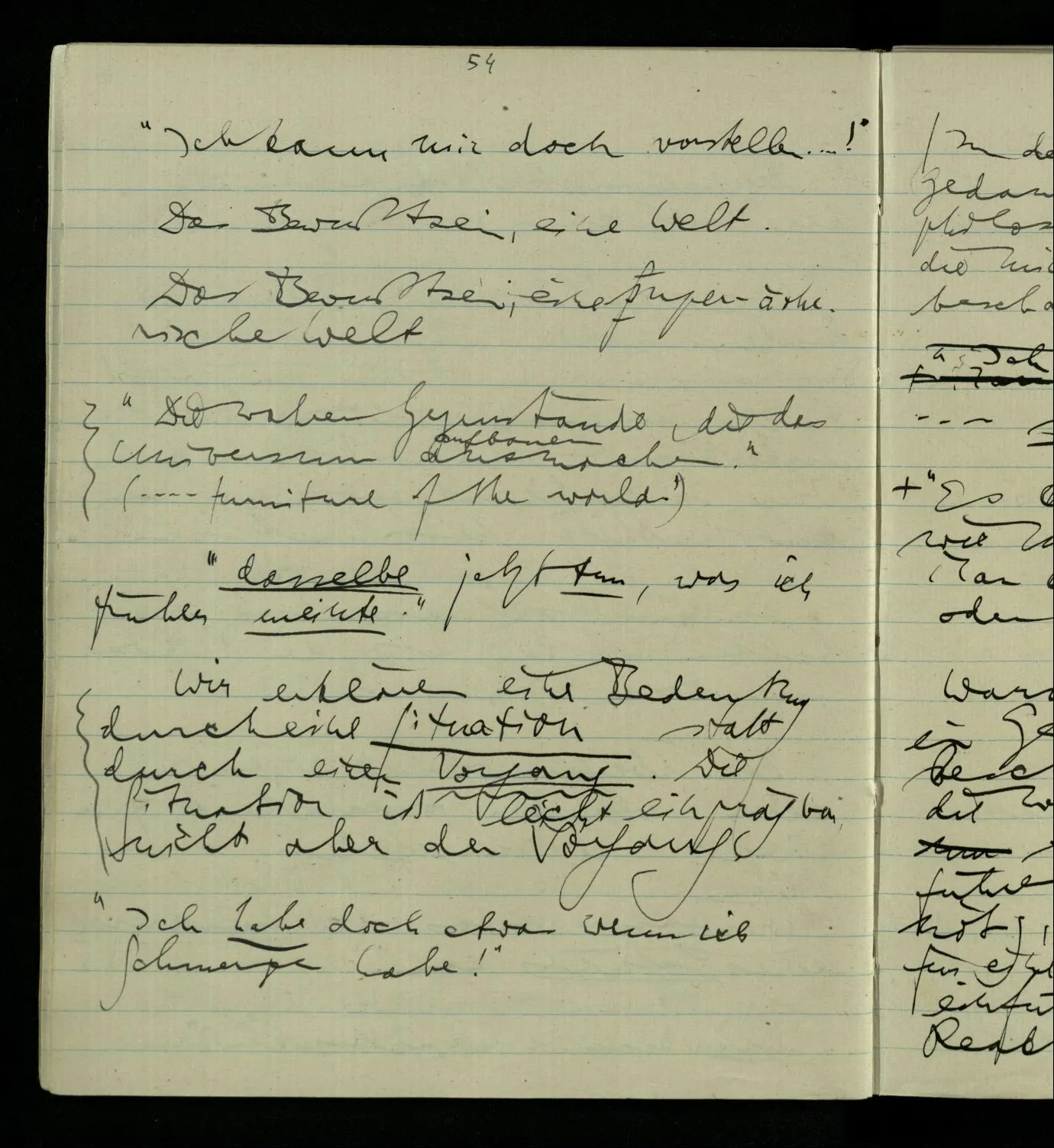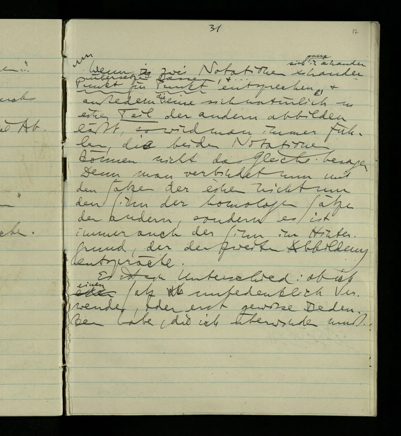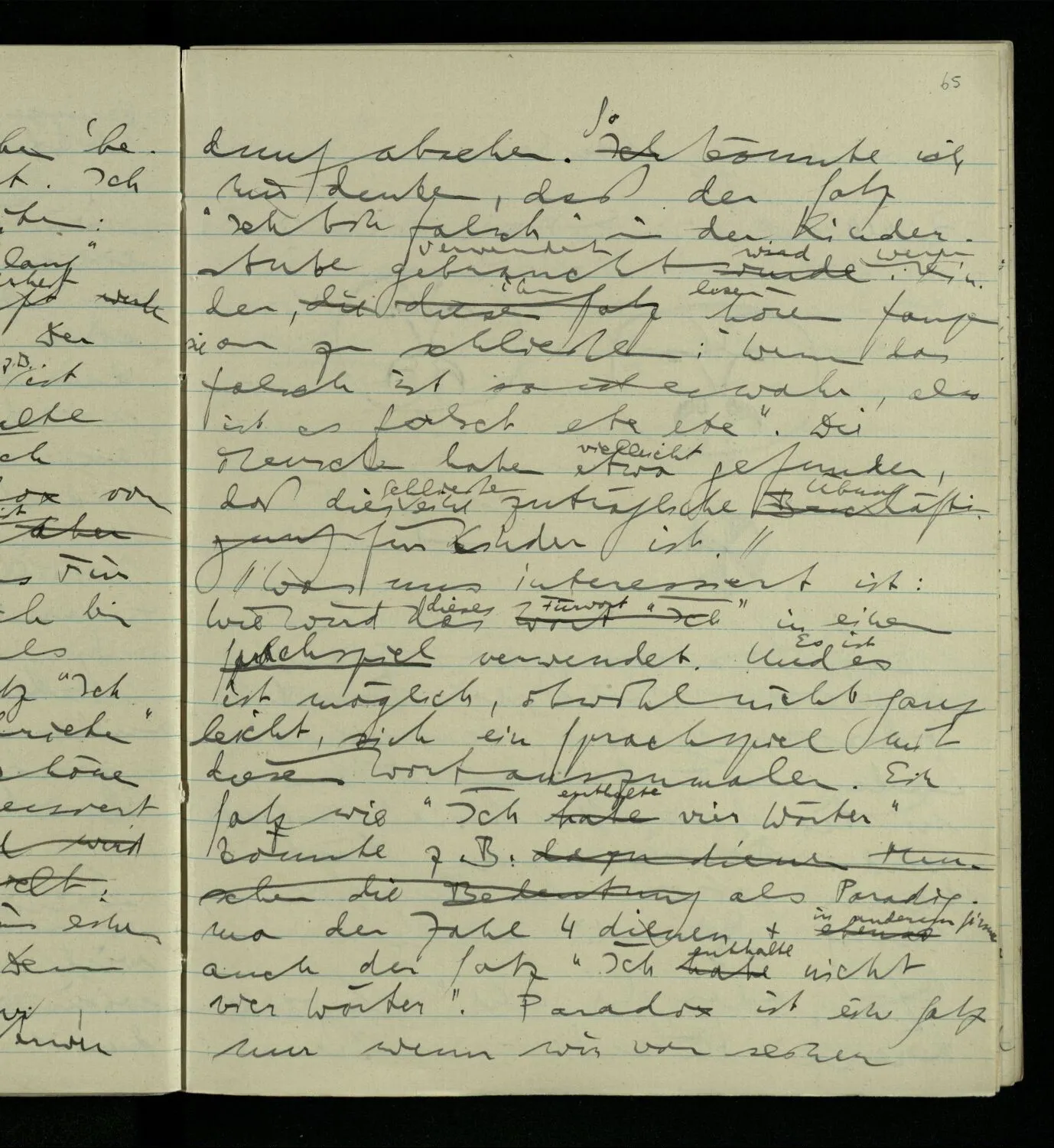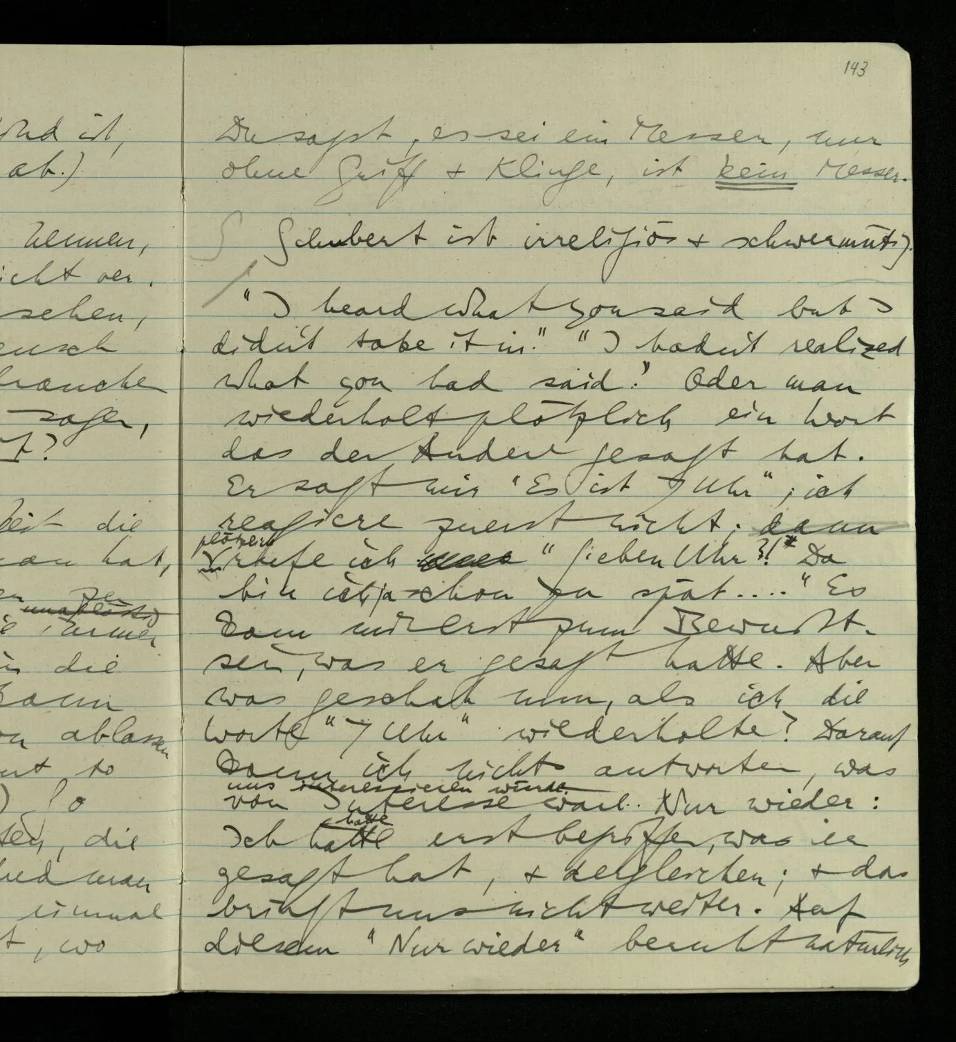 Niemand kümmert sich darum, ob etwas, noch darum, was in mir vorgeht, wenn man zu mir spricht. Man fragt auch für gewöhnlich nicht, wann ich den Satz verstanden habe, & ich merke auch nicht daß es damit einmal so, einmal so beschaffen ist. Außer, wenn ich einmal einen mißverstehe oder dergleichen. Und dann kann die Frage “Wann fingst Du an, ihn zu verstehen” Wichtigkeit erhalten. Aber es ist nun, als ob erst in so einem Falle überhaupt von wichtigen Erlebnissen des Verstehens die Rede wäre. Und könnte man sagen: nur das Erlebnis beim Wechsel der Bedeutungen sei von Wichtigkeit? – Oder auch so: nur das sei das wichtige Erlebnis, das einen gleichzeitigen Ausdruck hat?