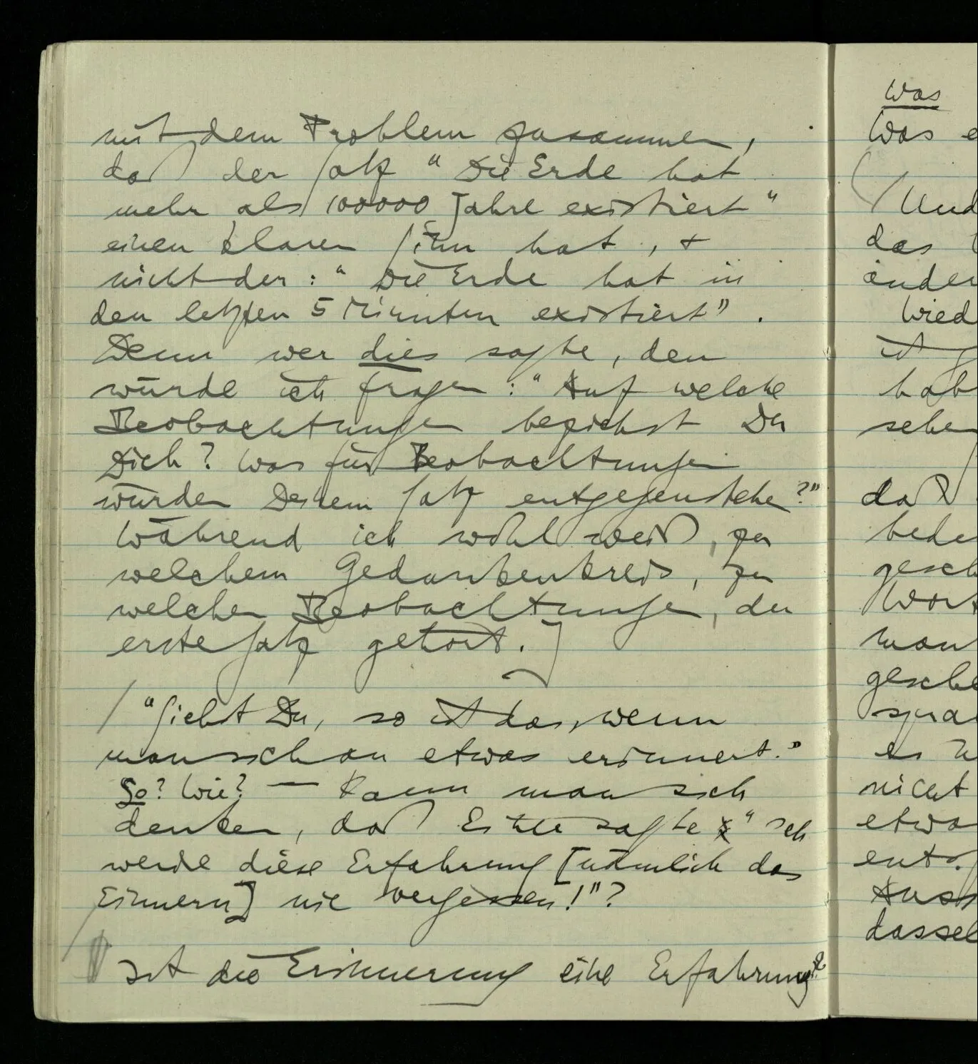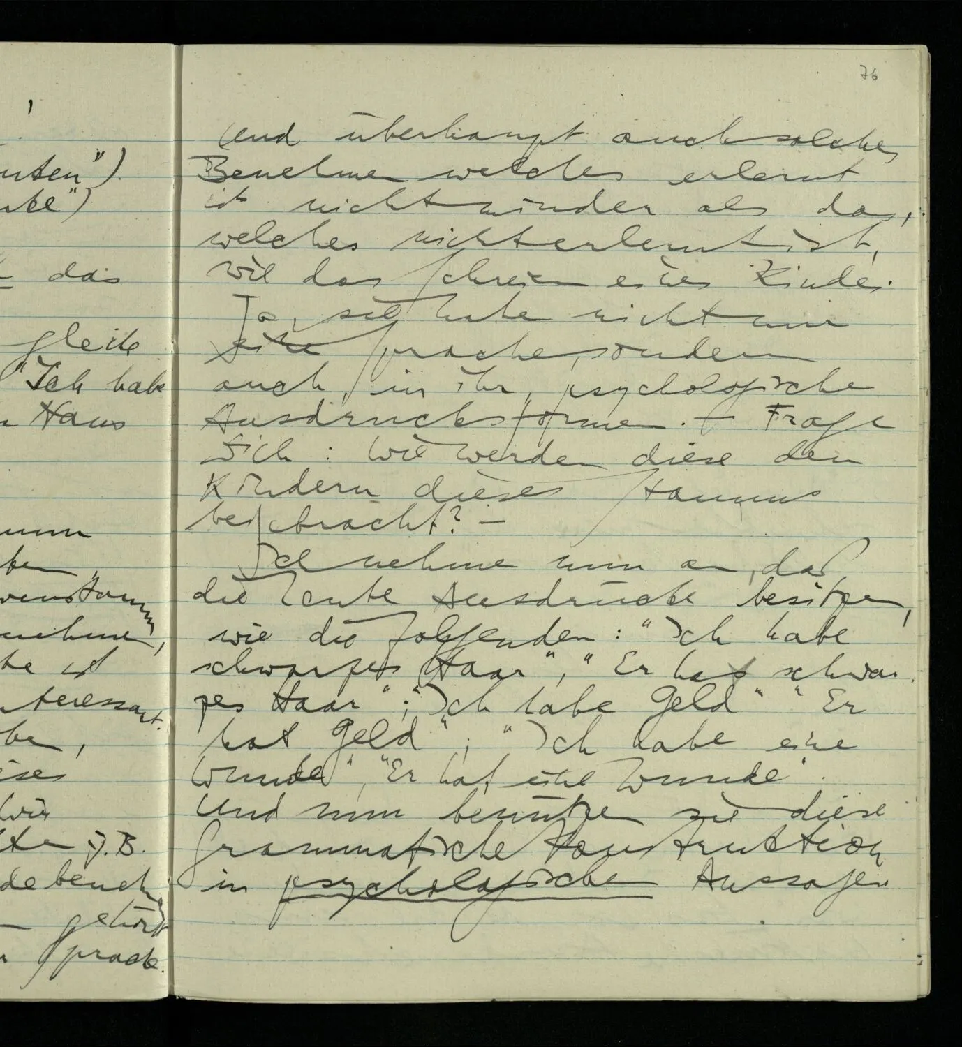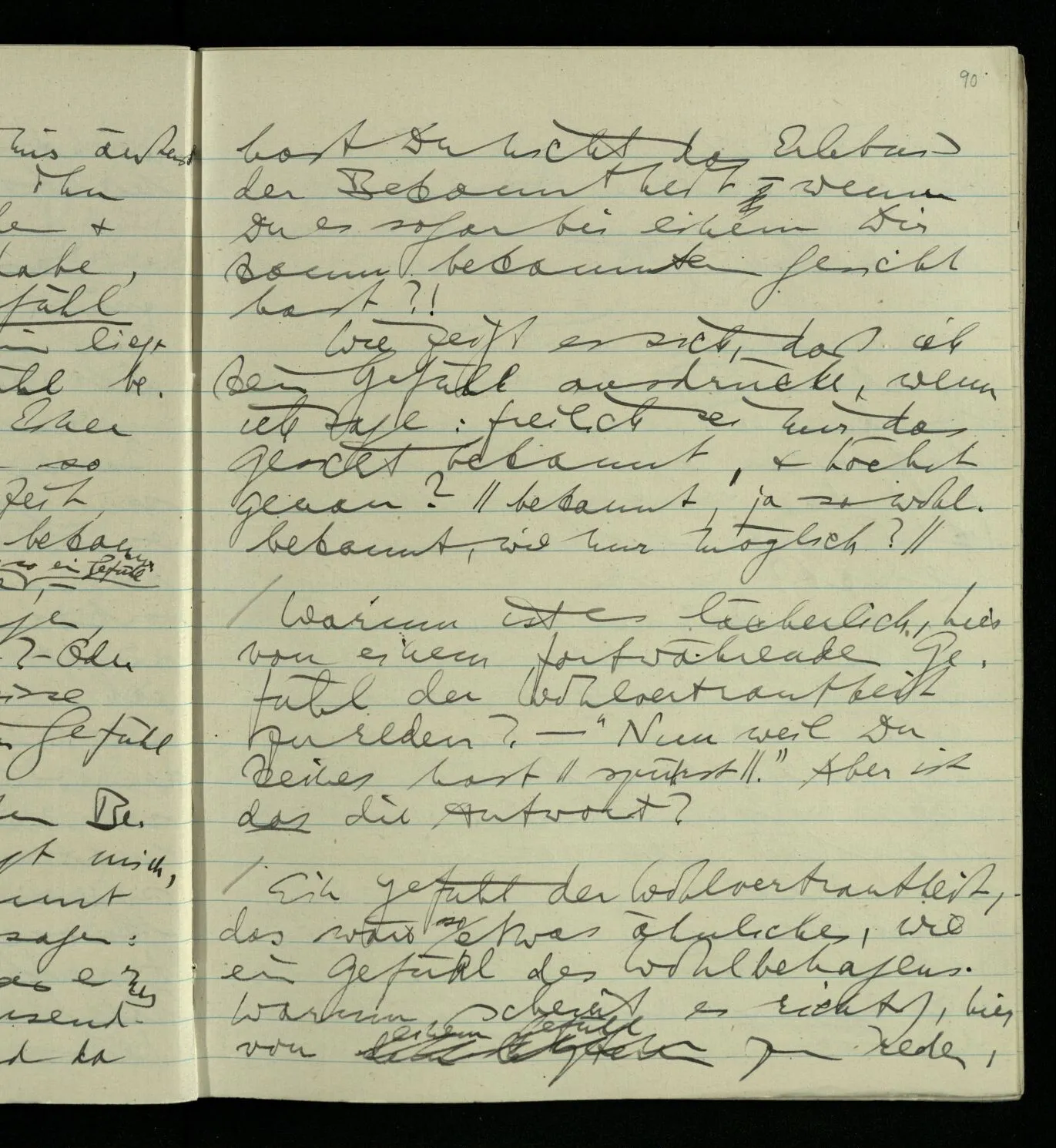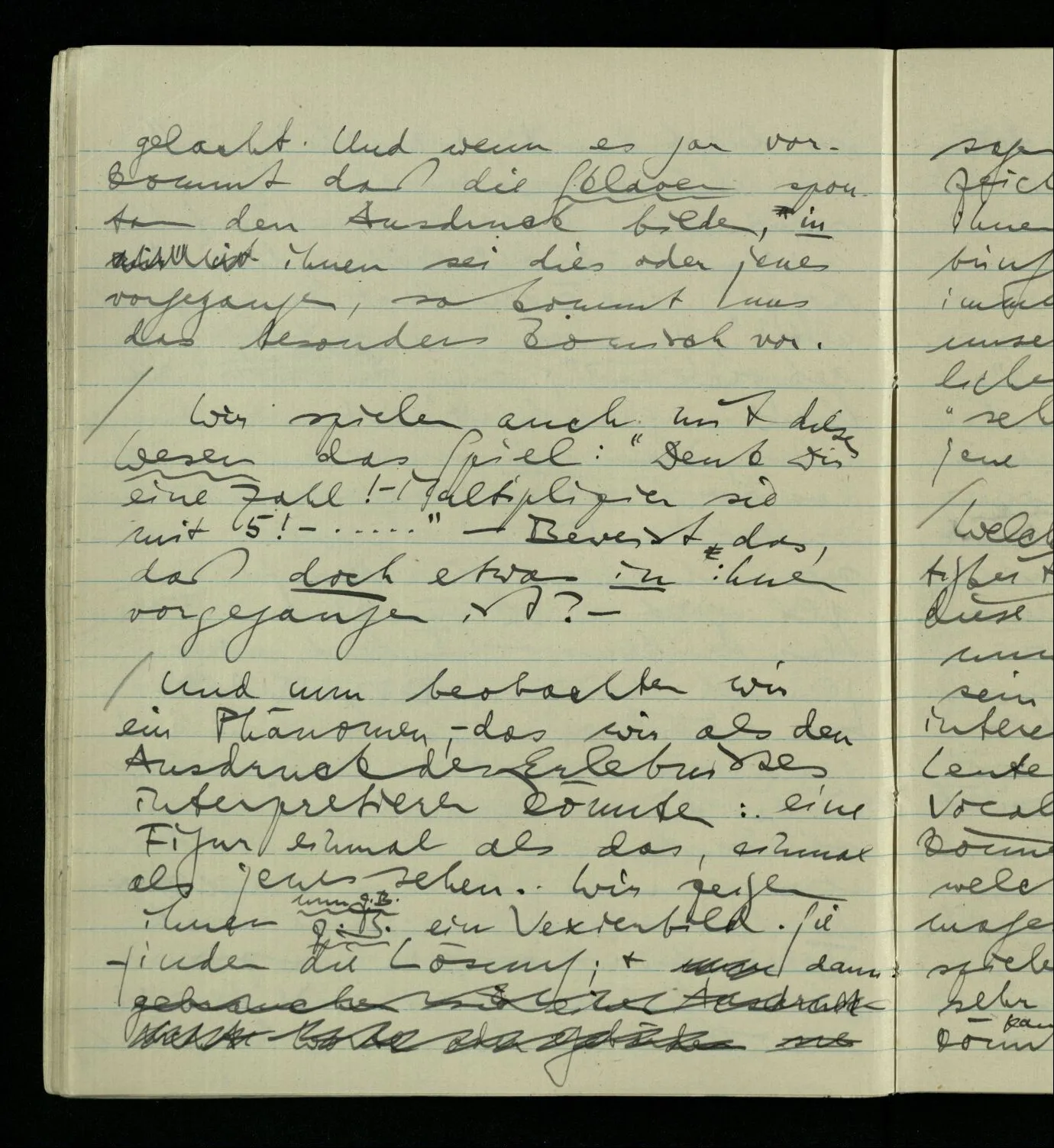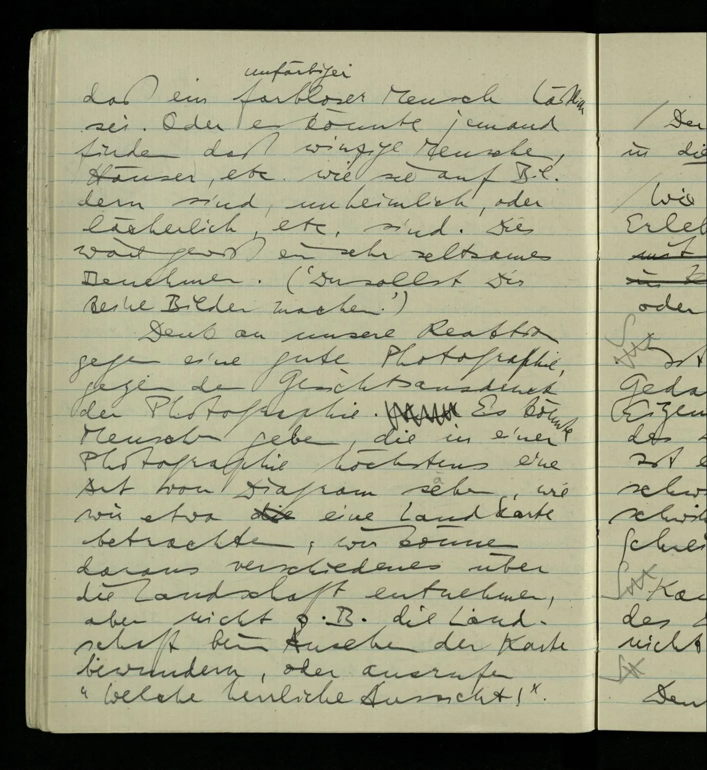 Niemand kümmert sich darum, ob etwas, noch darum, was in mir vorgeht, wenn man zu mir spricht. Man fragt auch für gewöhnlich nicht, wann ich den Satz verstanden habe, & ich merke auch nicht daß es damit einmal so, einmal so beschaffen ist. Außer, wenn ich einmal einen mißverstehe oder dergleichen. Und dann kann die Frage “Wann fingst Du an, ihn zu verstehen” Wichtigkeit erhalten. Aber es ist nun, als ob erst in so einem Falle überhaupt von wichtigen Erlebnissen des Verstehens die Rede wäre. Und könnte man sagen: nur das Erlebnis beim Wechsel der Bedeutungen sei von Wichtigkeit? – Oder auch so: nur das sei das wichtige Erlebnis, das einen gleichzeitigen Ausdruck hat?