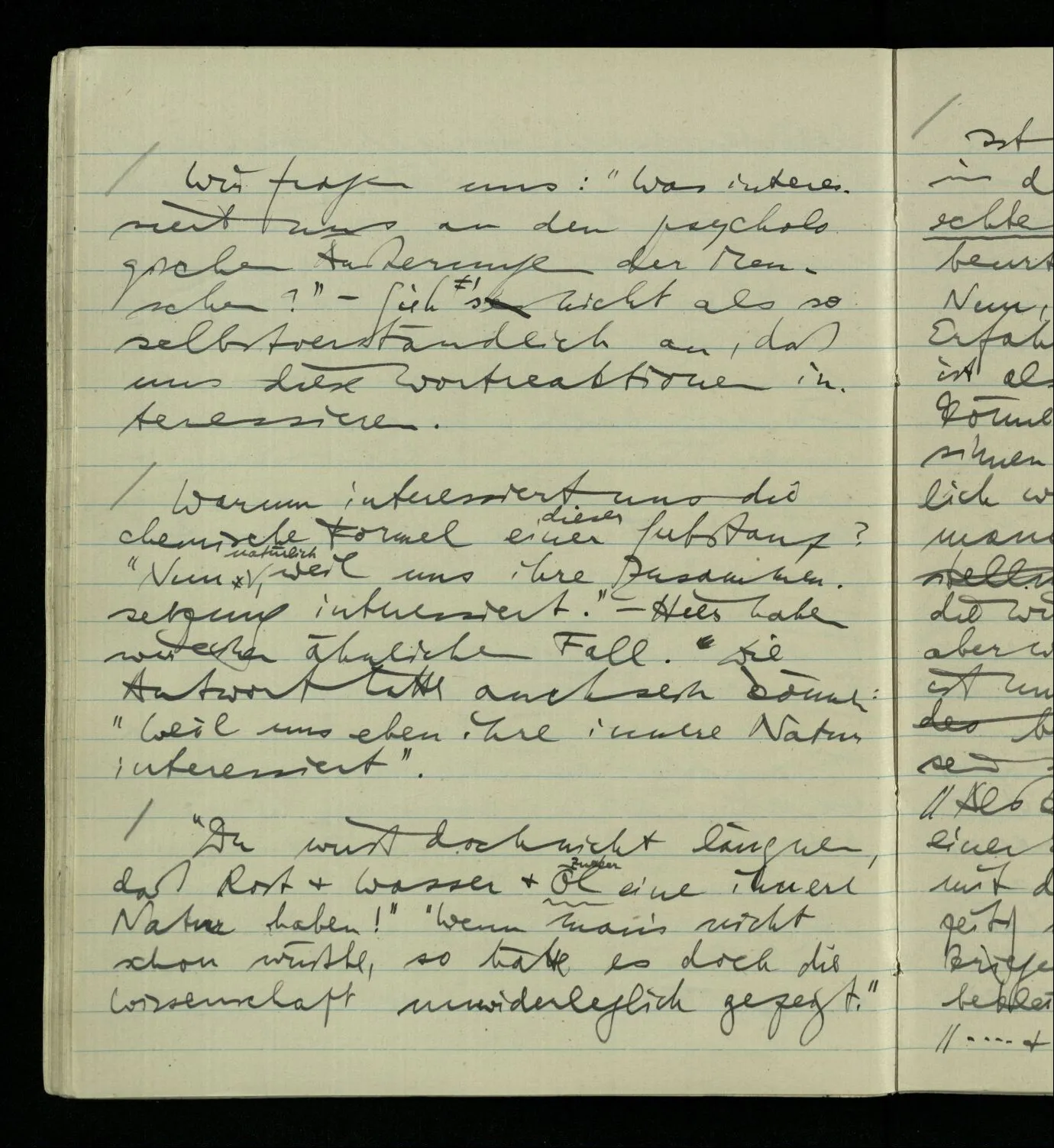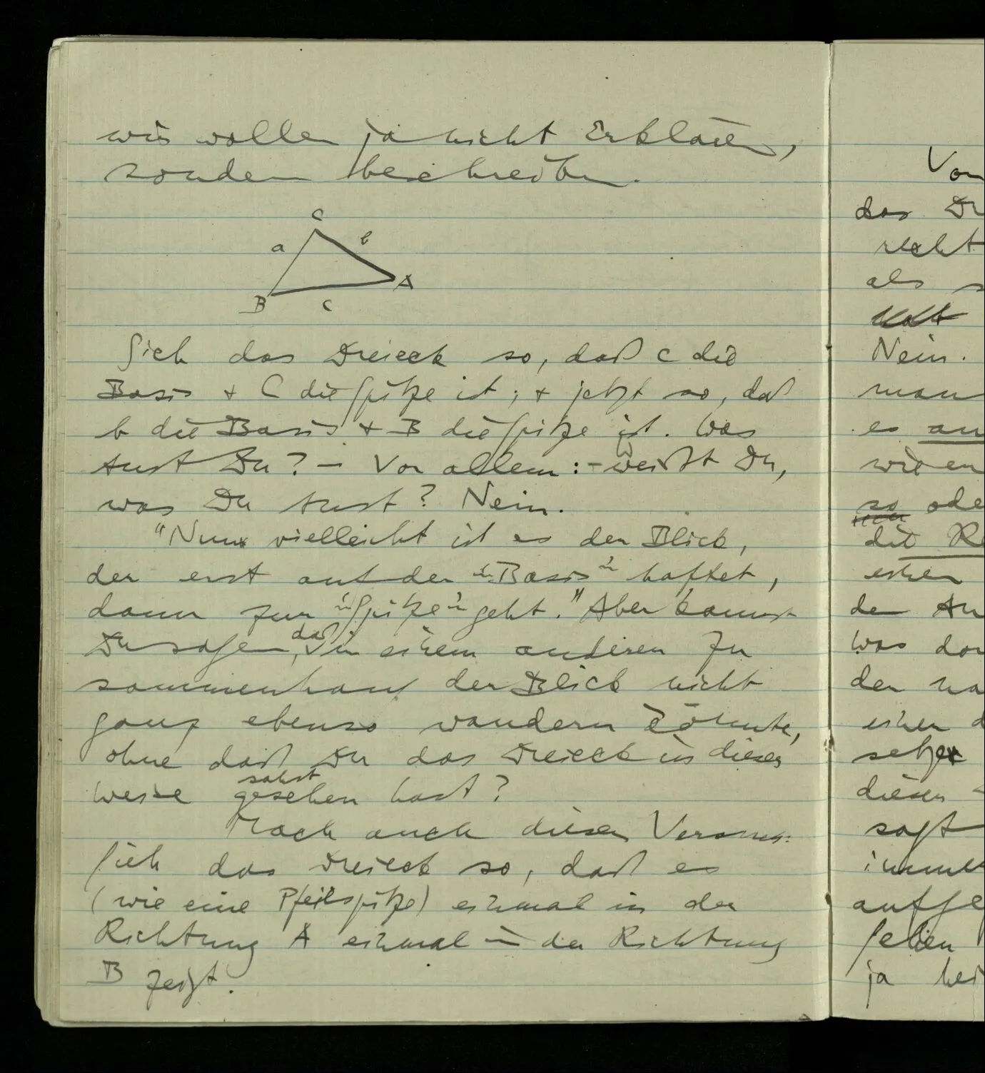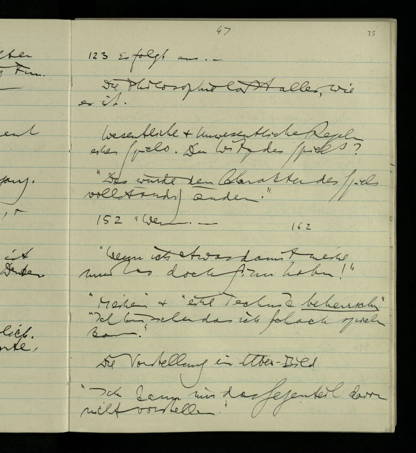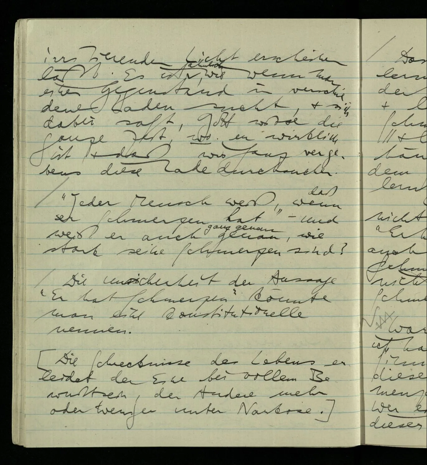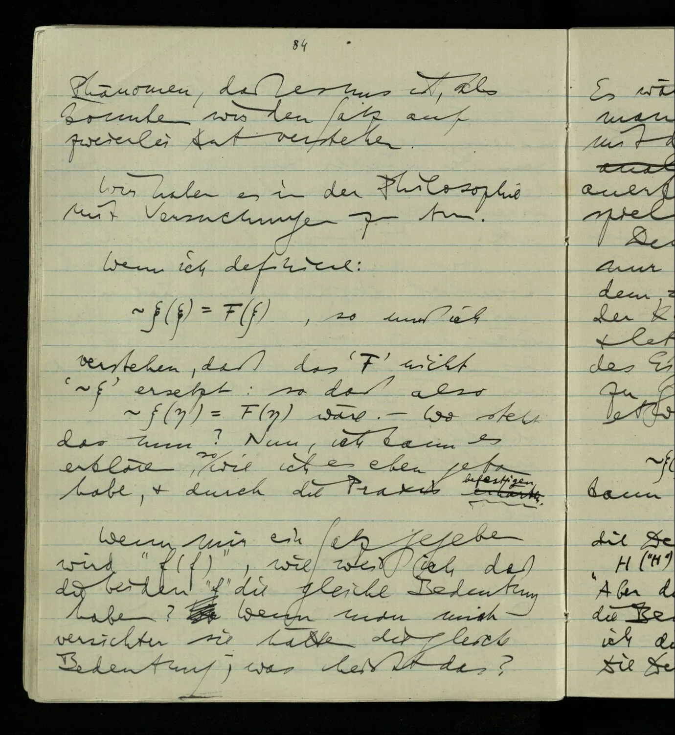 Niemand kümmert sich darum, ob etwas, noch darum, was in mir vorgeht, wenn man zu mir spricht. Man fragt auch für gewöhnlich nicht, wann ich den Satz verstanden habe, & ich merke auch nicht daß es damit einmal so, einmal so beschaffen ist. Außer, wenn ich einmal einen mißverstehe oder dergleichen. Und dann kann die Frage “Wann fingst Du an, ihn zu verstehen” Wichtigkeit erhalten. Aber es ist nun, als ob erst in so einem Falle überhaupt von wichtigen Erlebnissen des Verstehens die Rede wäre. Und könnte man sagen: nur das Erlebnis beim Wechsel der Bedeutungen sei von Wichtigkeit? – Oder auch so: nur das sei das wichtige Erlebnis, das einen gleichzeitigen Ausdruck hat?