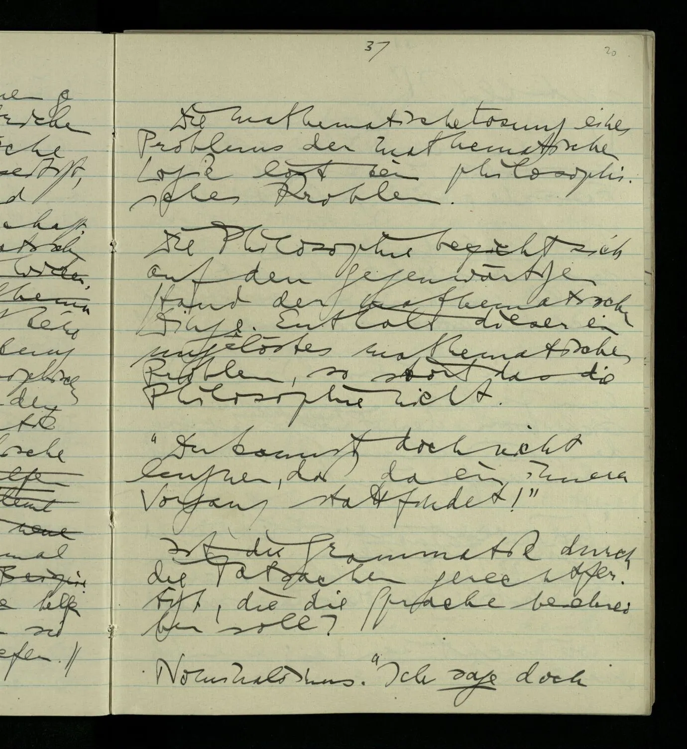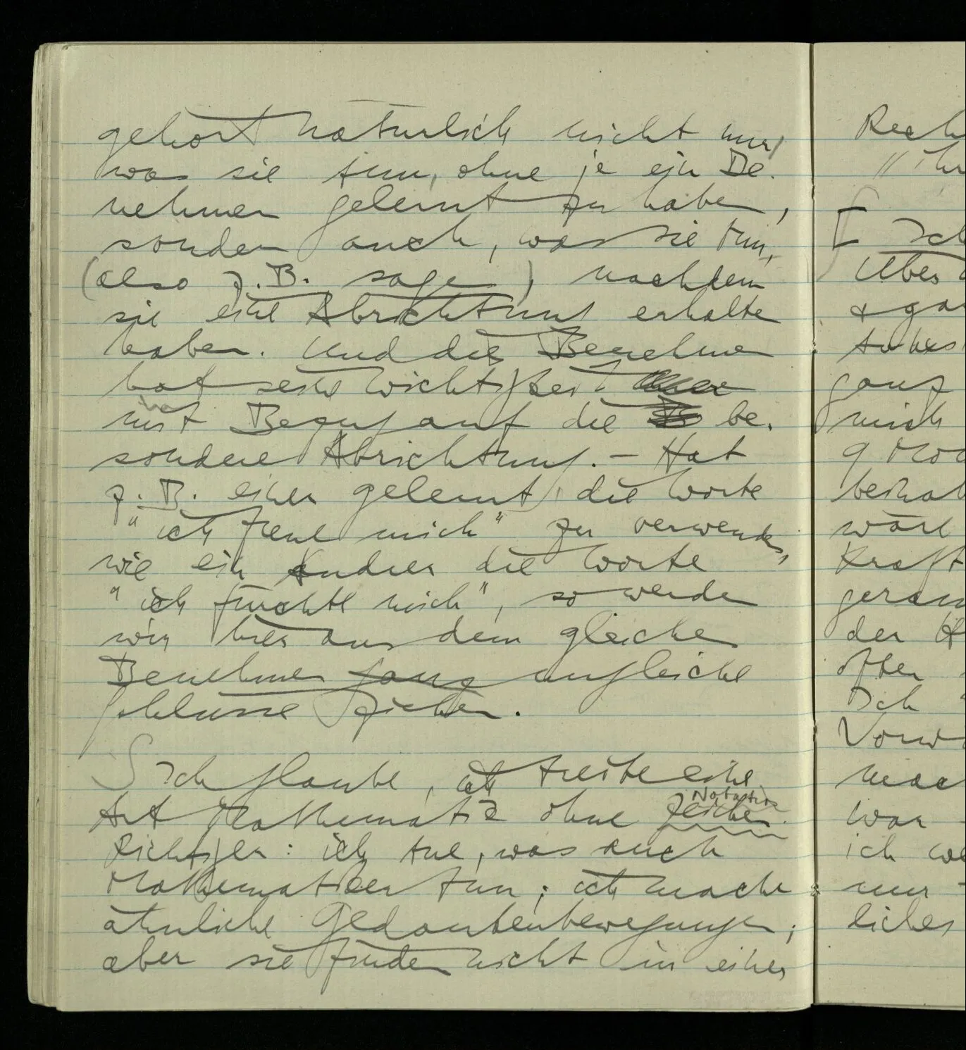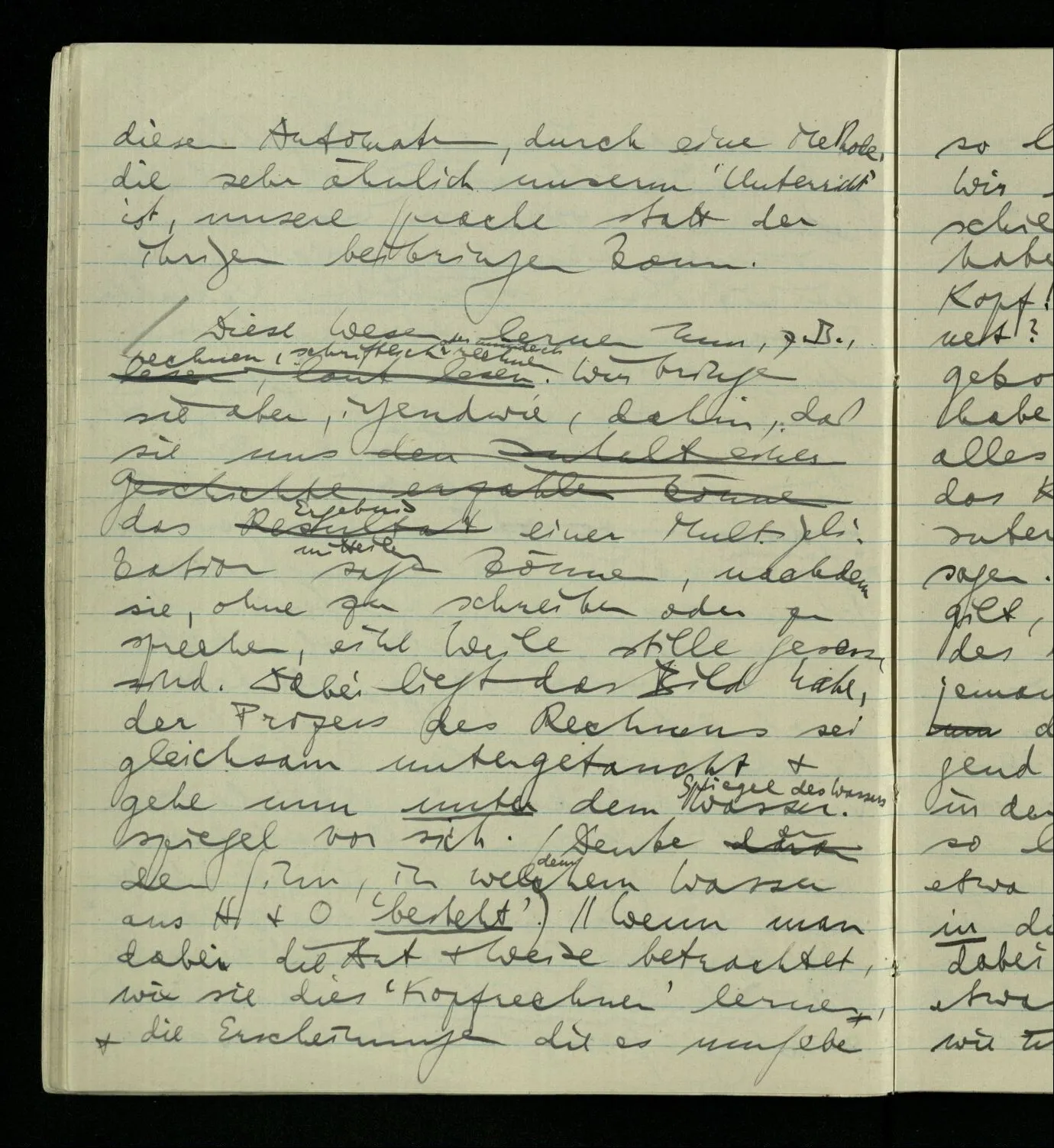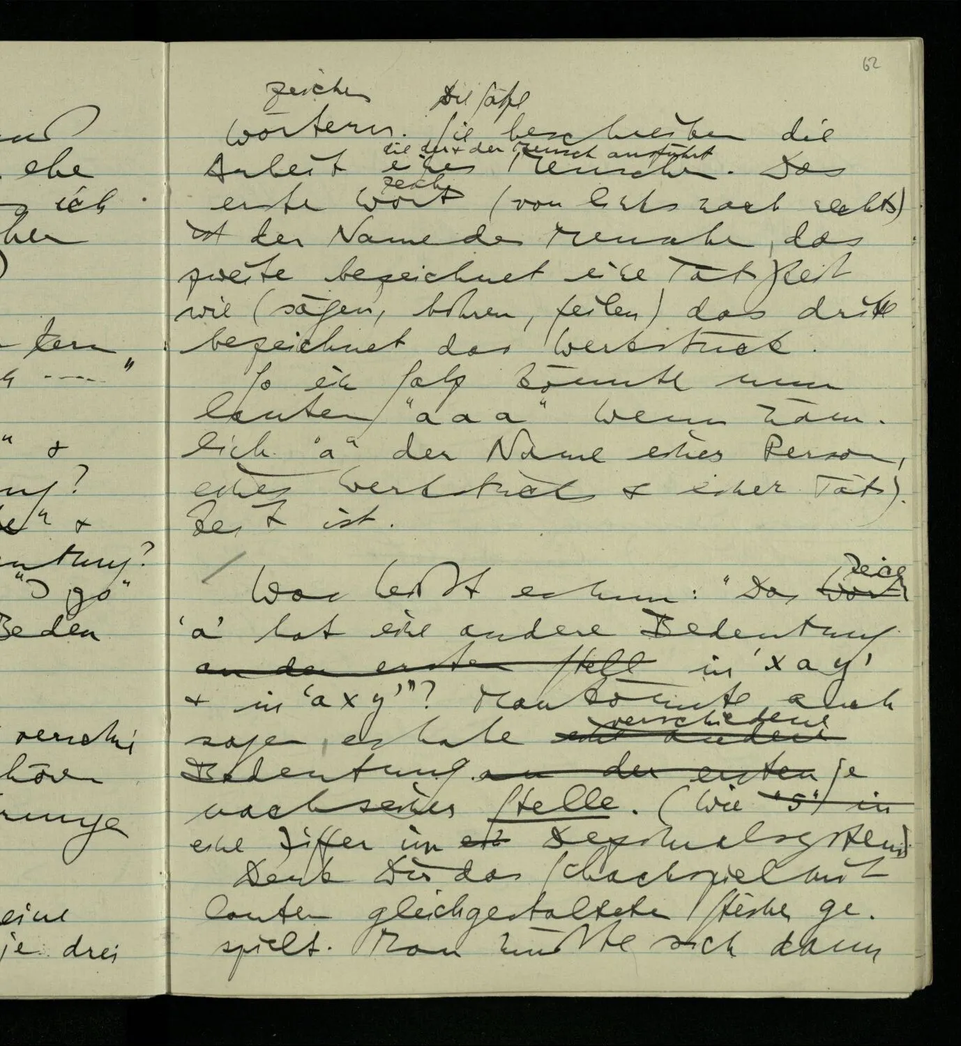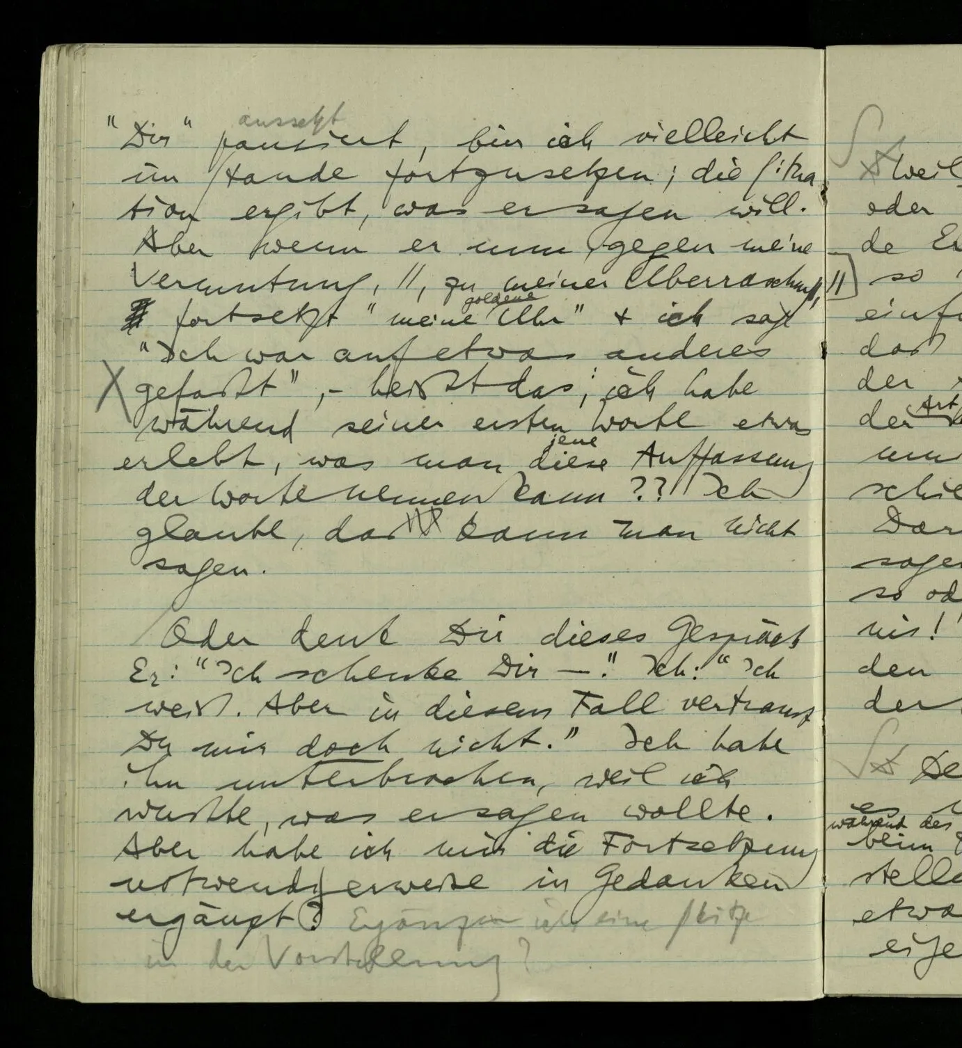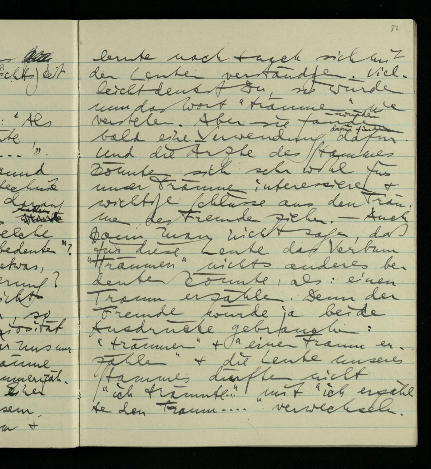 Niemand kümmert sich darum, ob etwas, noch darum, was in mir vorgeht, wenn man zu mir spricht. Man fragt auch für gewöhnlich nicht, wann ich den Satz verstanden habe, & ich merke auch nicht daß es damit einmal so, einmal so beschaffen ist. Außer, wenn ich einmal einen mißverstehe oder dergleichen. Und dann kann die Frage “Wann fingst Du an, ihn zu verstehen” Wichtigkeit erhalten. Aber es ist nun, als ob erst in so einem Falle überhaupt von wichtigen Erlebnissen des Verstehens die Rede wäre. Und könnte man sagen: nur das Erlebnis beim Wechsel der Bedeutungen sei von Wichtigkeit? – Oder auch so: nur das sei das wichtige Erlebnis, das einen gleichzeitigen Ausdruck hat?