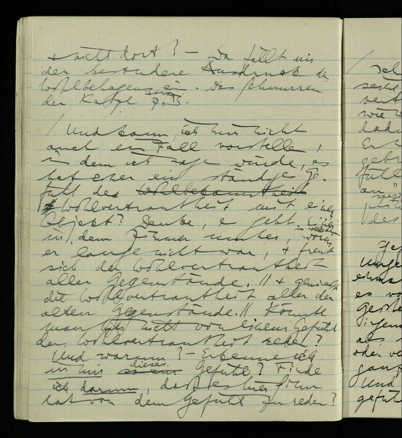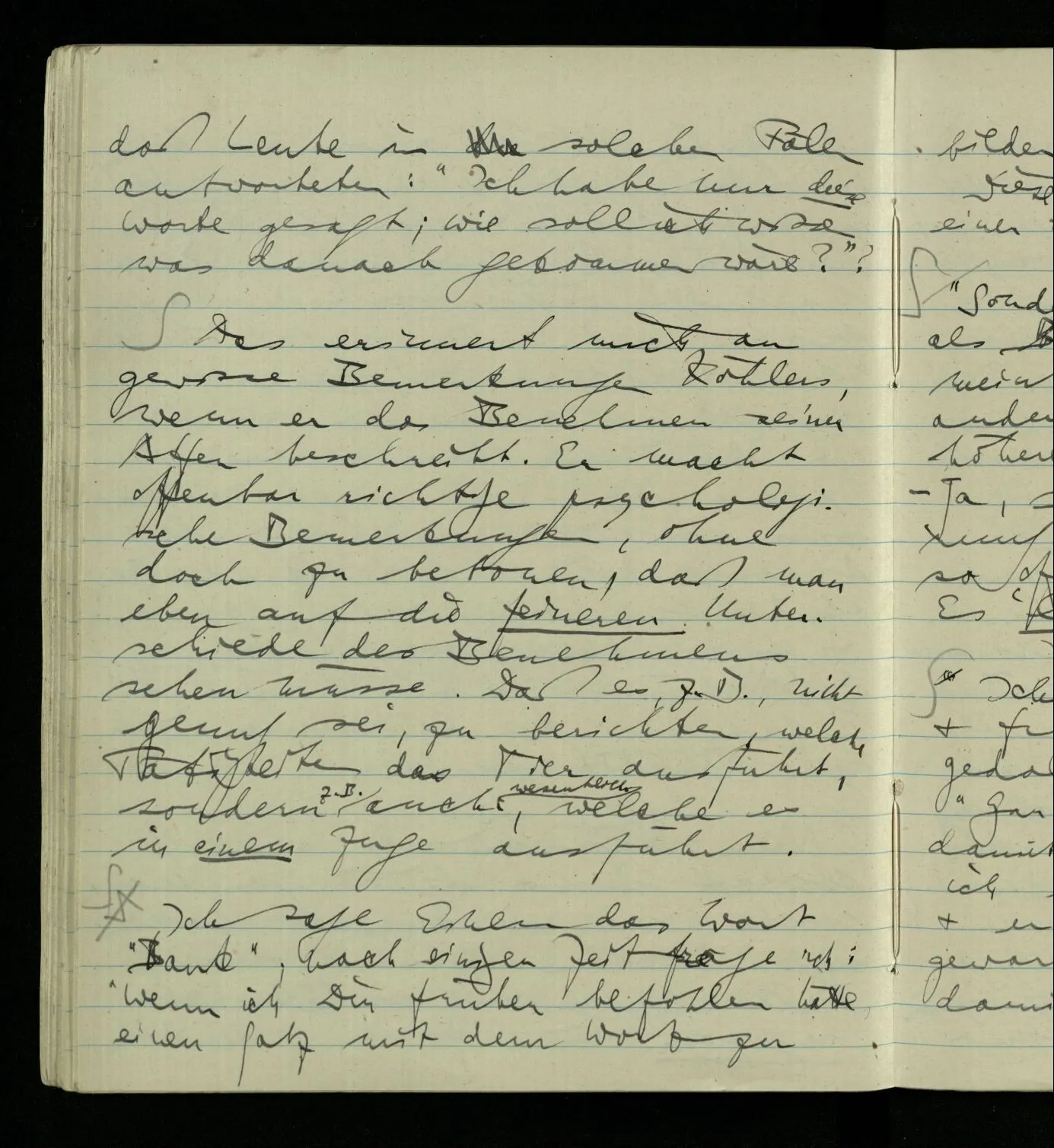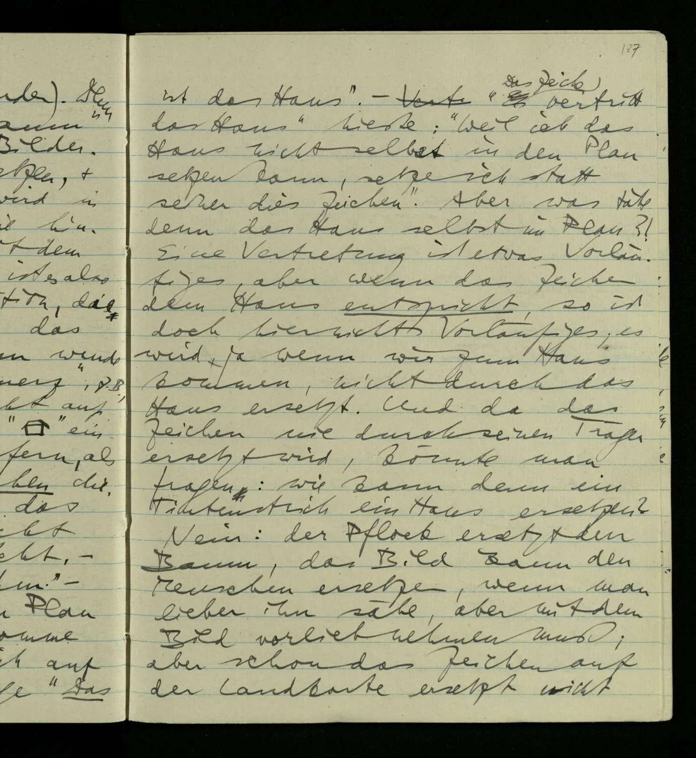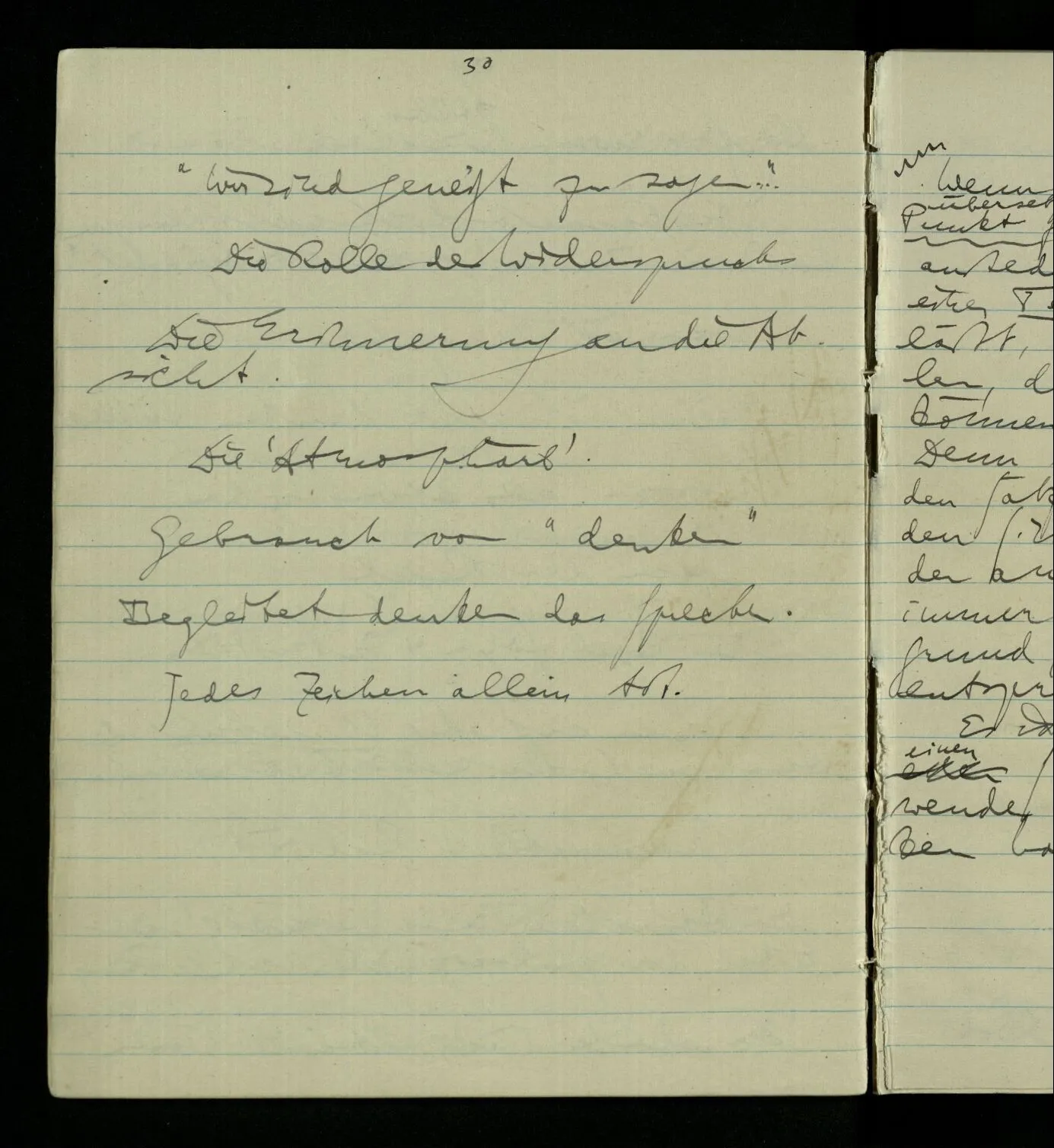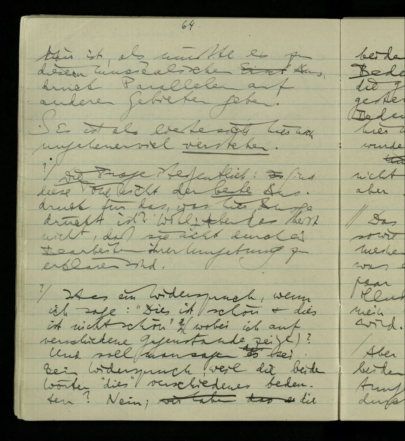 Niemand kümmert sich darum, ob etwas, noch darum, was in mir vorgeht, wenn man zu mir spricht. Man fragt auch für gewöhnlich nicht, wann ich den Satz verstanden habe, & ich merke auch nicht daß es damit einmal so, einmal so beschaffen ist. Außer, wenn ich einmal einen mißverstehe oder dergleichen. Und dann kann die Frage “Wann fingst Du an, ihn zu verstehen” Wichtigkeit erhalten. Aber es ist nun, als ob erst in so einem Falle überhaupt von wichtigen Erlebnissen des Verstehens die Rede wäre. Und könnte man sagen: nur das Erlebnis beim Wechsel der Bedeutungen sei von Wichtigkeit? – Oder auch so: nur das sei das wichtige Erlebnis, das einen gleichzeitigen Ausdruck hat?