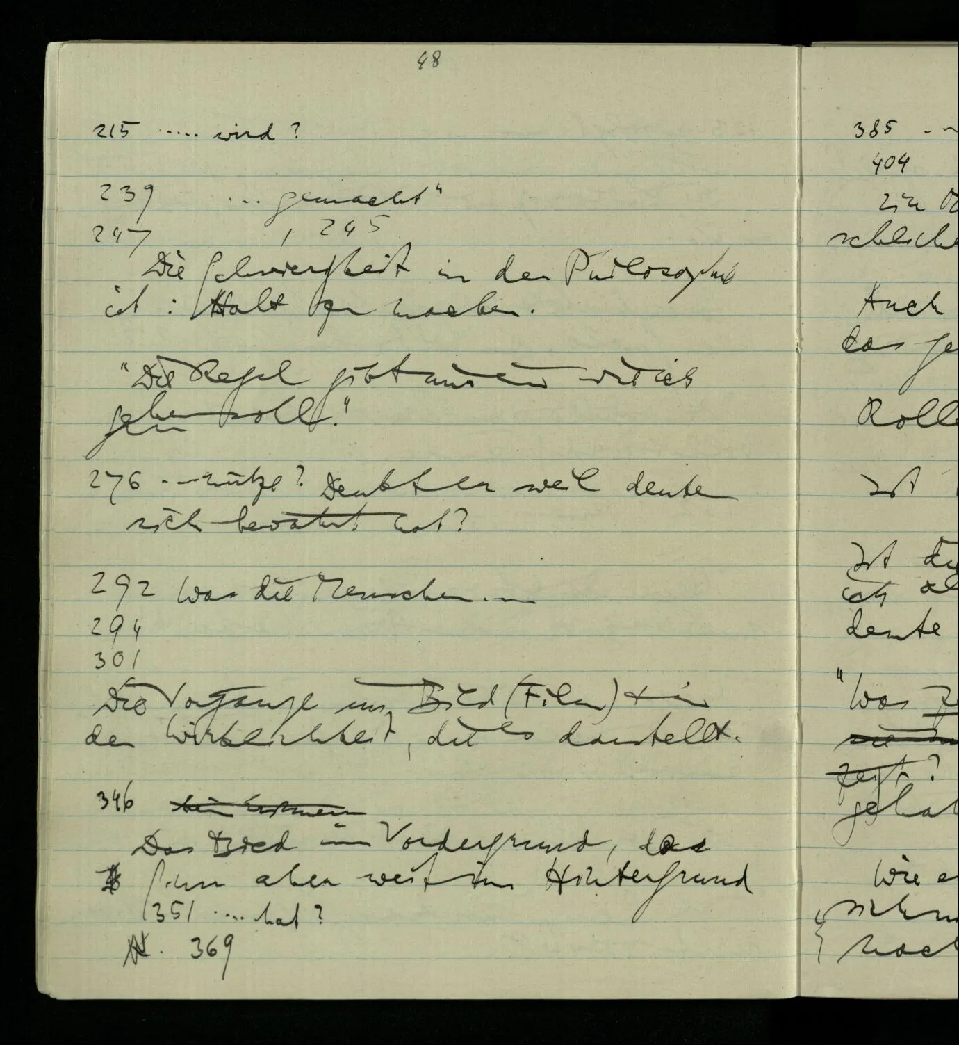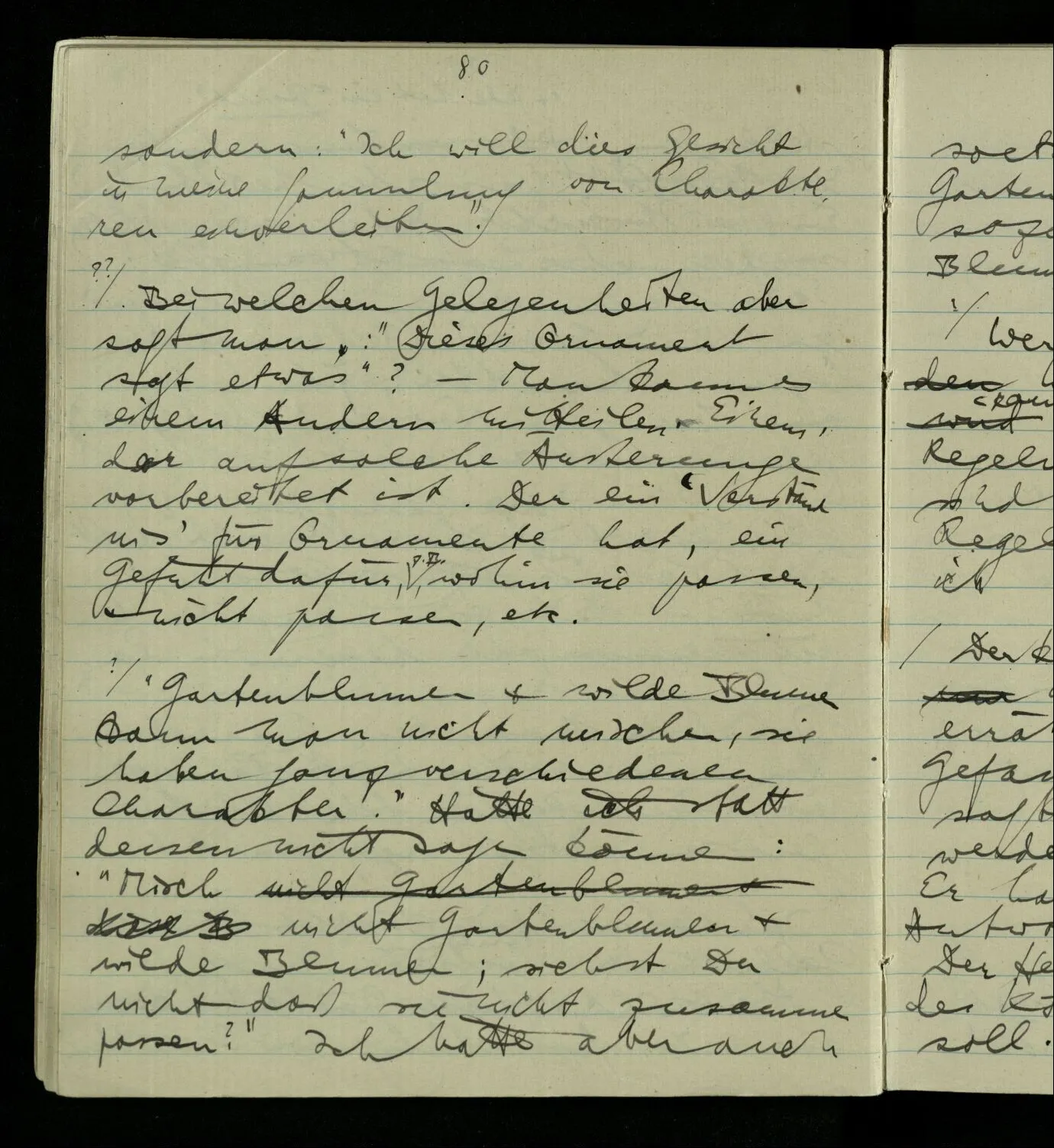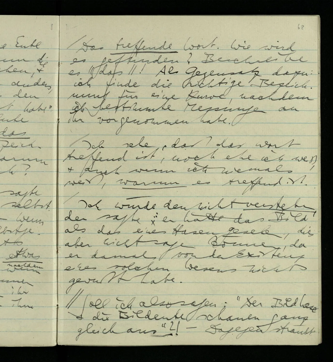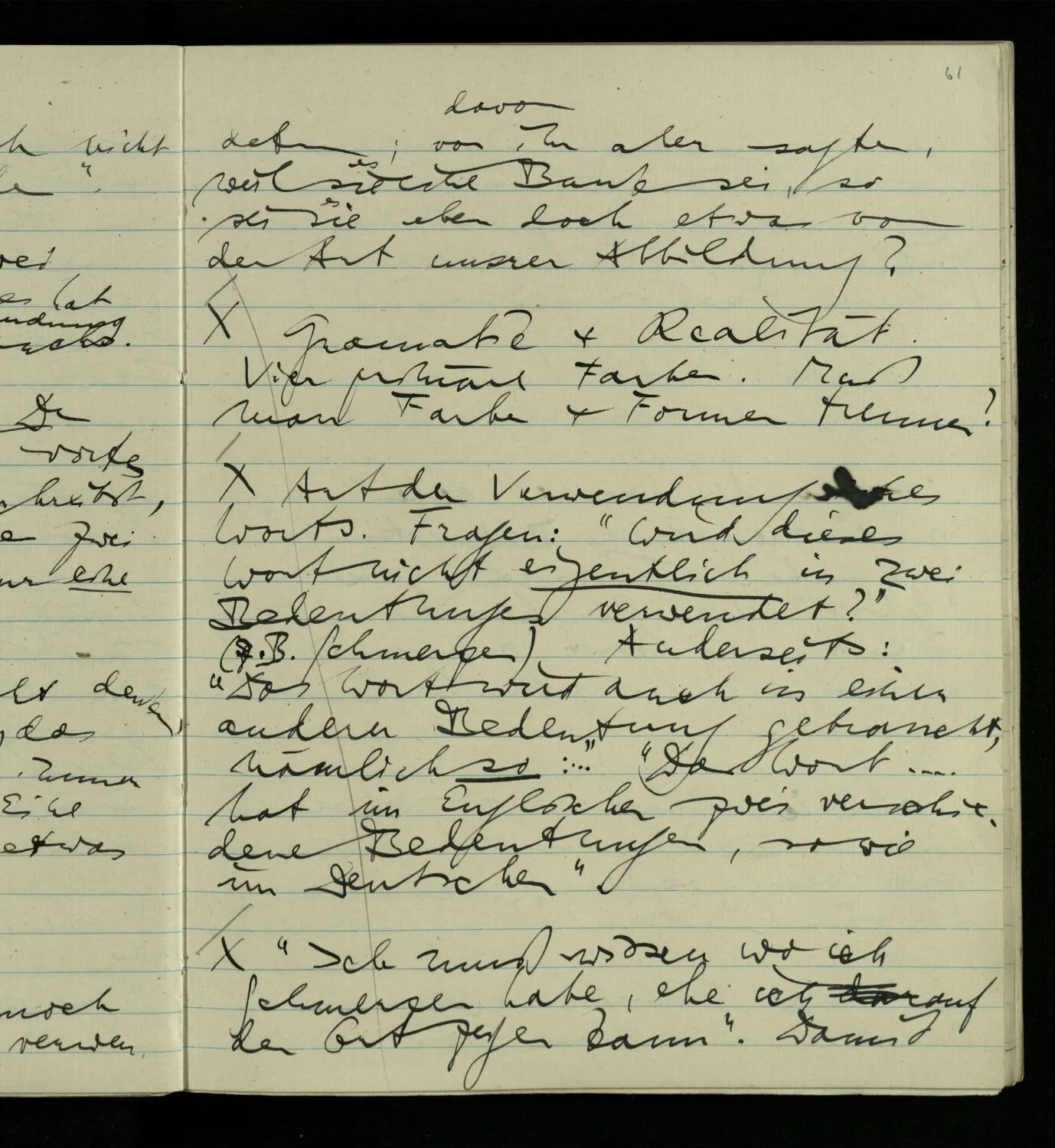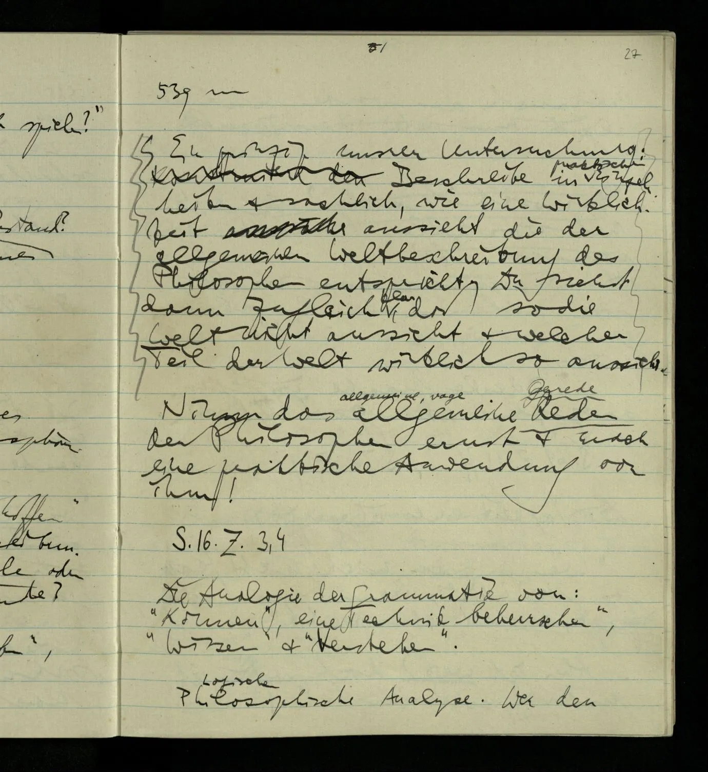 Niemand kümmert sich darum, ob etwas, noch darum, was in mir vorgeht, wenn man zu mir spricht. Man fragt auch für gewöhnlich nicht, wann ich den Satz verstanden habe, & ich merke auch nicht daß es damit einmal so, einmal so beschaffen ist. Außer, wenn ich einmal einen mißverstehe oder dergleichen. Und dann kann die Frage “Wann fingst Du an, ihn zu verstehen” Wichtigkeit erhalten. Aber es ist nun, als ob erst in so einem Falle überhaupt von wichtigen Erlebnissen des Verstehens die Rede wäre. Und könnte man sagen: nur das Erlebnis beim Wechsel der Bedeutungen sei von Wichtigkeit? – Oder auch so: nur das sei das wichtige Erlebnis, das einen gleichzeitigen Ausdruck hat?