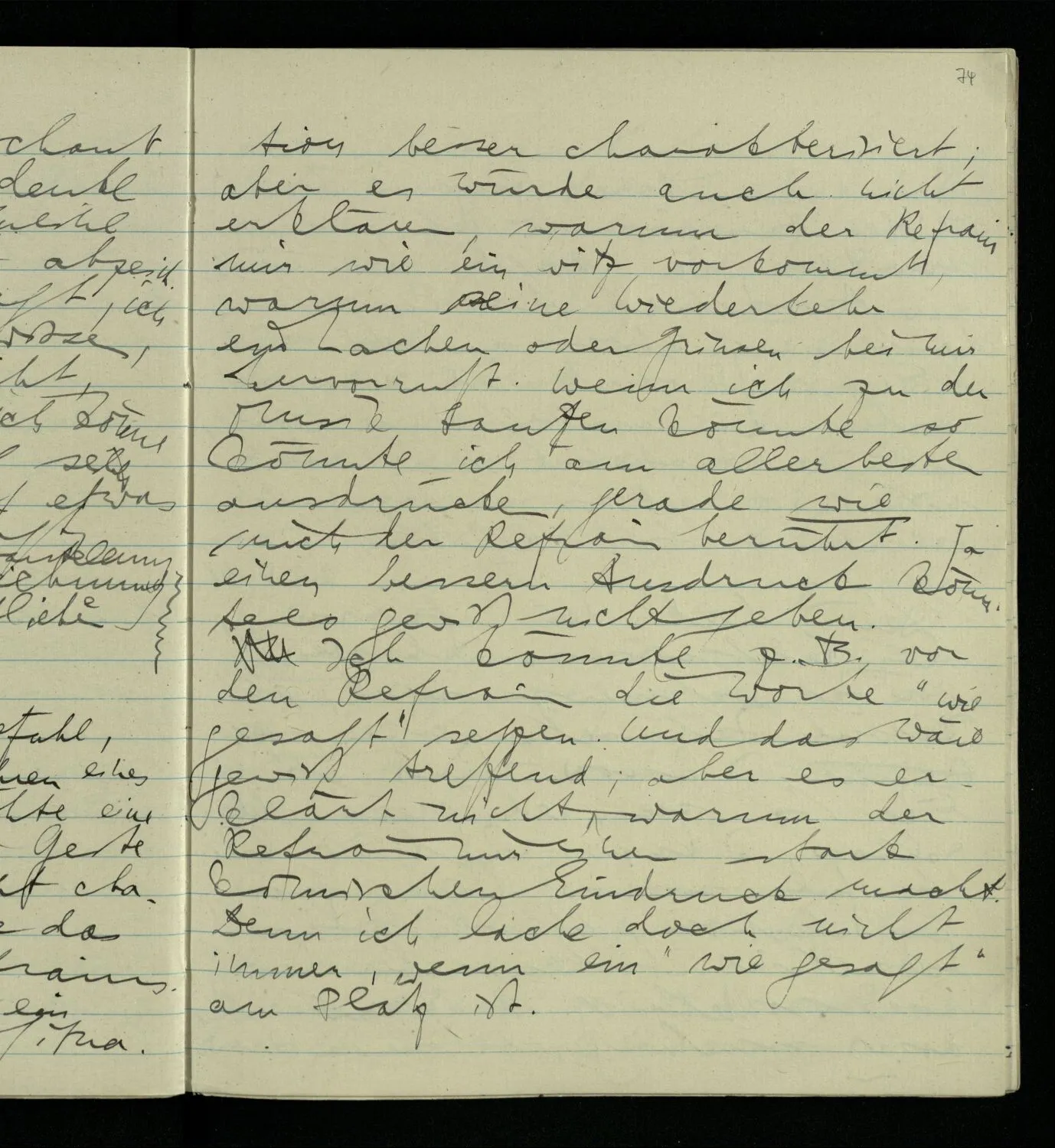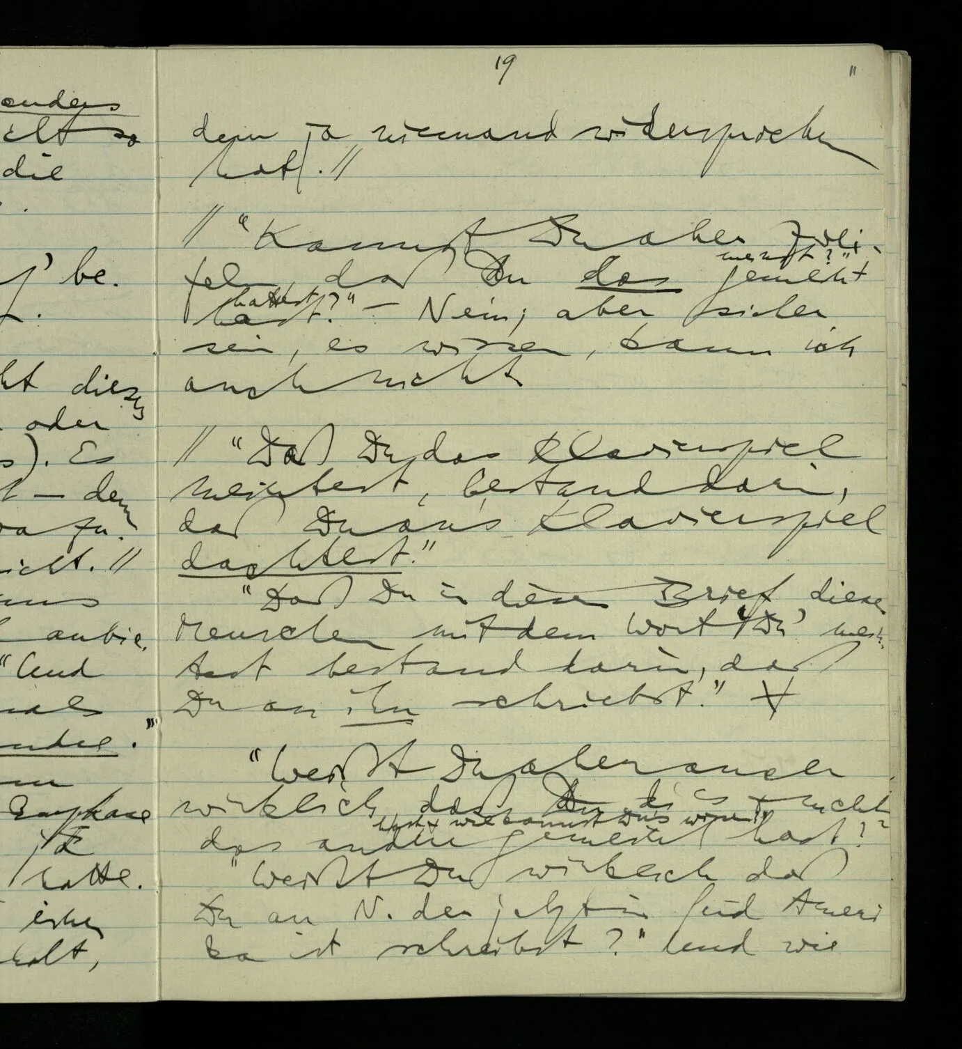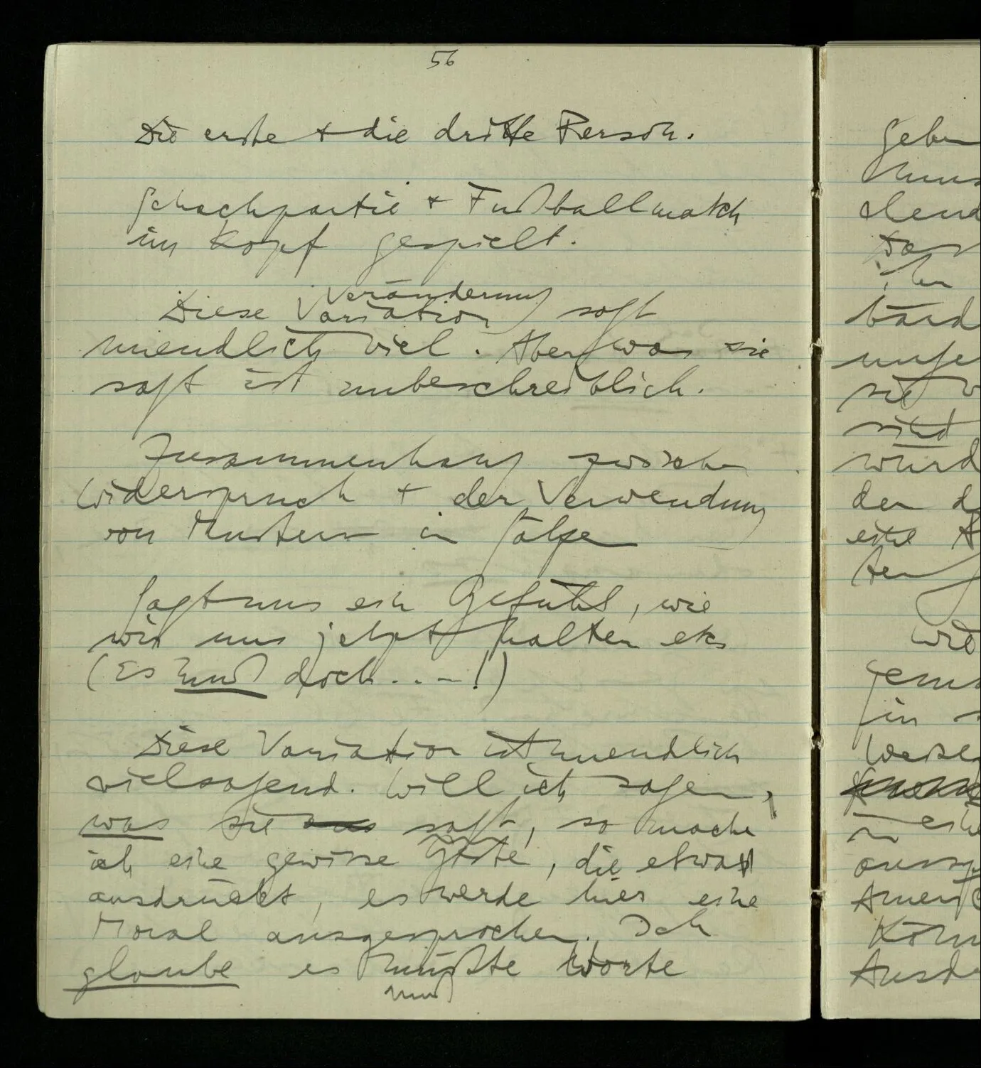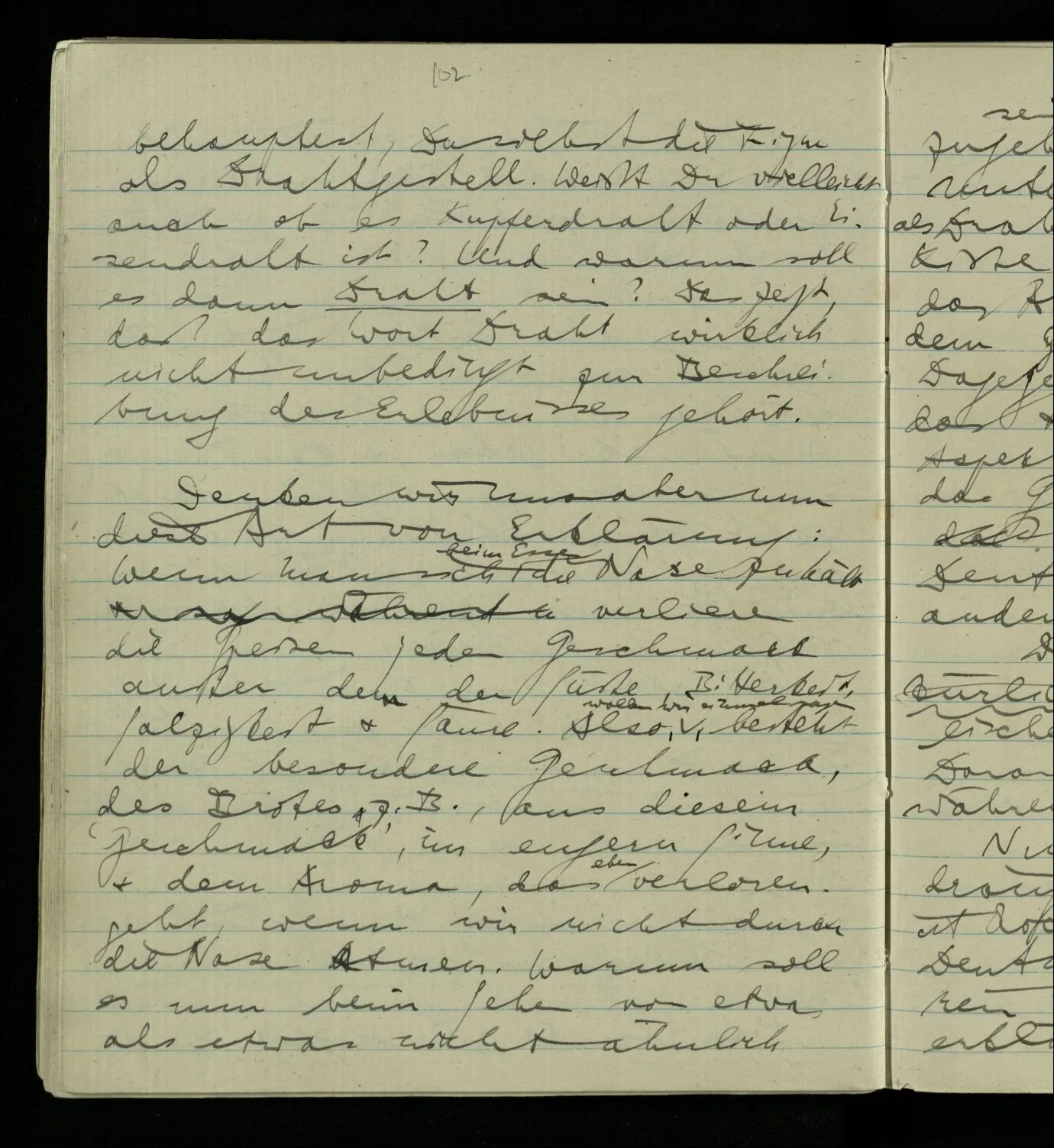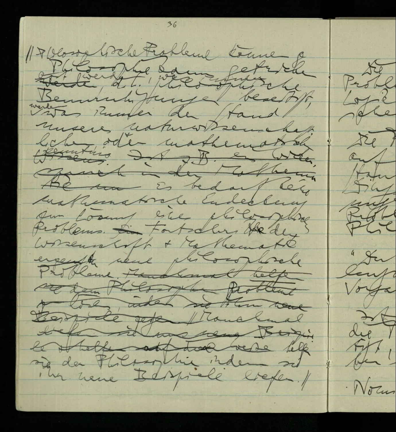 Niemand kümmert sich darum, ob etwas, noch darum, was in mir vorgeht, wenn man zu mir spricht. Man fragt auch für gewöhnlich nicht, wann ich den Satz verstanden habe, & ich merke auch nicht daß es damit einmal so, einmal so beschaffen ist. Außer, wenn ich einmal einen mißverstehe oder dergleichen. Und dann kann die Frage “Wann fingst Du an, ihn zu verstehen” Wichtigkeit erhalten. Aber es ist nun, als ob erst in so einem Falle überhaupt von wichtigen Erlebnissen des Verstehens die Rede wäre. Und könnte man sagen: nur das Erlebnis beim Wechsel der Bedeutungen sei von Wichtigkeit? – Oder auch so: nur das sei das wichtige Erlebnis, das einen gleichzeitigen Ausdruck hat?