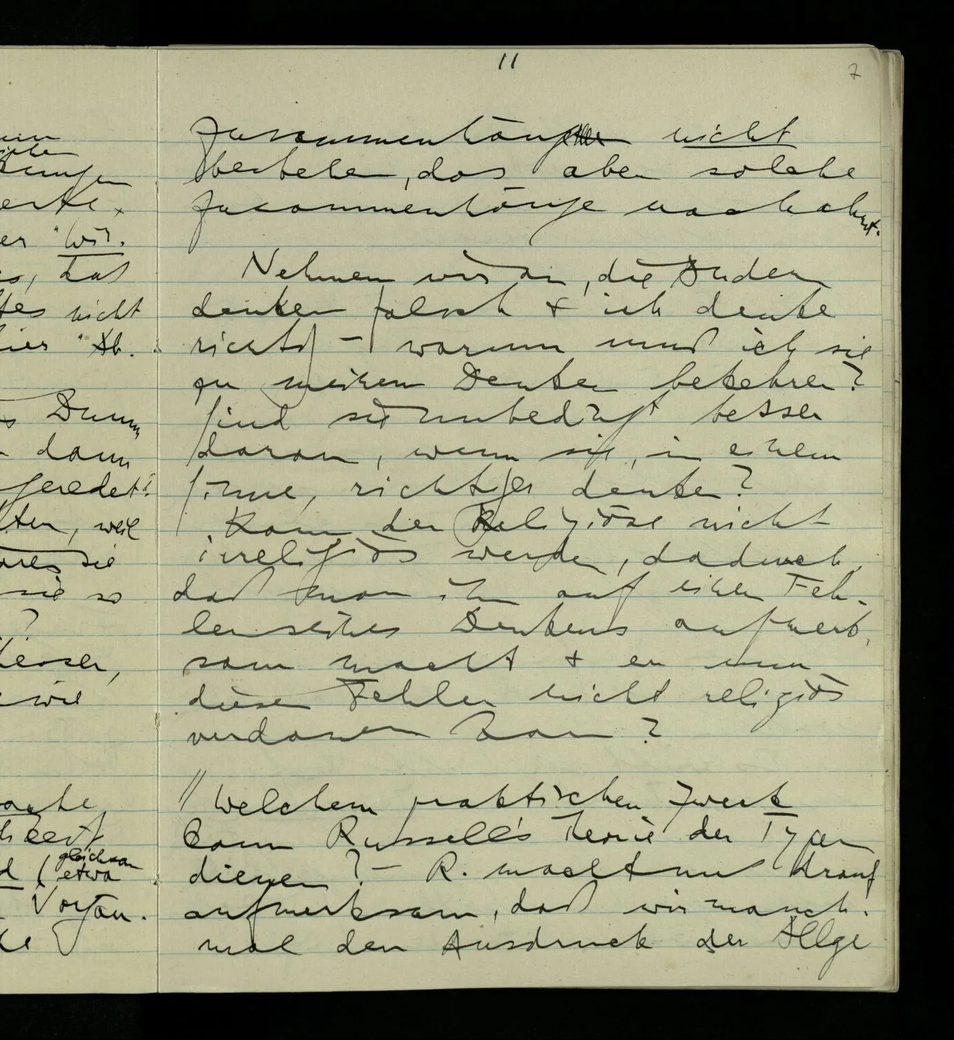 Nehmen wir an, die Andern denken falsch & ich denke richtig – warum muß ich sie zu meinem Denken bekehren? Sind sie unbedingt besser daran, wenn sie, in einem Sinne, richtiger denken? Kann der Religiöse nicht irreligiös werden, dadurch daß man ihn auf einen Fehler seines Denkens aufmerksam macht & er nun diesen Fehler nicht religiös verdauen kann?