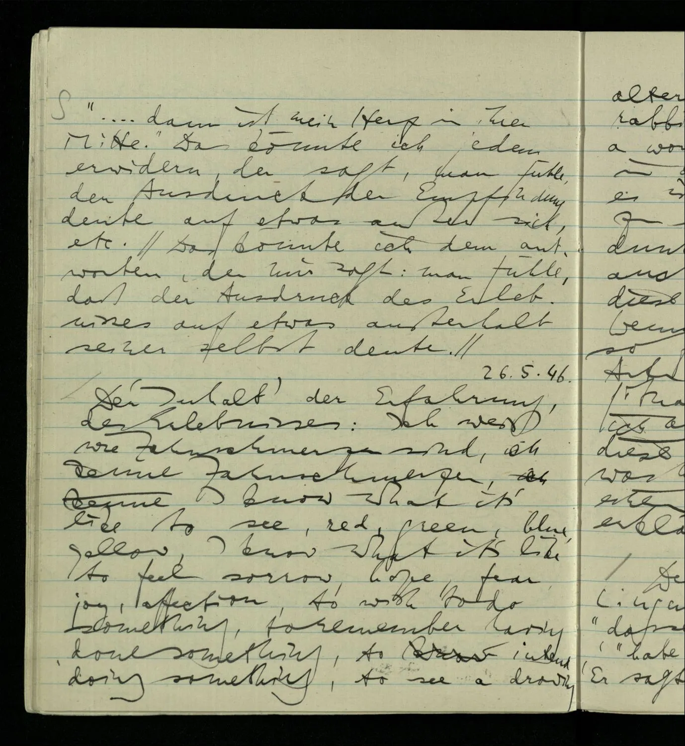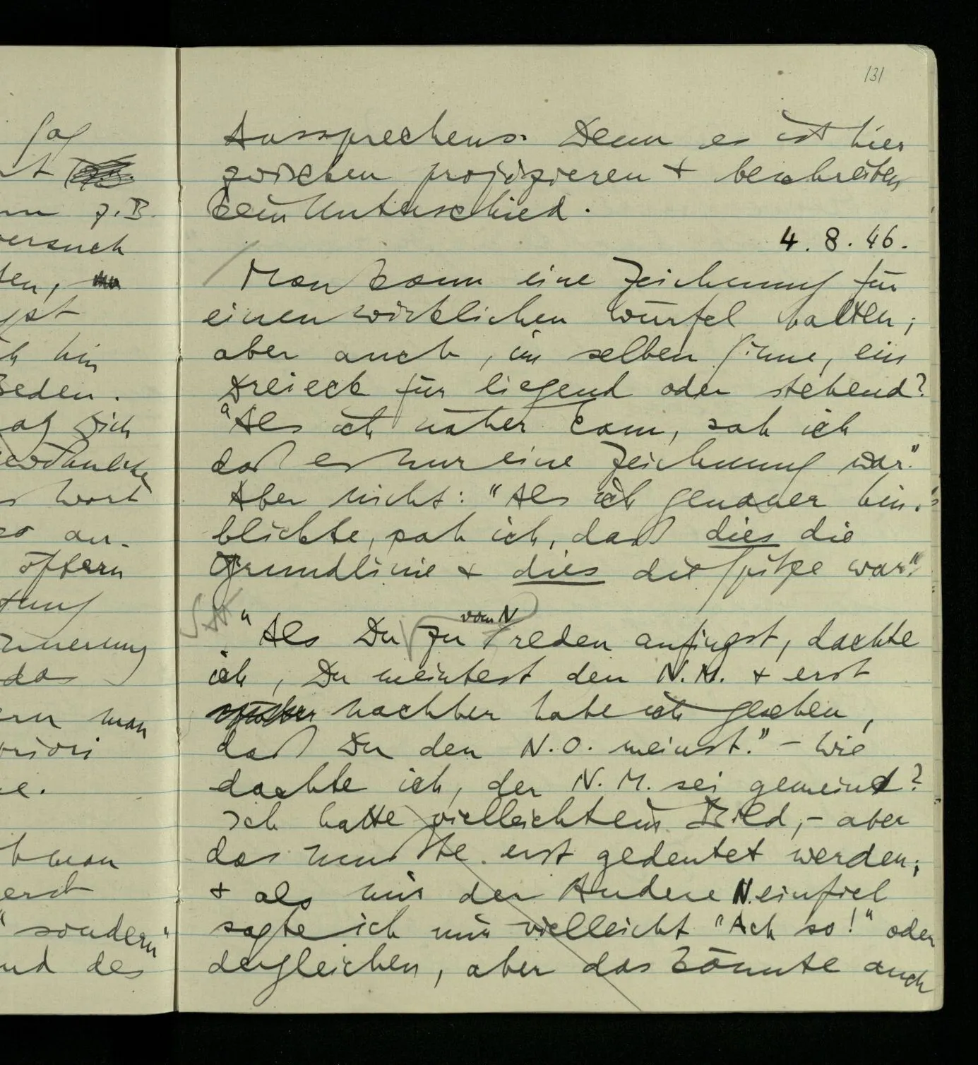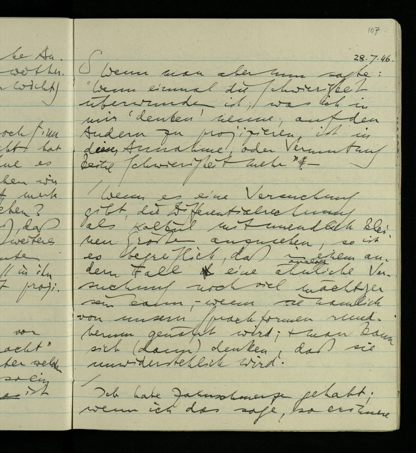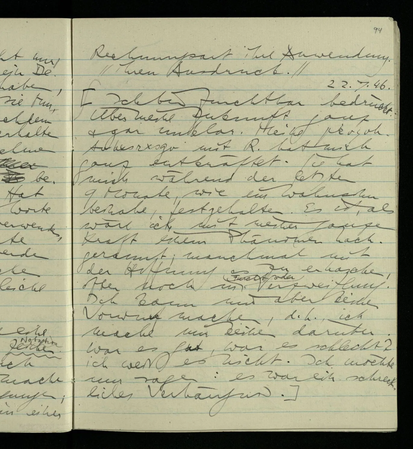 08.08.1946 Ich bin sehr traurig, sehr oft traurig. Ich fühle mich so, als sei das jetzt das Ende meines Lebens. Und doch ist es möglich daß mein Leben noch Jahrelang weitergeht; wie? weiß Gott. Das Eine was die Liebe zu B. für mich getan hat ist: sie hat die übrigen kleinlichen Sorgen, jene Stellung & Arbeit betreffend, in den Hintergrund gejagt; wenigstens auf kurze Zeit. Ich sehe manchmal, daß es wichtiger ist, zu leben, als die & die Stellung zu haben.