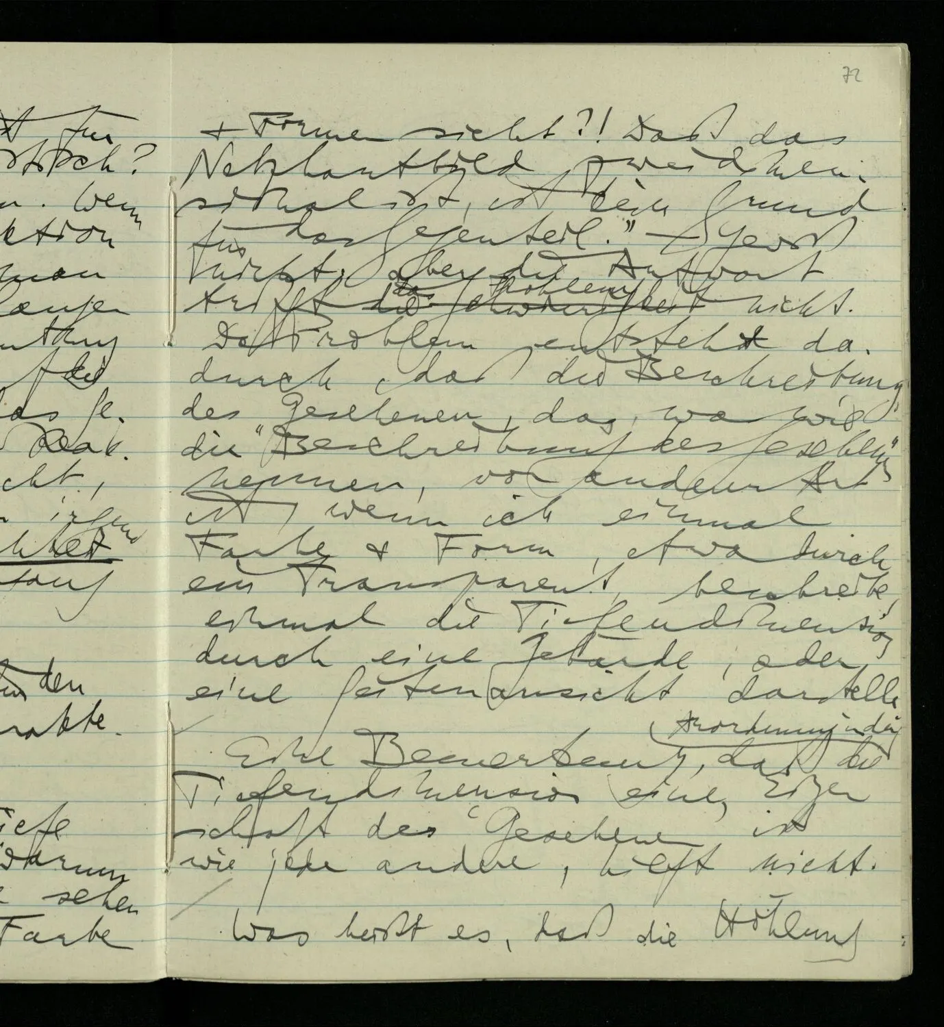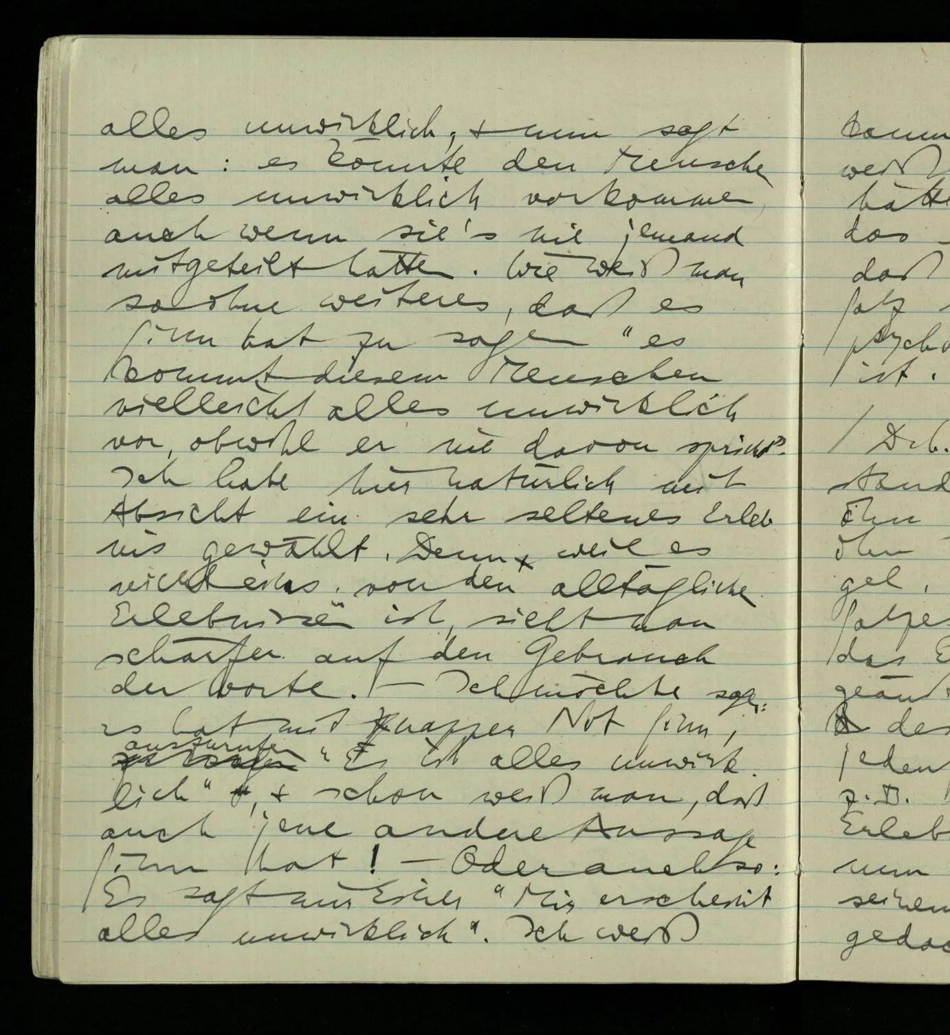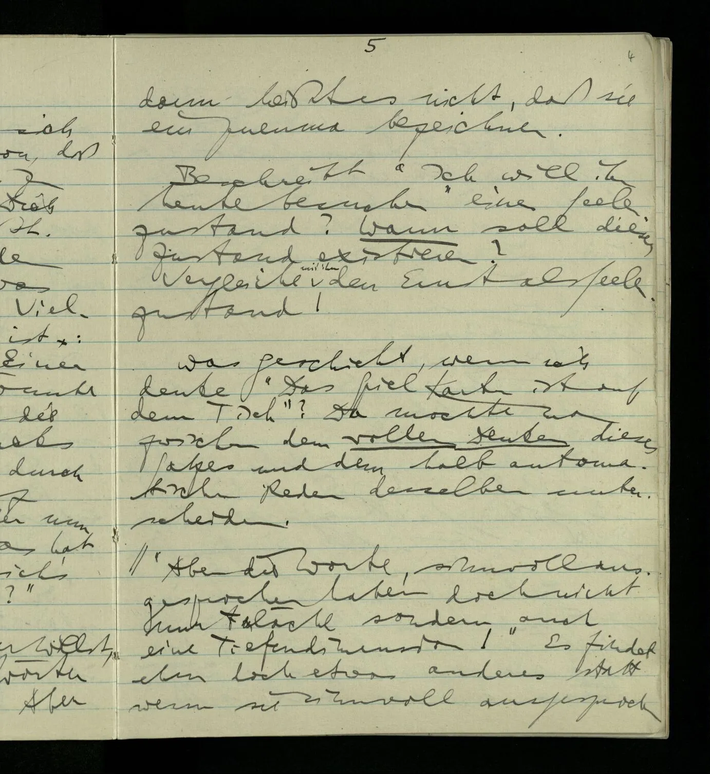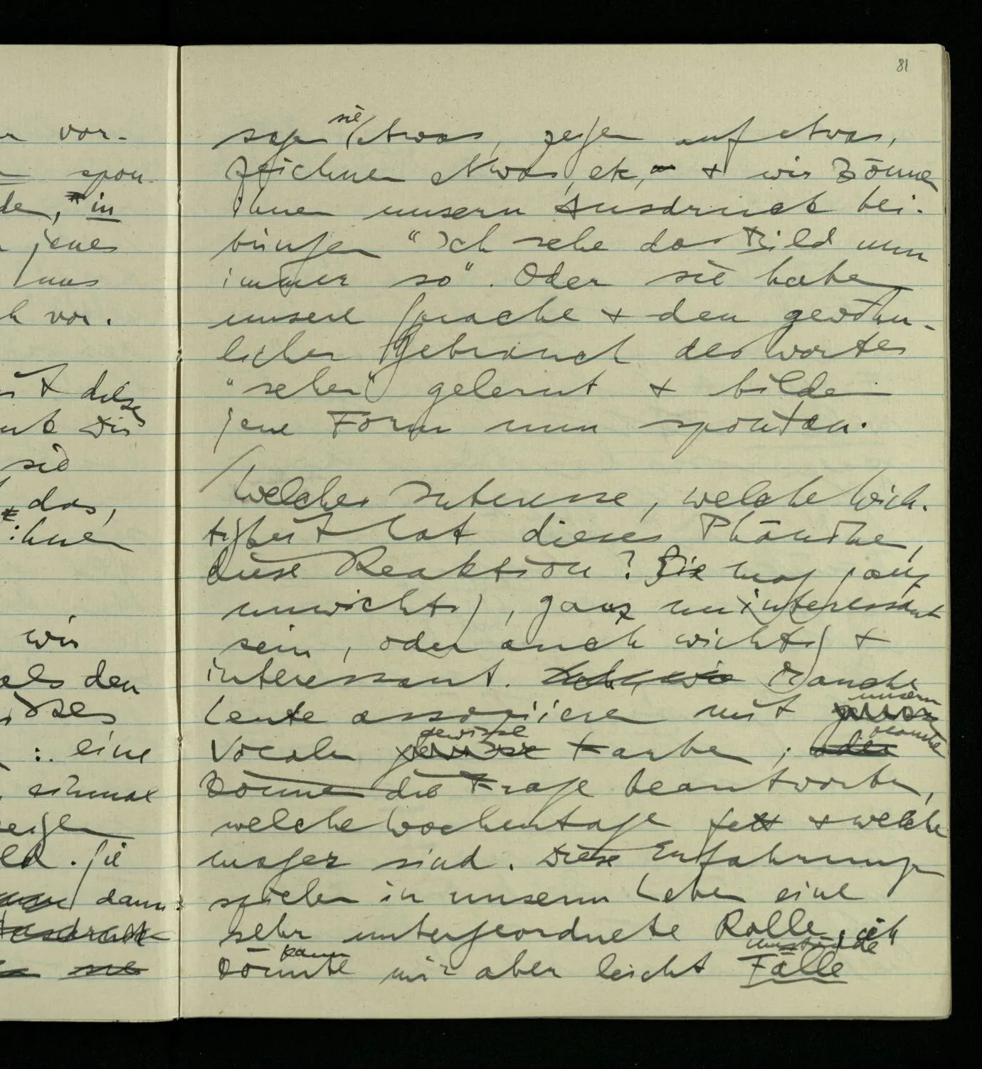 08.08.1946 Ich bin sehr traurig, sehr oft traurig. Ich fühle mich so, als sei das jetzt das Ende meines Lebens. Und doch ist es möglich daß mein Leben noch Jahrelang weitergeht; wie? weiß Gott. Das Eine was die Liebe zu B. für mich getan hat ist: sie hat die übrigen kleinlichen Sorgen, jene Stellung & Arbeit betreffend, in den Hintergrund gejagt; wenigstens auf kurze Zeit. Ich sehe manchmal, daß es wichtiger ist, zu leben, als die & die Stellung zu haben.