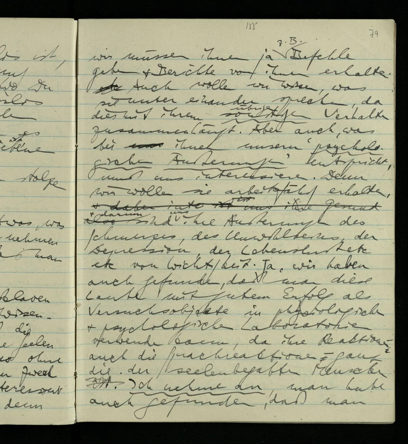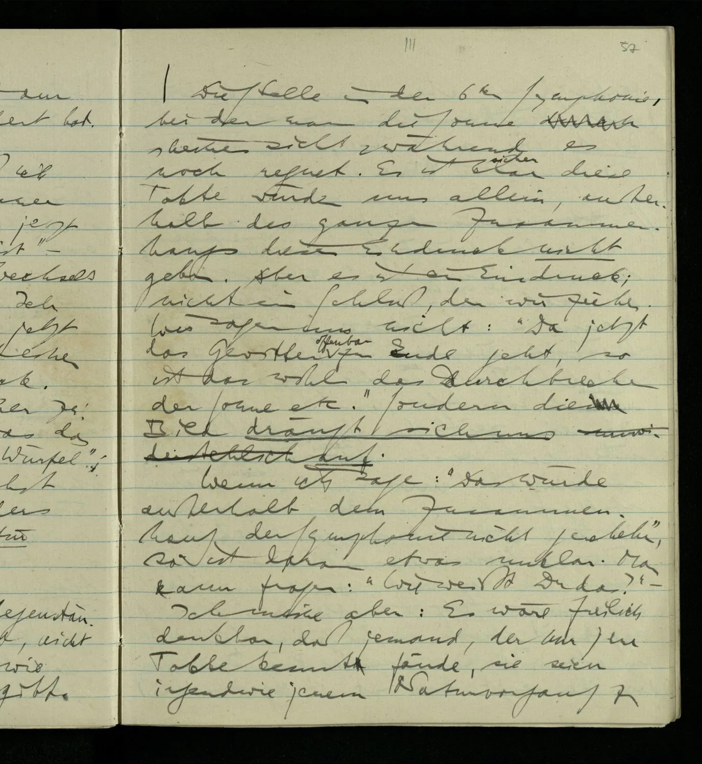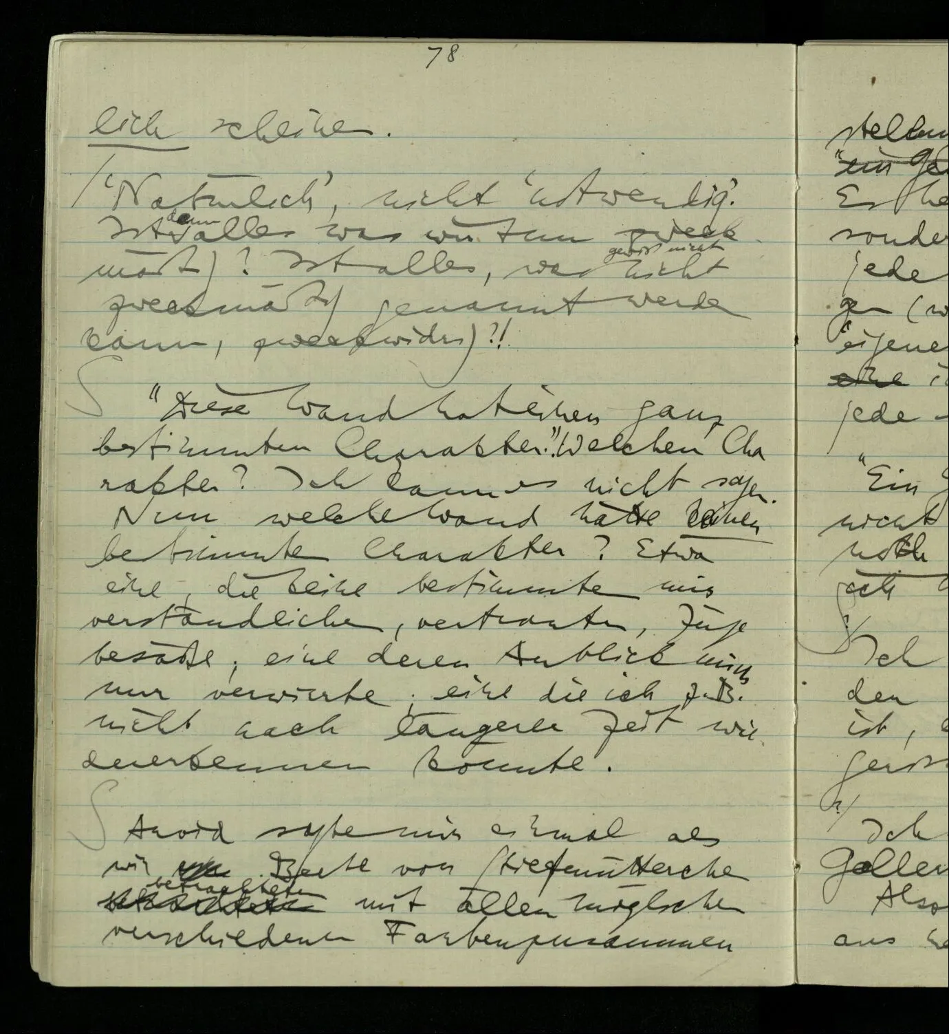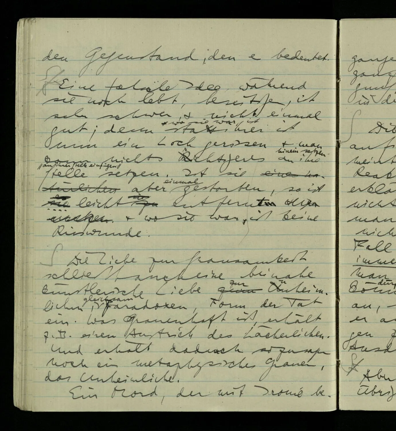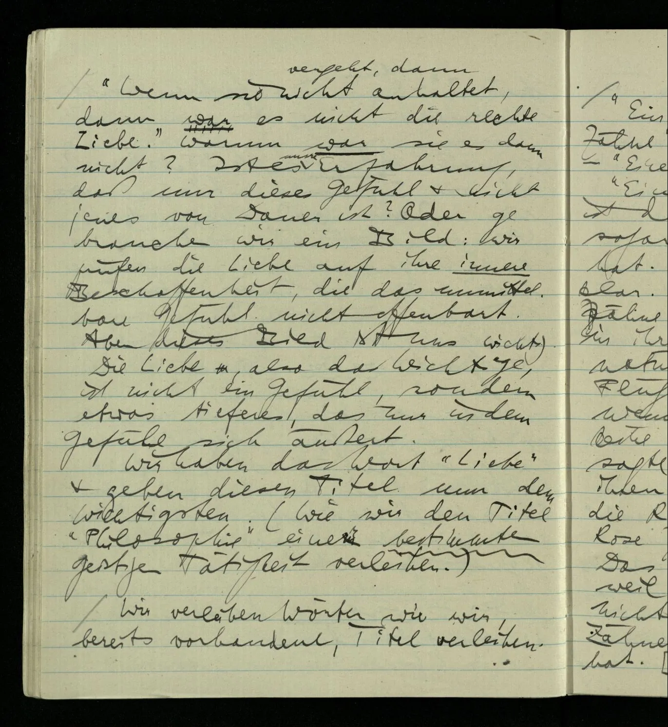 08.08.1946 Ich bin sehr traurig, sehr oft traurig. Ich fühle mich so, als sei das jetzt das Ende meines Lebens. Und doch ist es möglich daß mein Leben noch Jahrelang weitergeht; wie? weiß Gott. Das Eine was die Liebe zu B. für mich getan hat ist: sie hat die übrigen kleinlichen Sorgen, jene Stellung & Arbeit betreffend, in den Hintergrund gejagt; wenigstens auf kurze Zeit. Ich sehe manchmal, daß es wichtiger ist, zu leben, als die & die Stellung zu haben.
