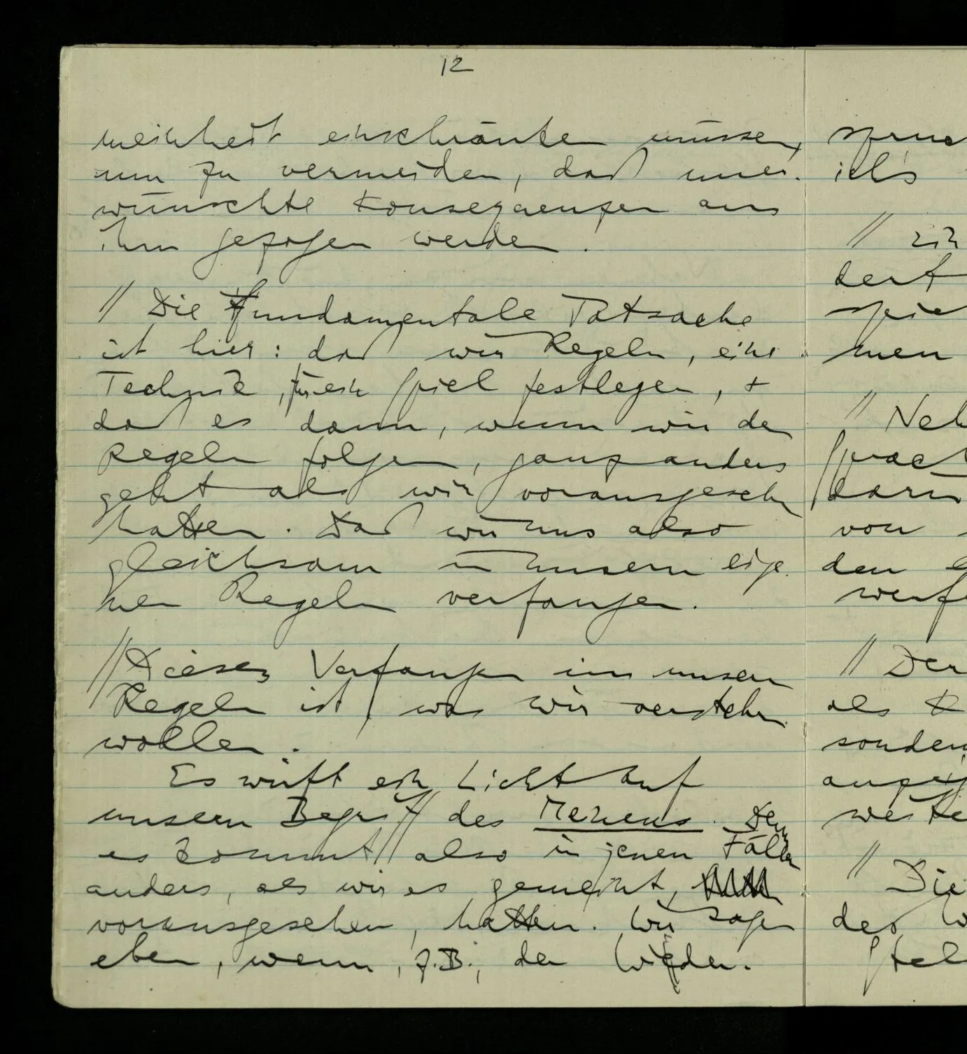 Die fundamentale Tatsache ist hier: daß wir Regeln, eine Technik, für ein Spiel festlegen, & daß es dann, wenn wir den Regeln folgen, ganz anders geht als wir vorausgesehen hatten. Daß wir uns also gleichsam in unsern eigenen Regeln verfangen.