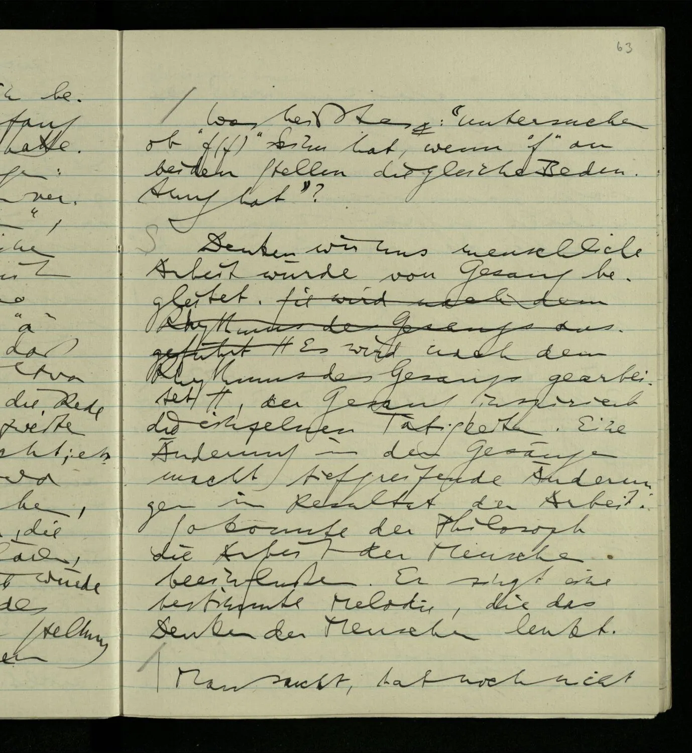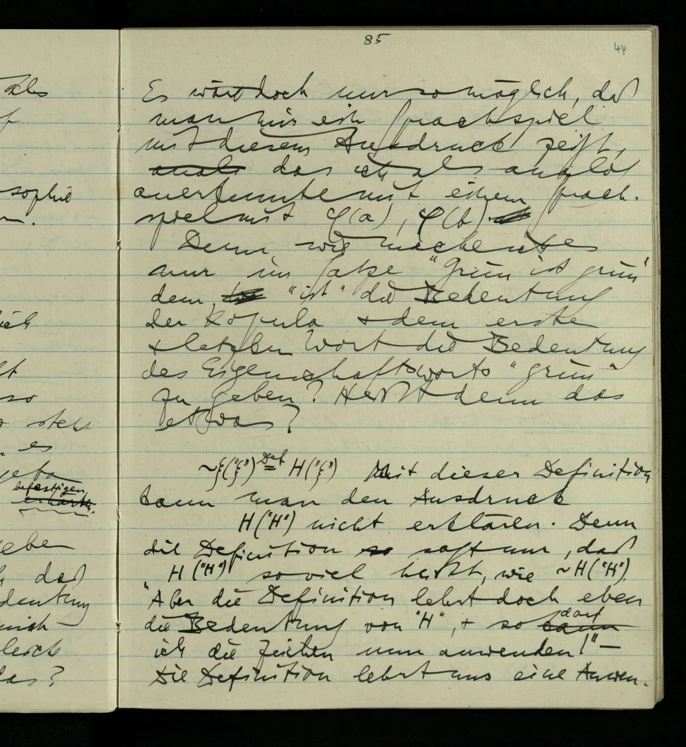 “Wie unterscheidet sich aber, daß er’s meint, davon, daß er’s nicht meint?” – Das zu beantworten, muß ich Dich lehren, was ‘meinen’ heißt. Kann ich das tun, indem ich sage, es sei etwas was in mir & Dir vorgeht? Vielleicht! – aber die Frage ist: wie zeigt es sich, daß Einer es begriffen hat? Es könnte doch sein, daß jemand die Bedeutung des Ausdrucks “was man sagt meinen” durch ein Zeigen auf das Herz verstehen lernt. Aber nun muß man fragen: “Was hat er gelernt; wie zeigt sich’s, daß er es gelernt hat?”
