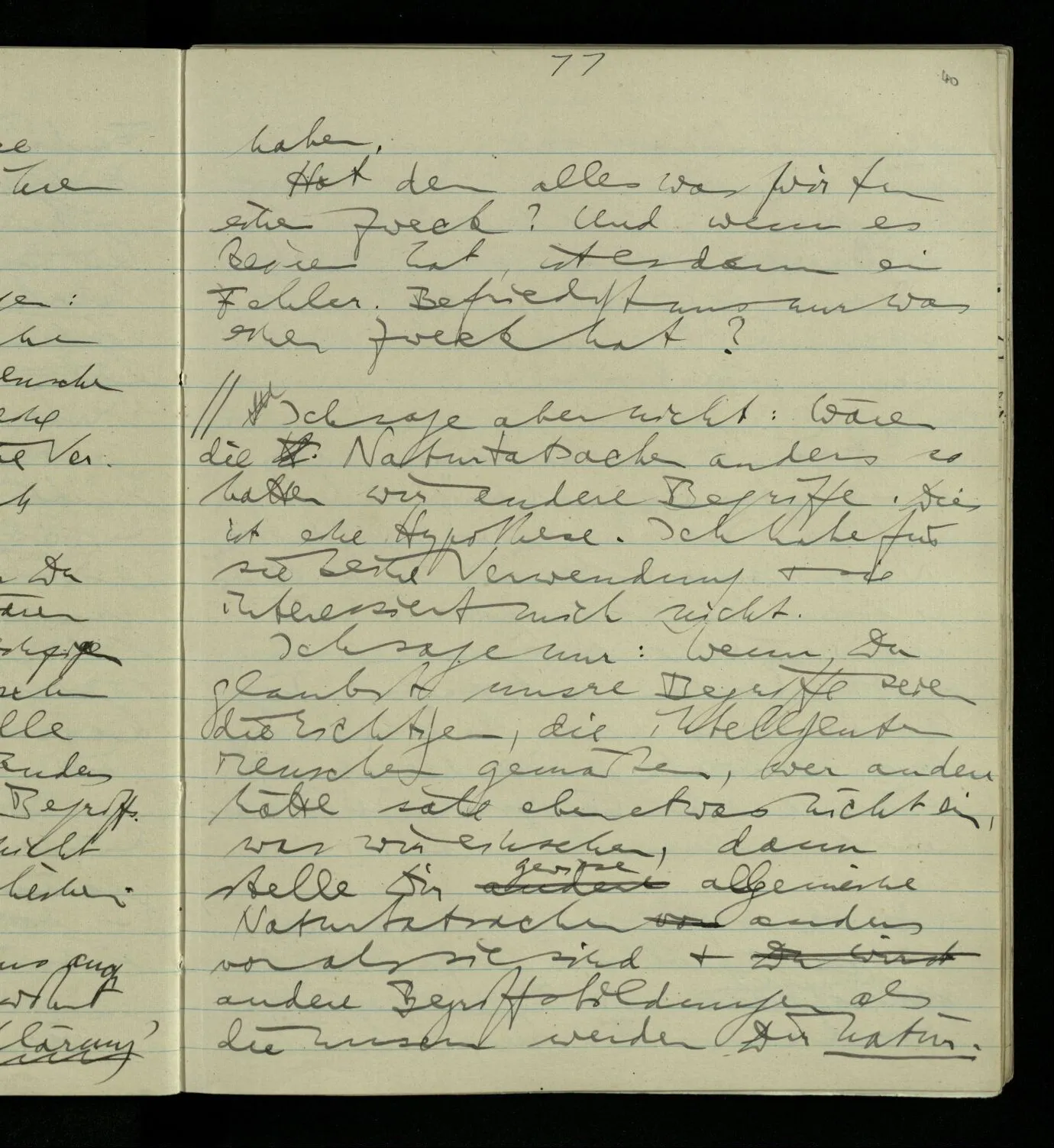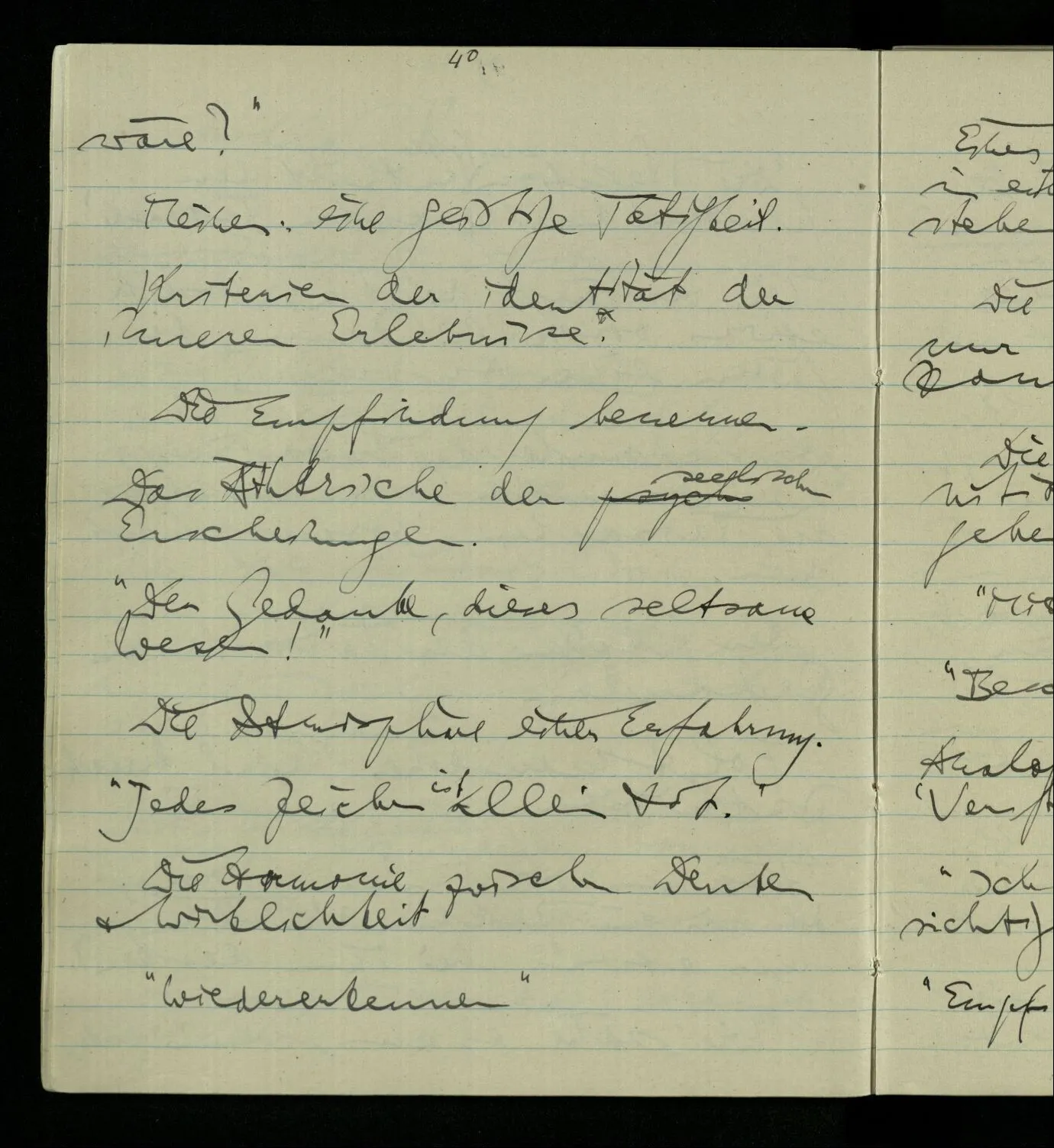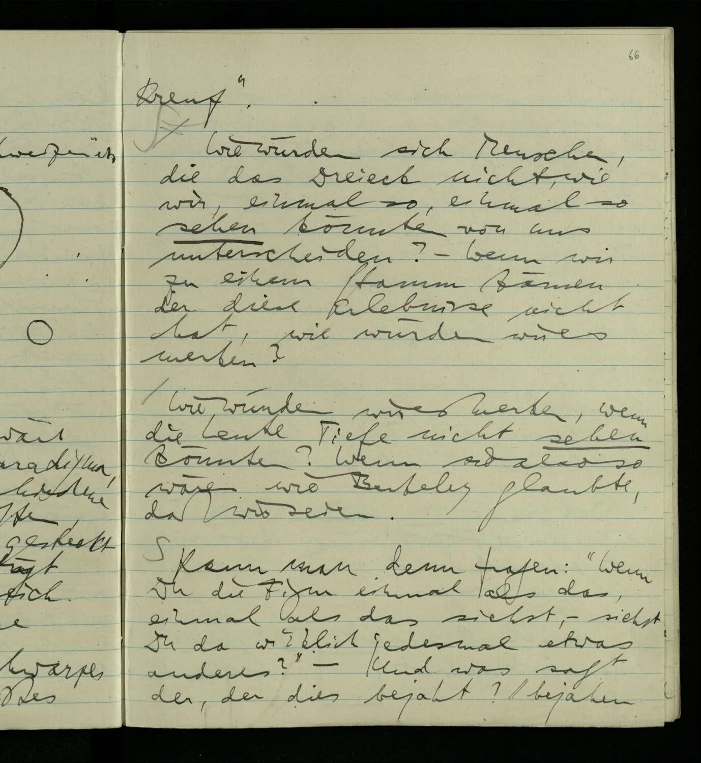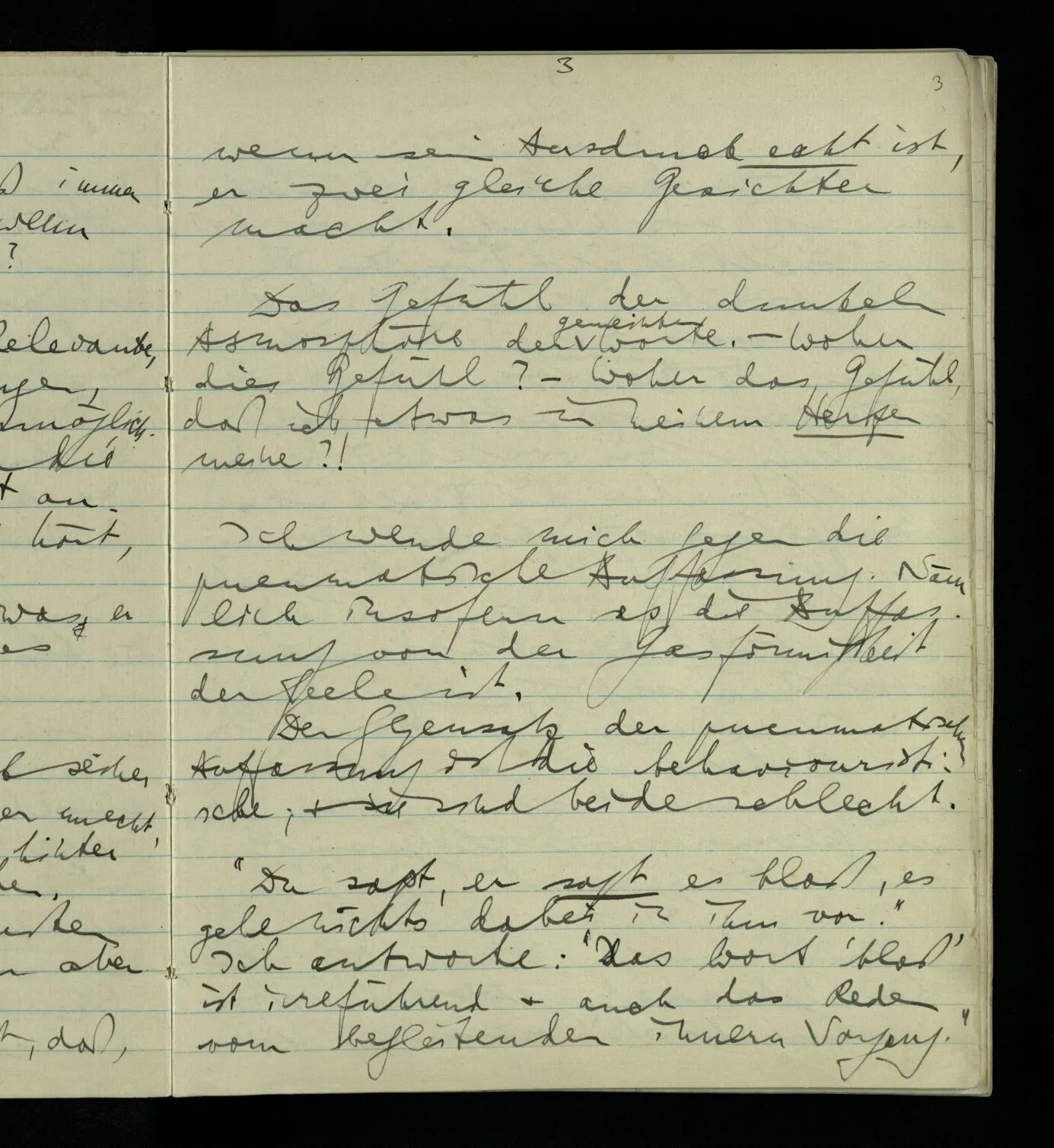 “Aber die Worte, sinnvoll ausgesprochen, haben doch nicht nur Fläche, sondern auch eine Tiefendimension!” Es findet eben doch etwas anderes statt wenn sie sinnvoll ausgesprochen werden, als wenn sie bloß ausgesprochen werden. Wie ich das ausdrücke, darauf kommts nicht an. Ob ich sage sie haben im ersten Fall Tiefe, oder es geht dabei etwas in Mir, in meinem Inneren, vor, oder sie haben eine Atmosphäre, es kommt immer auf’s Gleiche hinaus. Wenn wir nun alle hierin übereinstimmen, wird es da nicht wahr sein?