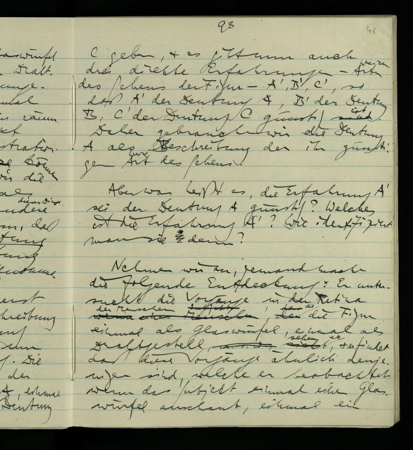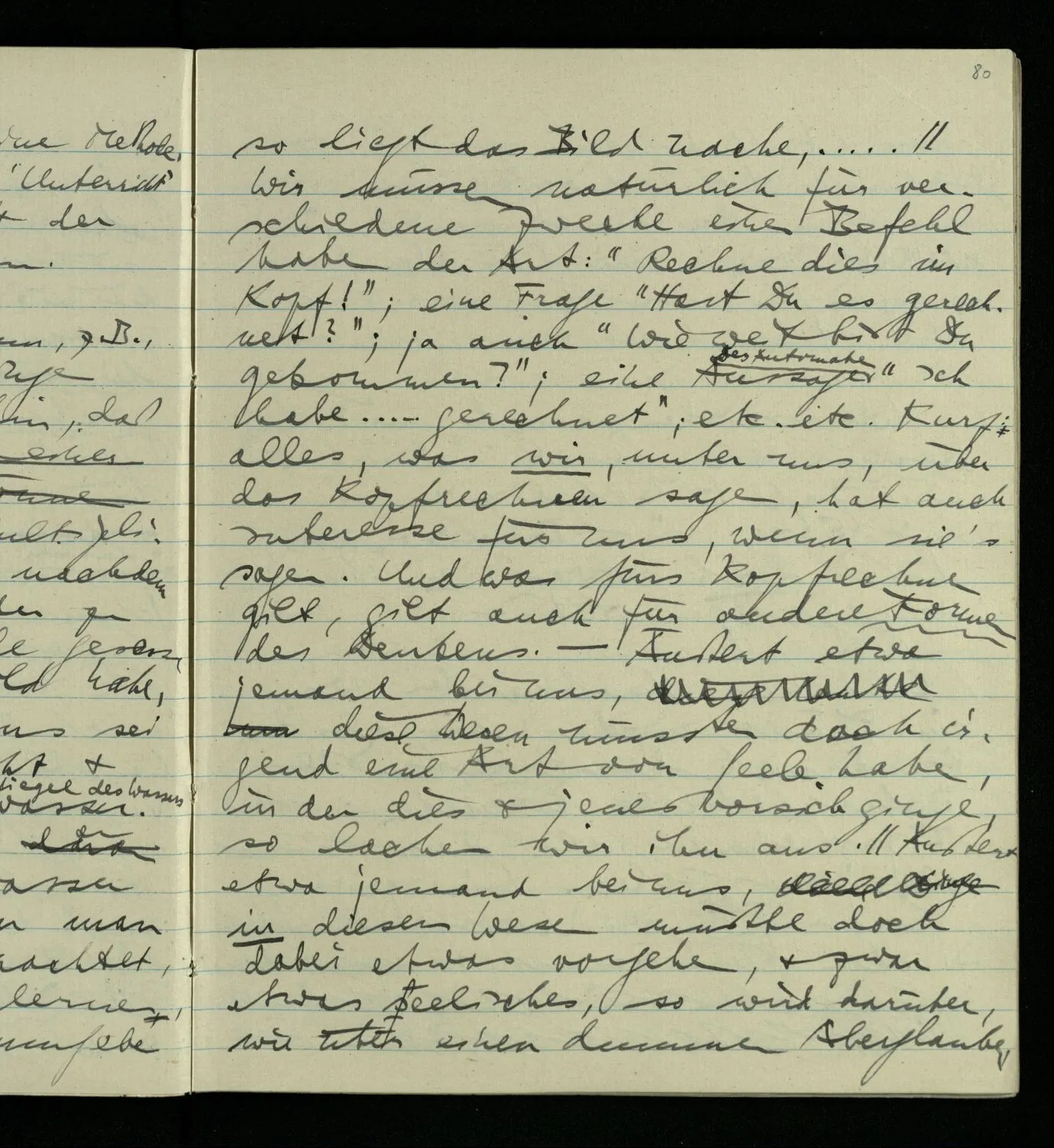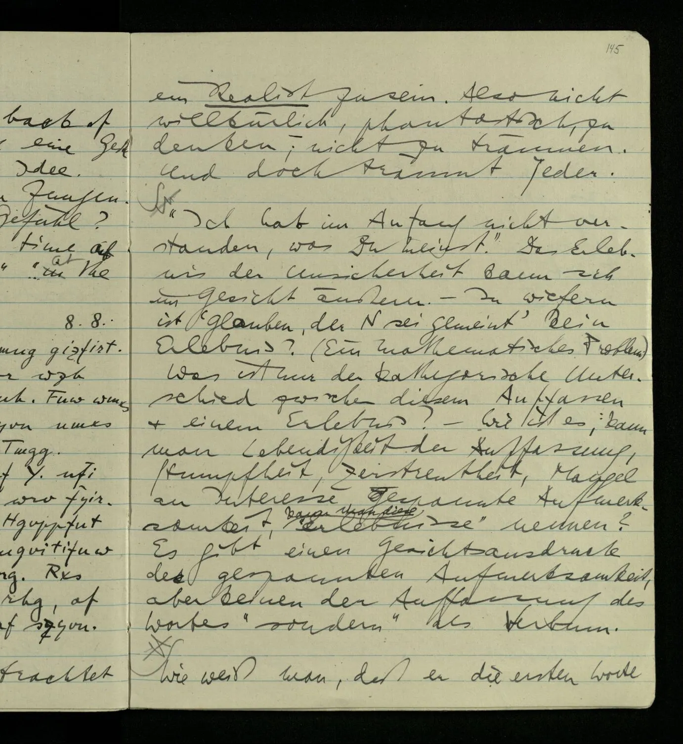 “Ich hab im Anfang nicht verstanden, was Du meinst.” Das Erlebnis der Unsicherheit kann sich im Gesicht äußern. – In wiefern ist ‘glauben, der N sei gemeint’ kein Erlebnis? (Ein mathematisches Problem.) Was ist nun der kathegorische Unterschied zwischen diesem Auffassen & einem Erlebnis? – Wie ist es, kann man Lebendigkeit der Auffassung, Stumpfheit, Zerstreutheit, Mangel an Interesse, gespannte Aufmerksamkeit, kann man diese “Erlebnisse” nennen? Es gibt einen Gesichtsausdruck der gespannten Aufmerksamkeit, aber keinen der Auffassung des Wortes “sondern” als Verbum.
