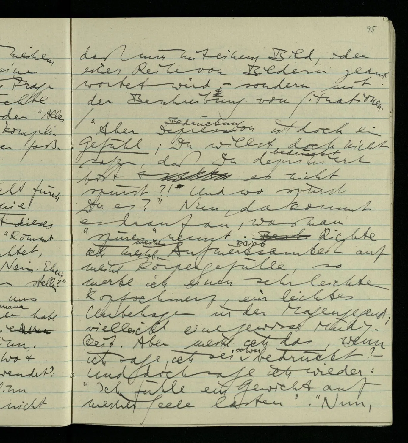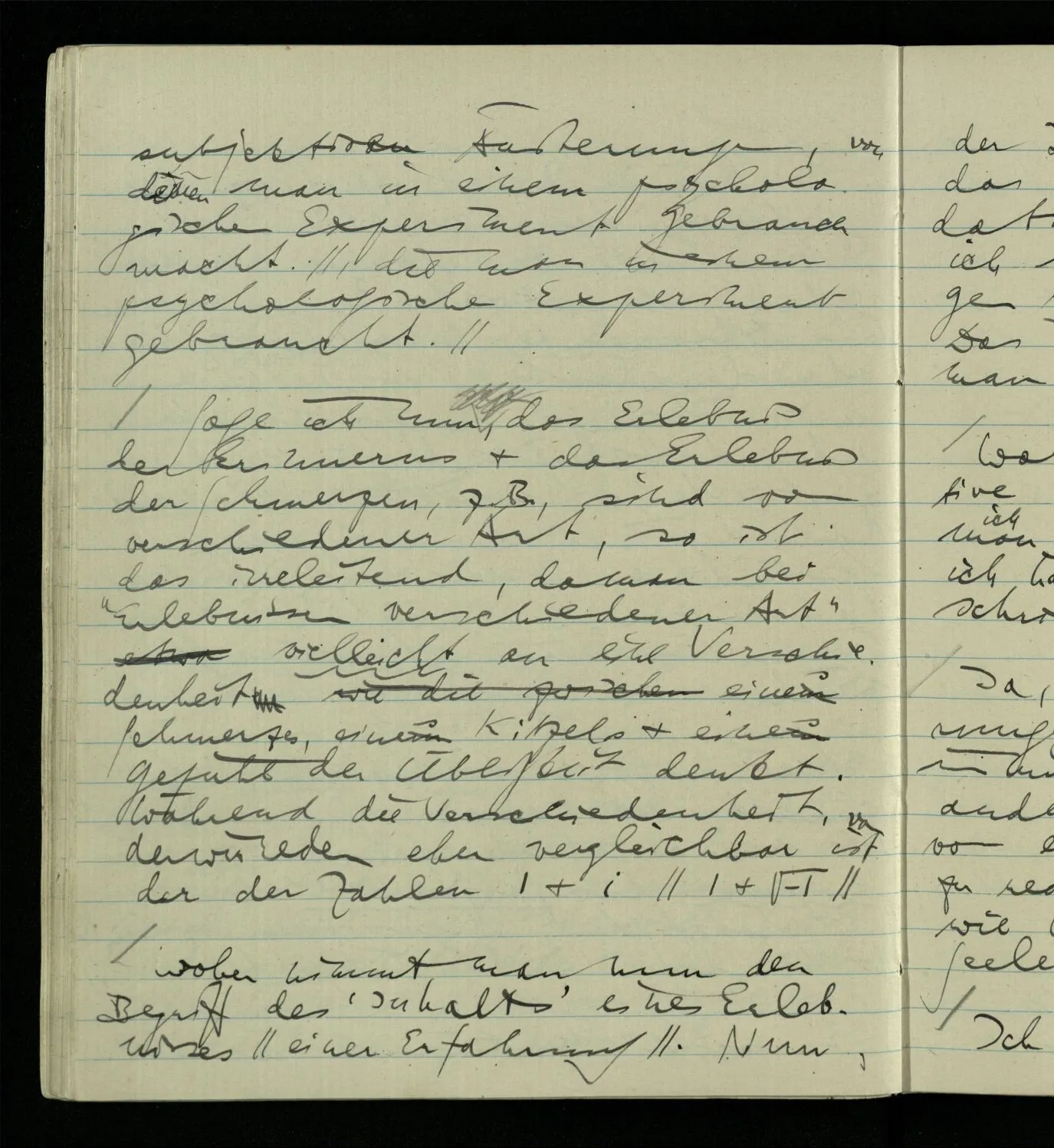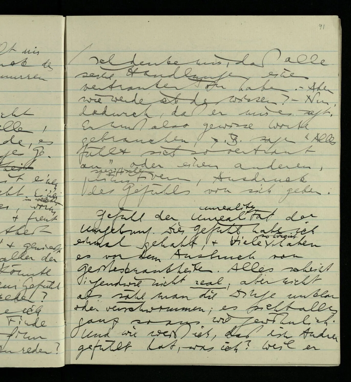 “Ich hab im Anfang nicht verstanden, was Du meinst.” Das Erlebnis der Unsicherheit kann sich im Gesicht äußern. – In wiefern ist ‘glauben, der N sei gemeint’ kein Erlebnis? (Ein mathematisches Problem.) Was ist nun der kathegorische Unterschied zwischen diesem Auffassen & einem Erlebnis? – Wie ist es, kann man Lebendigkeit der Auffassung, Stumpfheit, Zerstreutheit, Mangel an Interesse, gespannte Aufmerksamkeit, kann man diese “Erlebnisse” nennen? Es gibt einen Gesichtsausdruck der gespannten Aufmerksamkeit, aber keinen der Auffassung des Wortes “sondern” als Verbum.