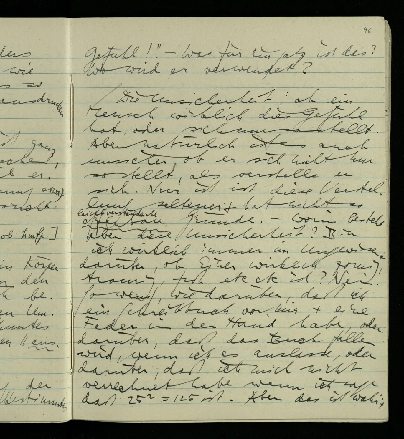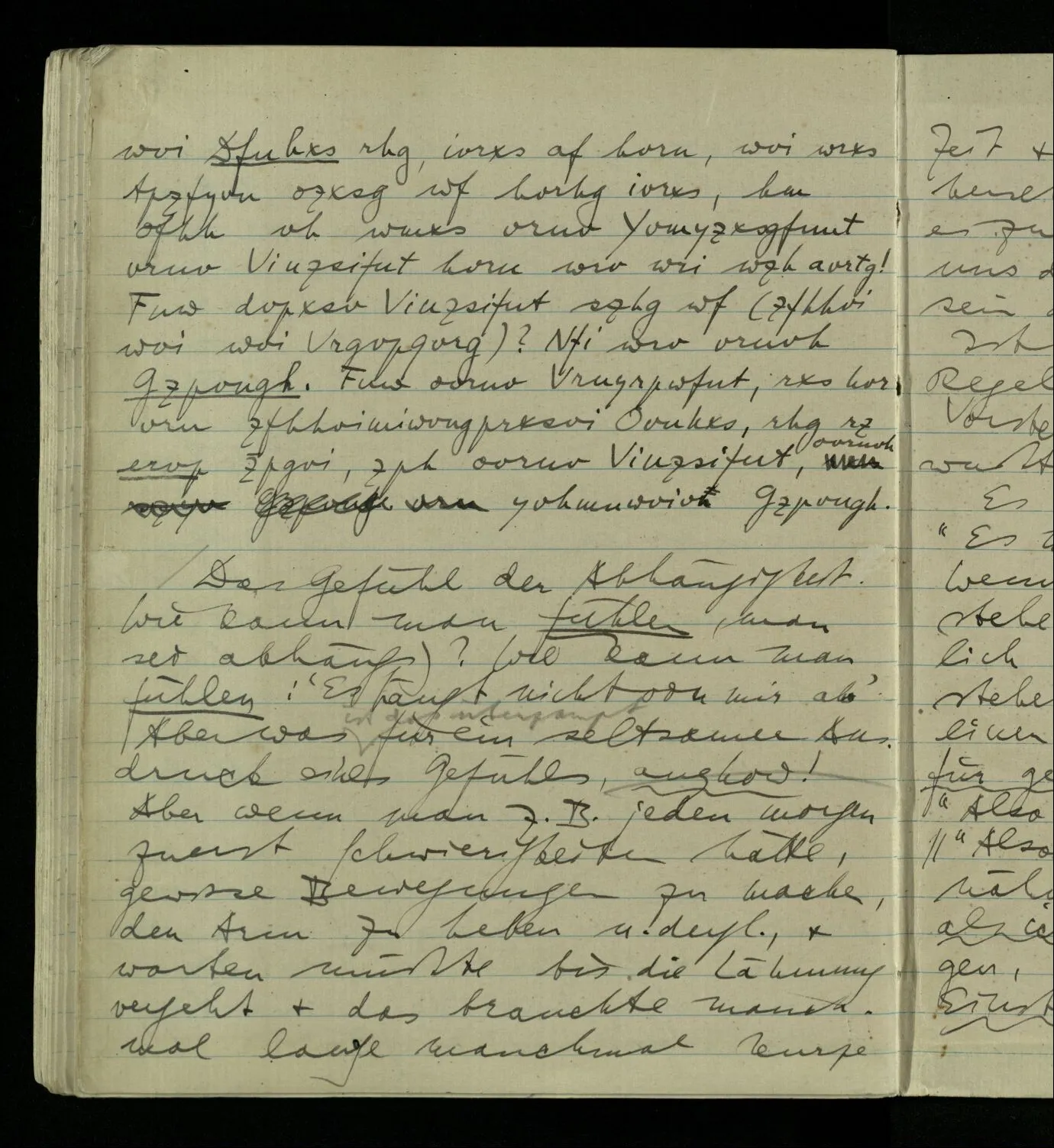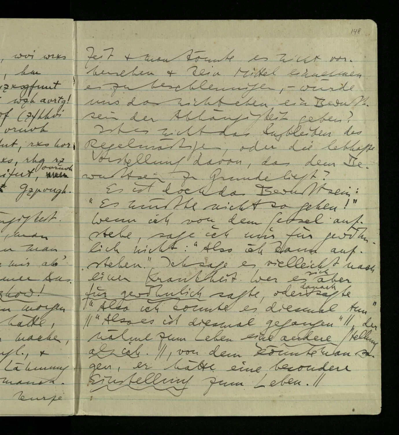 Das Gefühl der Abhängigkeit. Wie kann man fühlen, man sei abhängig? Wie kann man fühlen: ‘Es hängt nicht von mir ab’. Aber was ist das überhaupt für ein seltsamer Ausdruck eines Gefühls. Aber wenn man z.B. jeden Morgen zuerst Schwierigkeiten hätte, gewisse Bewegungen zu machen, den Arm zu heben u. dergl., & warten müßte bis die Lähmung vergeht & das brauchte manchmal lange, manchmal kurze Zeit, & man könnte es nicht vorhersehen & kein Mittel einnehmen, es zu beschleunigen, – würde uns das nicht eben ein Bewußtsein der Abhängigkeit geben? Ist es nicht das Ausbleiben des Regelmäßigen, oder die lebhafte Vorstellung davon, das dem Bewußtsein zu Grunde liegt? Es ist doch das Bewußtsein: “Es müßte nicht so gehen!” Wenn ich von dem Sessel aufstehe, sage ich mir für gewöhnlich nicht: “Also ich kann aufstehen.” Ich sage es vielleicht nach einer Krankheit. Wer es sich aber für gewöhnlich sagte, oder danach sagte “Also ich konnte es diesmal tun”, der nähme zum Leben eine andere Stellung als ich.