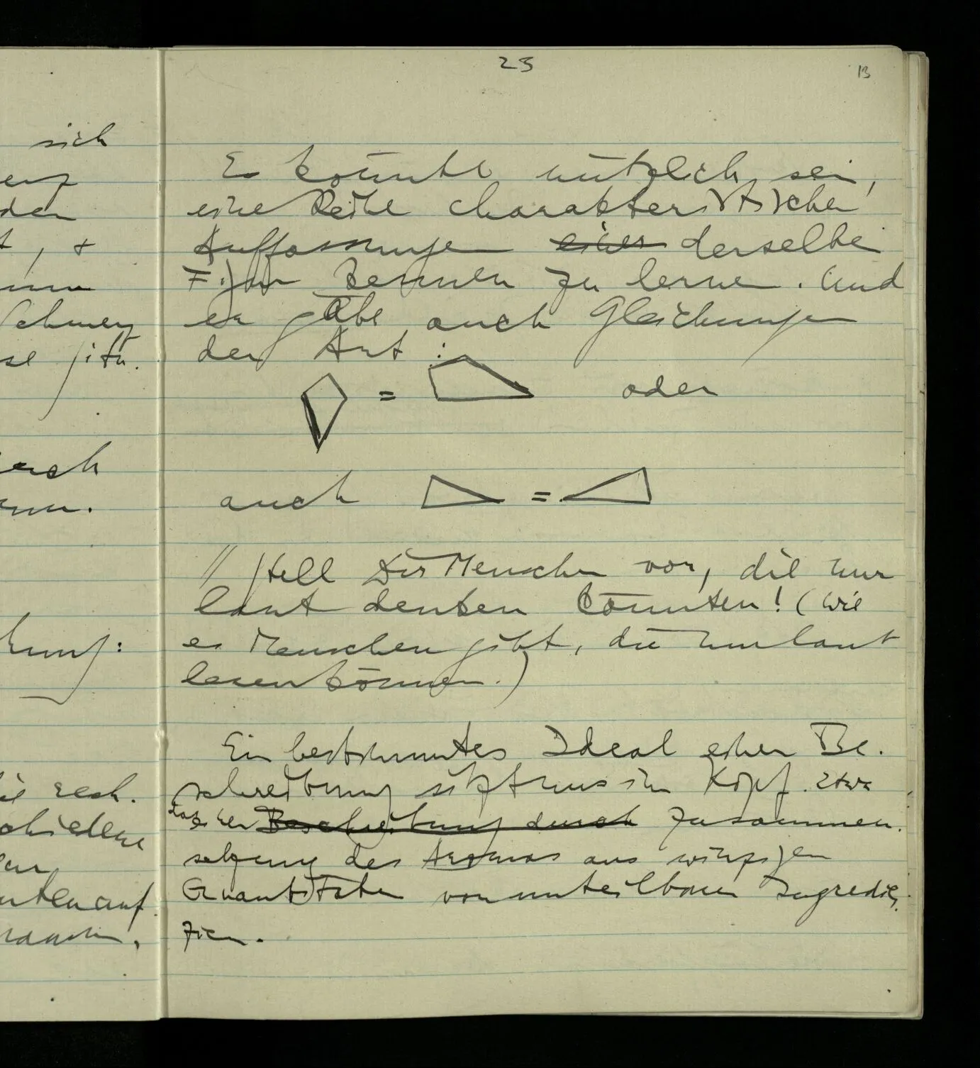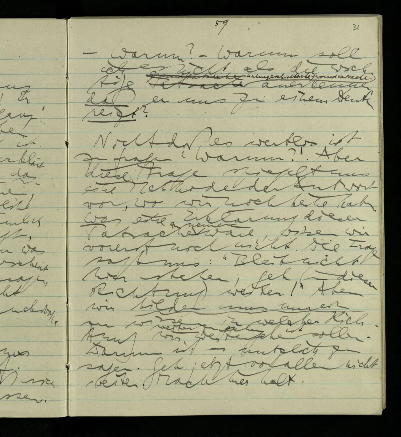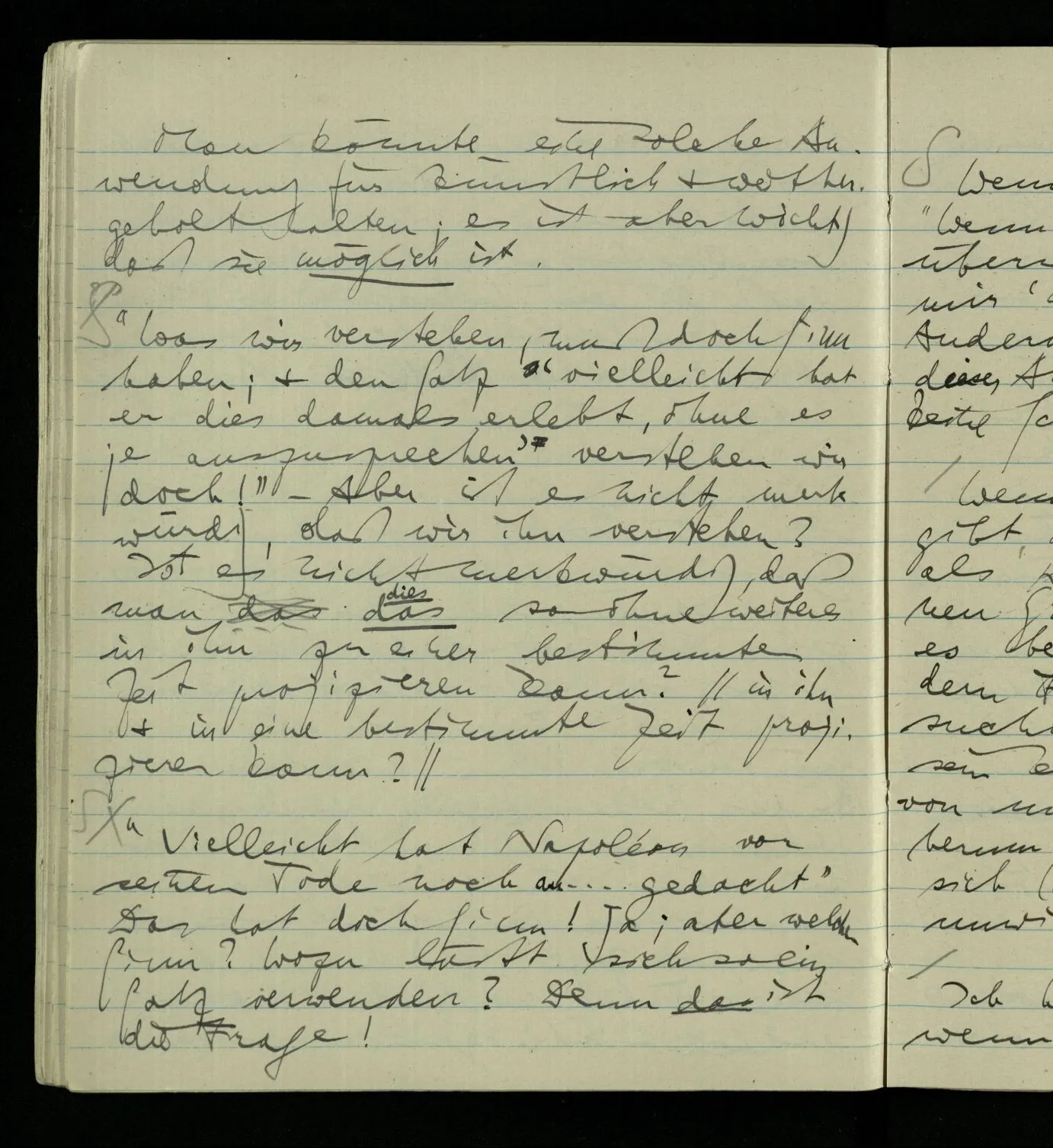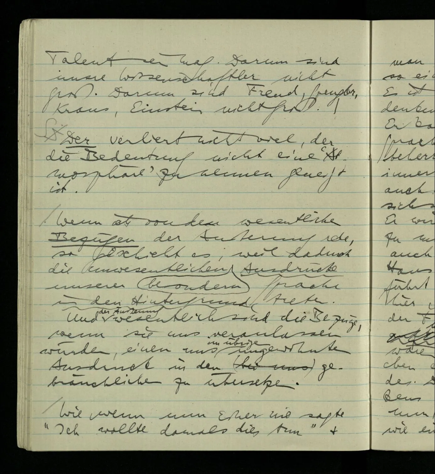 Sind alle Leute große Menschen? Nein. – Nur, wie kannst du dann hoffen, ein großer Mensch zu sein! Warum soll mir etwas zuteil werden, was deinen Nachbarn nicht zu teil wird? Wofür?! – Wenn es nicht der Wunsch ist, reich zu sein, der dich glauben macht du seist reich, so muß es doch eine Beobachtung, eine Erfahrung sein die dir das zeigt! Und welche Erfahrung hast du (außer der der Eitelkeit)? Nur die eines Talents. Und meine Einbildung, ich sei ein außerordentlicher Mensch, ist ja viel älter, als meine Erfahrung, meines besonderen Talents.