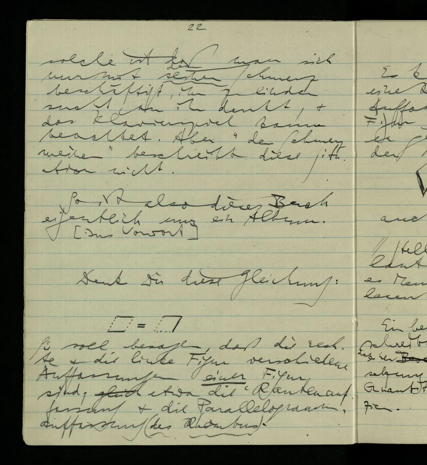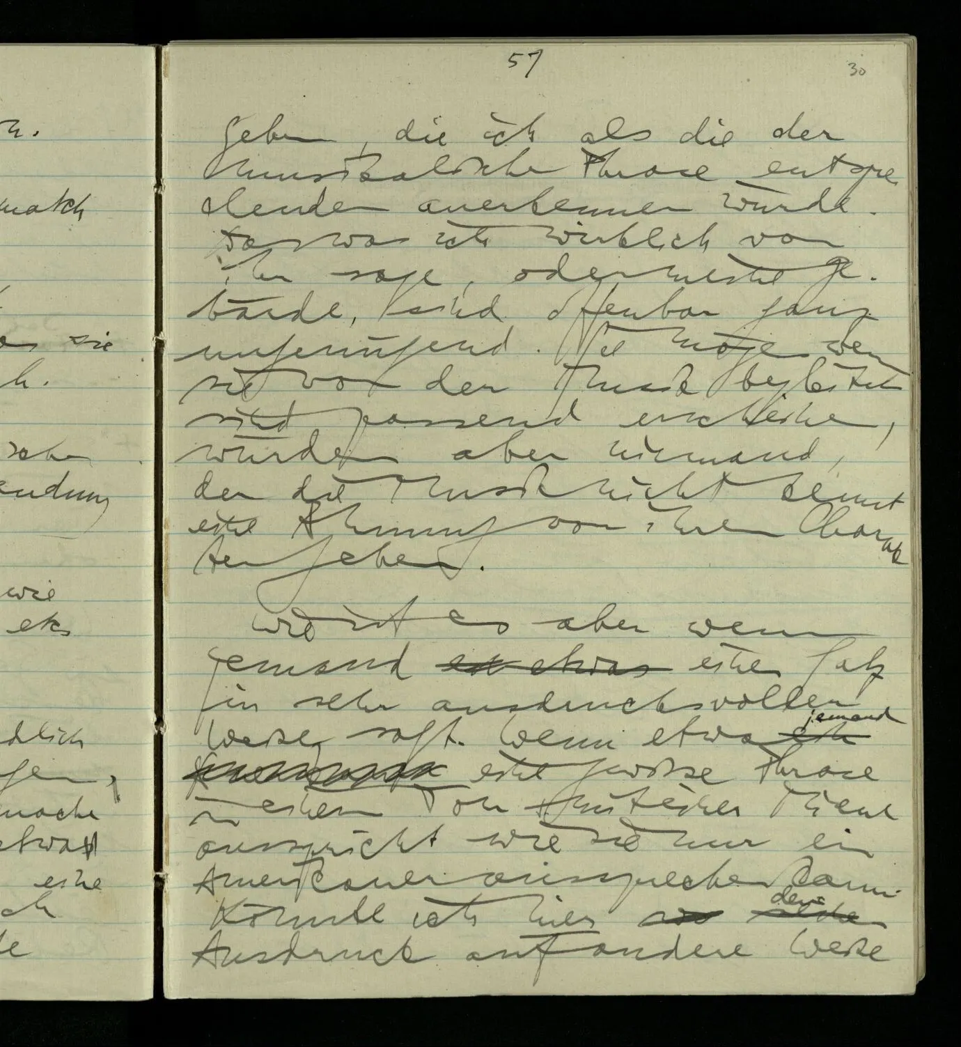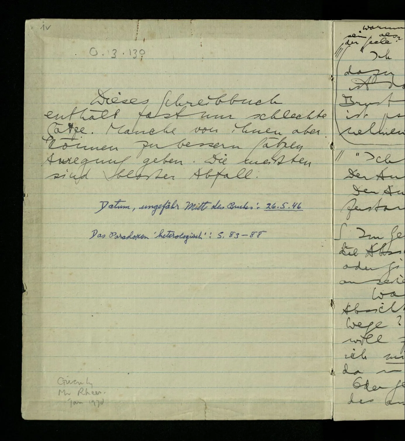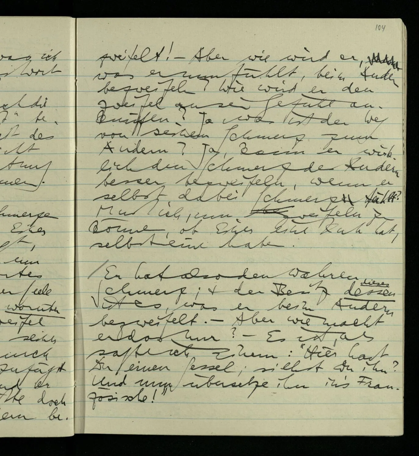 Sind alle Leute große Menschen? Nein. – Nur, wie kannst du dann hoffen, ein großer Mensch zu sein! Warum soll mir etwas zuteil werden, was deinen Nachbarn nicht zu teil wird? Wofür?! – Wenn es nicht der Wunsch ist, reich zu sein, der dich glauben macht du seist reich, so muß es doch eine Beobachtung, eine Erfahrung sein die dir das zeigt! Und welche Erfahrung hast du (außer der der Eitelkeit)? Nur die eines Talents. Und meine Einbildung, ich sei ein außerordentlicher Mensch, ist ja viel älter, als meine Erfahrung, meines besonderen Talents.