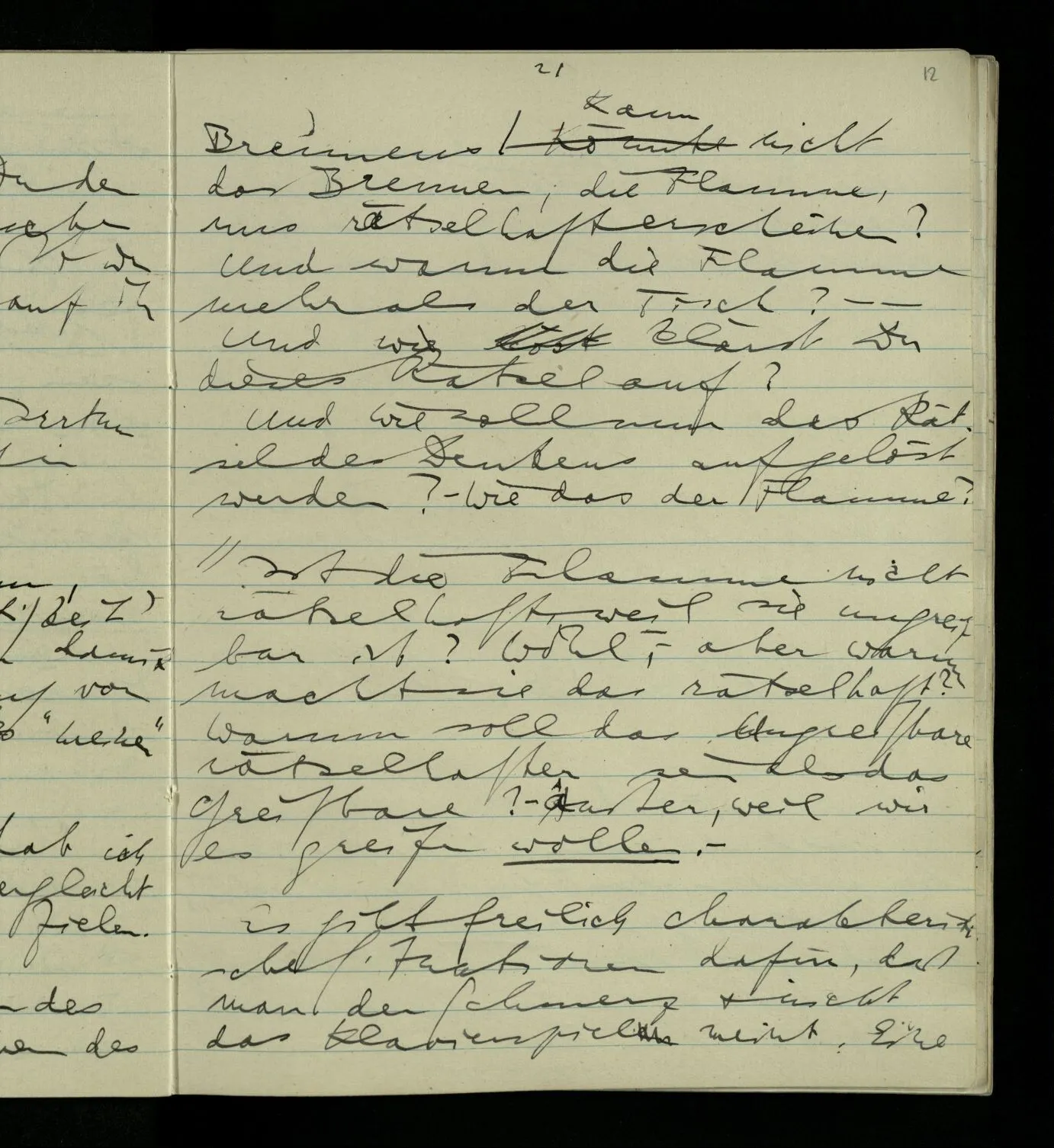 “Die Gewißheit, daß ich werde fortsetzen können, nachdem ich dies Erlebnis gehabt habe – z.B. diese Formel gesehen habe – gründet sich einfach auf Induktion.” Was heißt das? – “Die Gewißheit, daß das Feuer mich brennen wird, gründet sich auf Induktion.” Heißt das, daß ich mir sage: “Ich habe mich immer an einer Flamme verbrannt, also wird es auch jetzt geschehen”? Oder ist die frühere Erfahrung die Ursache meiner Gewißheit, nicht ihr Grund. – das kommt auf das System von Hypothesen, Naturgesetzen an, in welchem wir das Phänomen der Gewißheit betrachten.