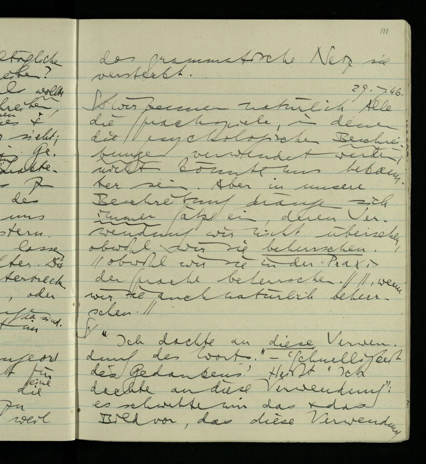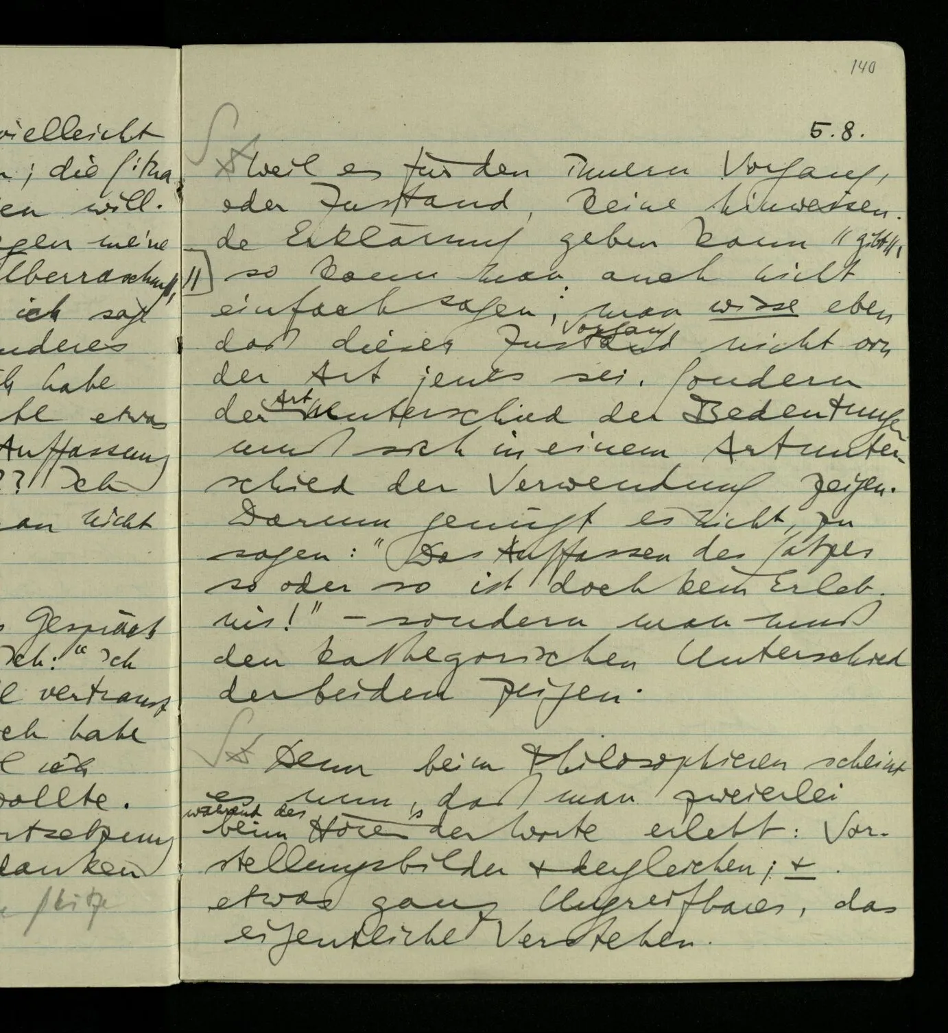 05.08.1946 Weil es für den innern Vorgang, oder Zustand, keine hinweisende Erklärung geben kann, so kann man auch nicht einfach sagen, man wisse eben daß dieser Zustand nicht von der Art jenes sei. Sondern der Artunterschied der Bedeutungen muß sich in einem Artunterschied der Verwendung zeigen. Darum genügt es nicht, zu sagen: “Das Auffassen des Satzes so oder so ist doch kein Erlebnis!” – sondern man muß den kathegorischen Unterschied der beiden zeigen.