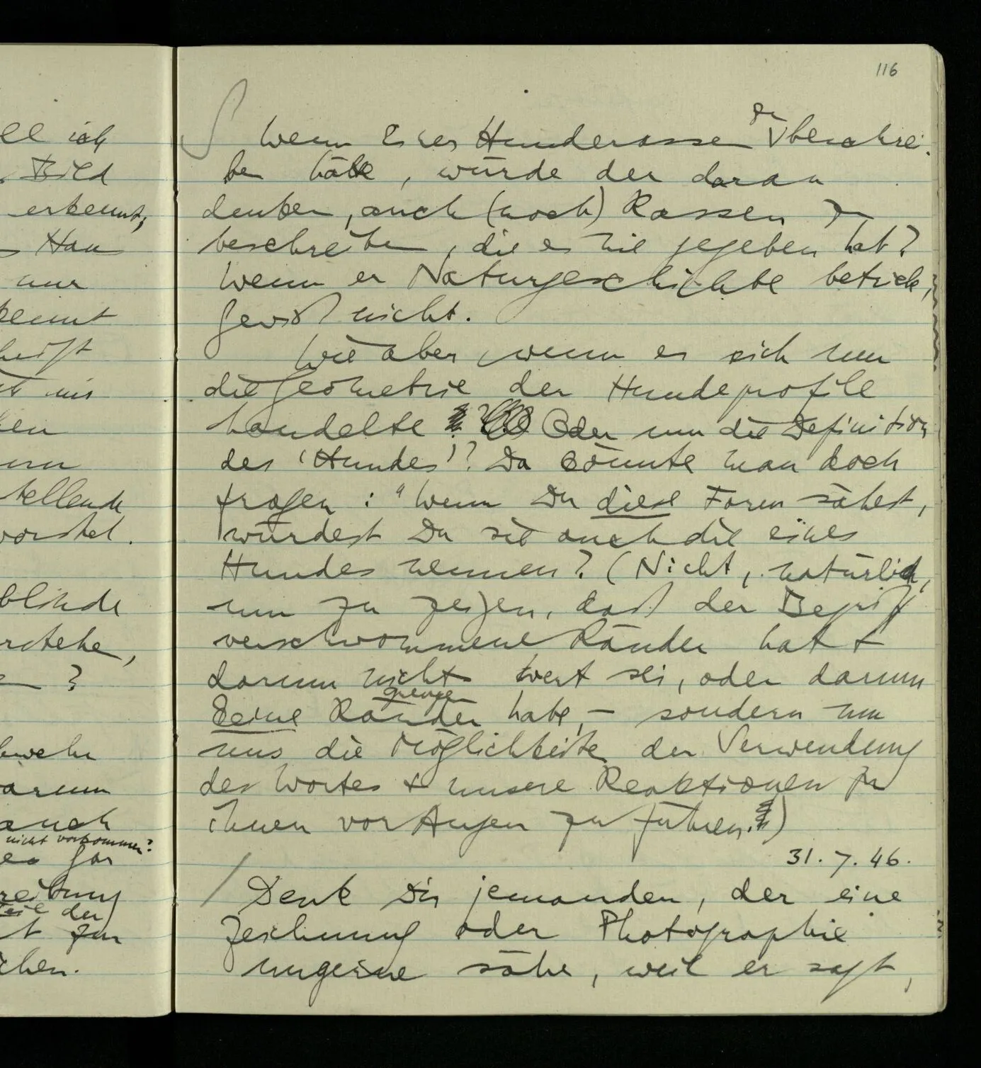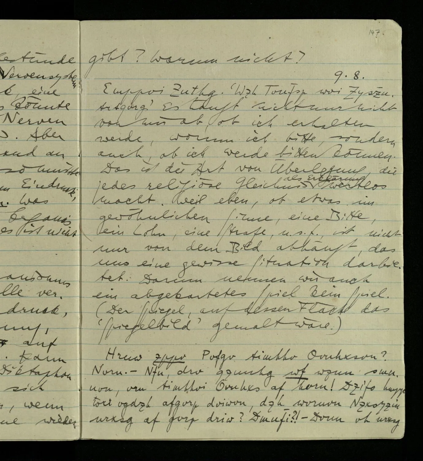09.08.1946 Voller Angst. ‘Das Gefühl der Abhängigkeit.’ Es hängt nicht nur nicht von mir ab, ob ich erhalten werde, worum ich bitte, sondern auch, ob ich werde bitten können. Das ist die Art von Überlegung, die jedes religiöse Gleichnis als Erklärung wertlos macht. Weil eben, ob etwas im gewöhnlichen Sinne, eine Bitte, ein Lohn, eine Strafe, u.s.f., ist nicht nur von dem Bild abhängt, das uns eine gewisse Situation darbietet. Darum nennen wir auch ein abgekartetes Spiel kein Spiel. (Der Spiegel, auf dessen Fläche das ‘Spiegelbild’ gemalt wäre.)