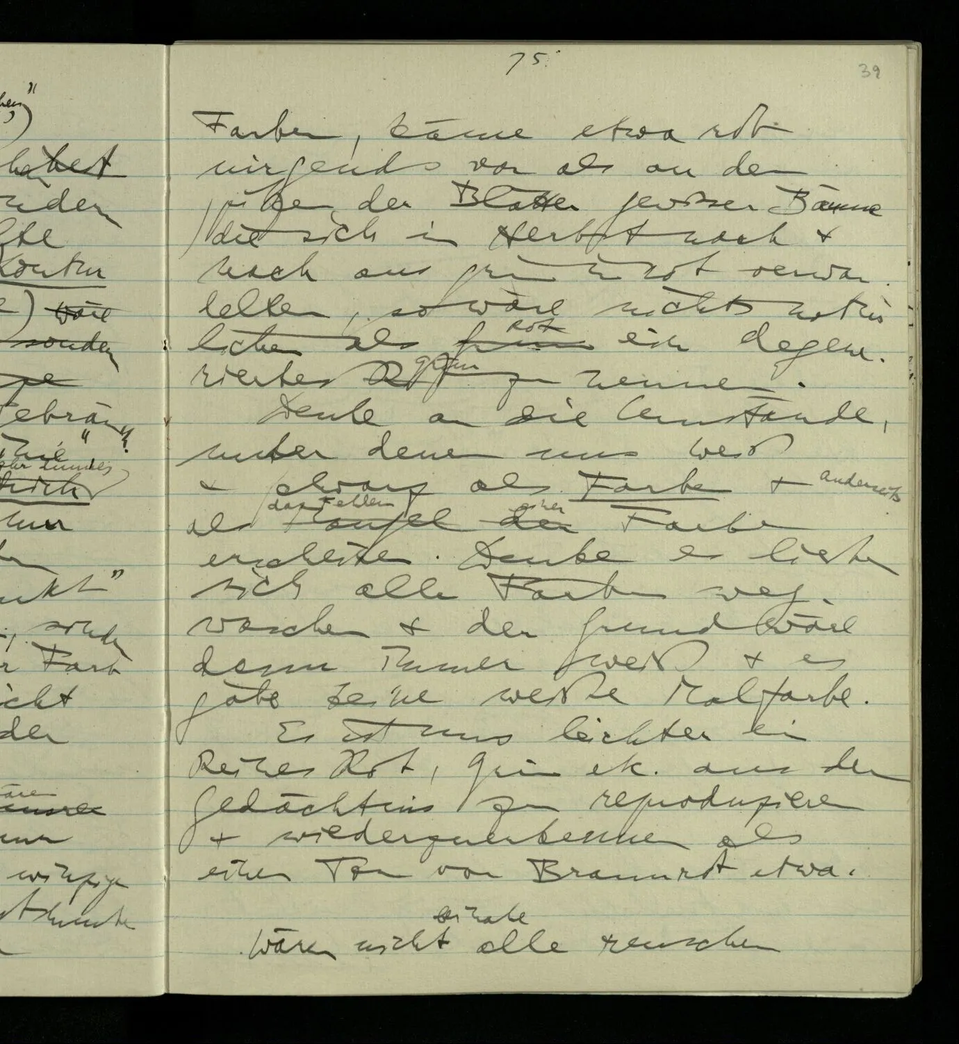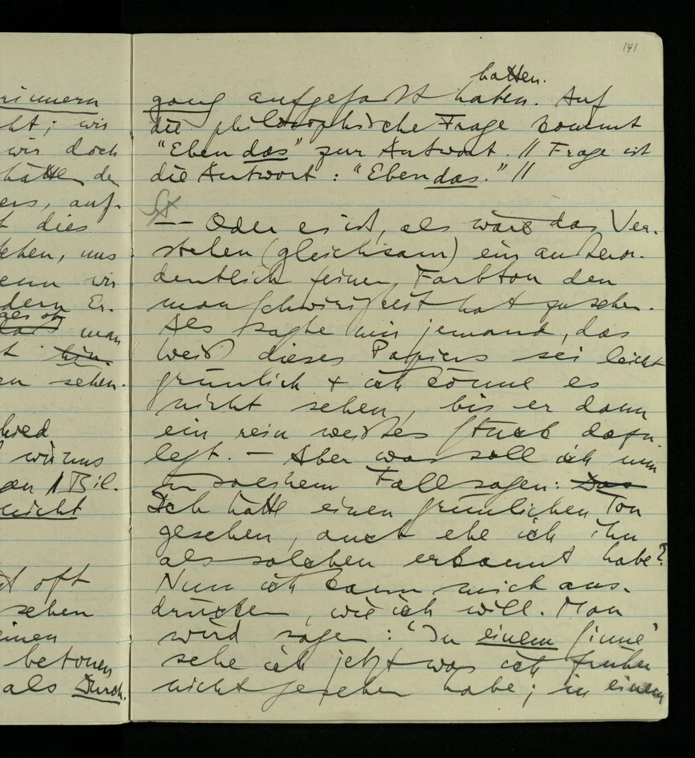 – – Oder es ist, als wäre das Verstehen (gleichsam) ein außerordentlich feiner Farbton den man Schwierigkeit hat zu sehen. Als sagte mir jemand, das Weiß dieses Papiers sei leicht grünlich, & ich könne es nicht sehen, bis er dann ein rein weißes Stück dazulegt. – Aber was soll ich nun in so einem Fall sagen: Ich hätte einen grünlichen Ton gesehen, auch ehe ich ihn als solchen erkannt habe? Nun ich kann mich ausdrücken, wie ich will. Man wird sagen: ‘In einem Sinne’ sehe ich jetzt was ich früher nicht gesehen habe; in einem andern sehe ich das Gleiche. Aber dieses Beispiel ist auch irreleitend.