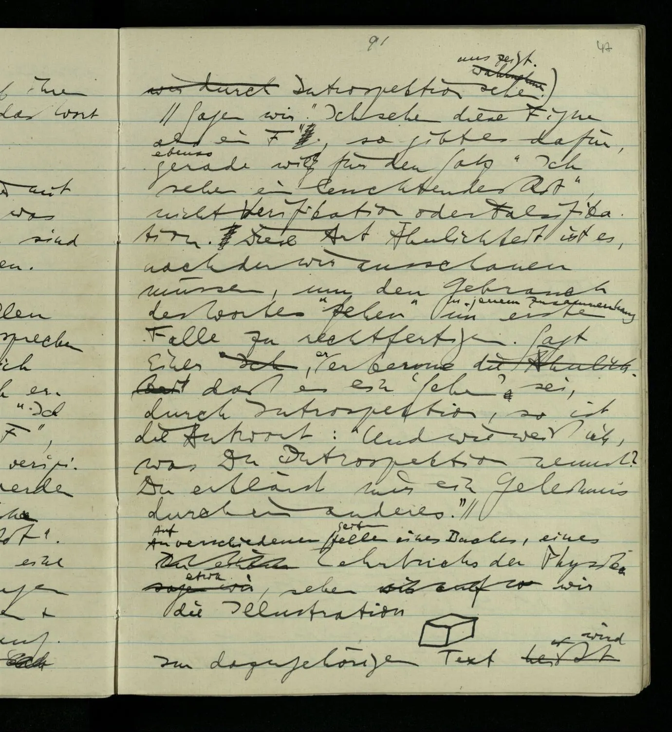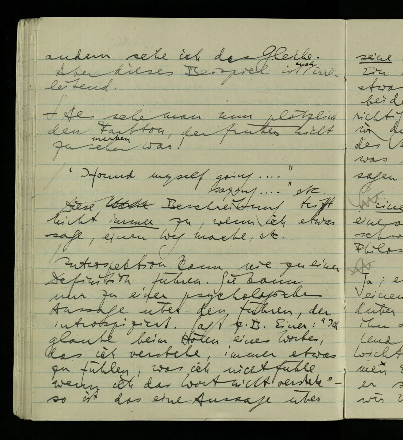 Introspektion kann nie zu einer Definition führen. Sie kann nur zu einer psychologischen Aussage über den führen, der introspiziert. Sagt z.B. Einer: “Ich glaube beim Hören eines Wortes, das ich verstehe, immer etwas zu fühlen, was ich nicht fühle wenn ich das Wort nicht verstehe” – so ist das eine Aussage über seine besondern Erlebnisse. Ein Anderer erlebt vielleicht etwas ganz anderes; & wenn beide das Wort “verstehen” richtig gebrauchen, so liegt in diesem Gebrauch das Wesen des Verstehens, & nicht in dem, was sie über ihre Erfahrungen sagen können.