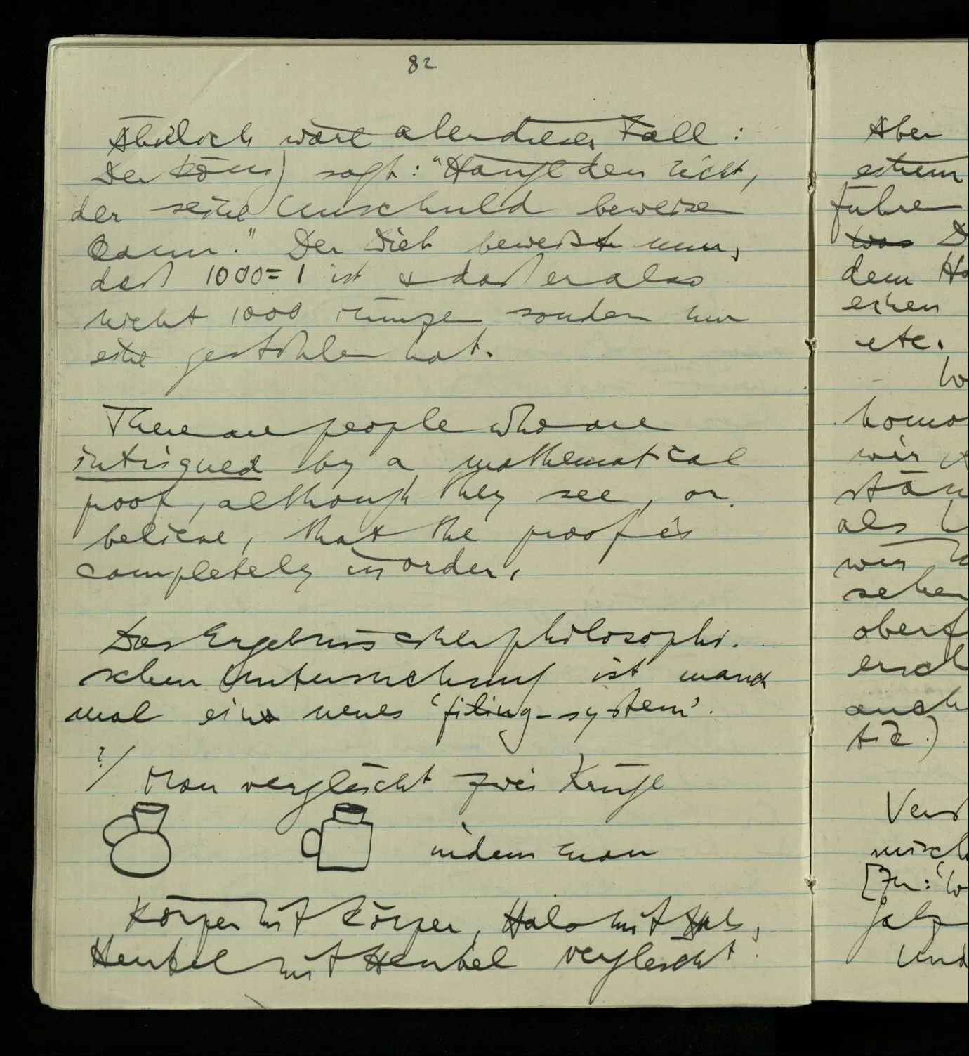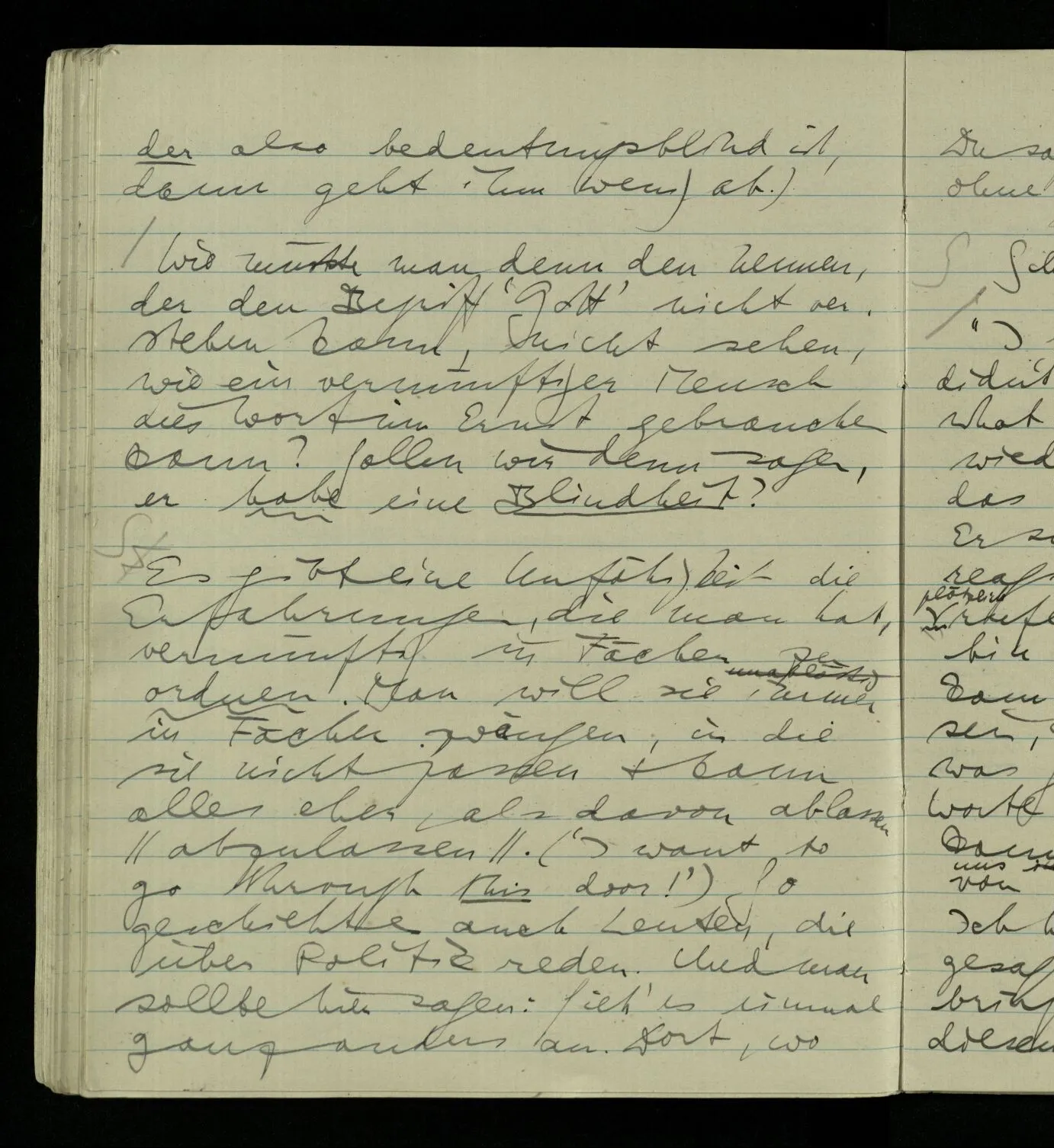 Es gibt eine Unfähigkeit die Erfahrungen, die man hat, vernünftig in Fächer zu ordnen. Man will sie immer in Fächer zwängen, in die sie nicht passen & kann alles eher, als davon ablassen. (‘I want to go through this door!’) So geschieht es auch Leuten, die über Politik reden. Und man sollte hier sagen: Sieh’ es einmal ganz anders an. Dort, wo Du sagst, es sei ein Messer, nur ohne Griff & Klinge, ist kein Messer.