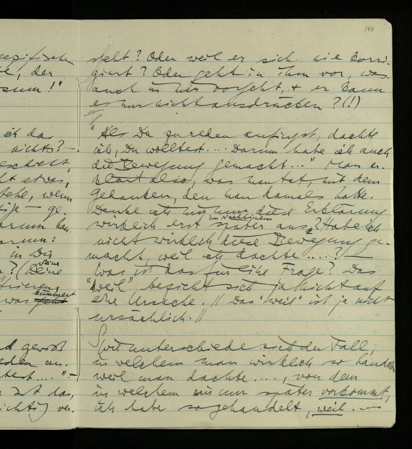 “Als Du zu reden anfingst, dachte ich, Du wolltest …. Darum habe ich auch die Bewegung gemacht …” Man erklärt also, was man tat, mit dem Gedanken, den man damals hatte. Denke ich mir nun diese Erklärung wirklich erst später aus? Habe ich nicht wirklich diese Bewegung gemacht, weil ich dachte. …? – Was ist das für eine Frage? Das “Weil” bezieht sich ja nicht auf eine Ursache.