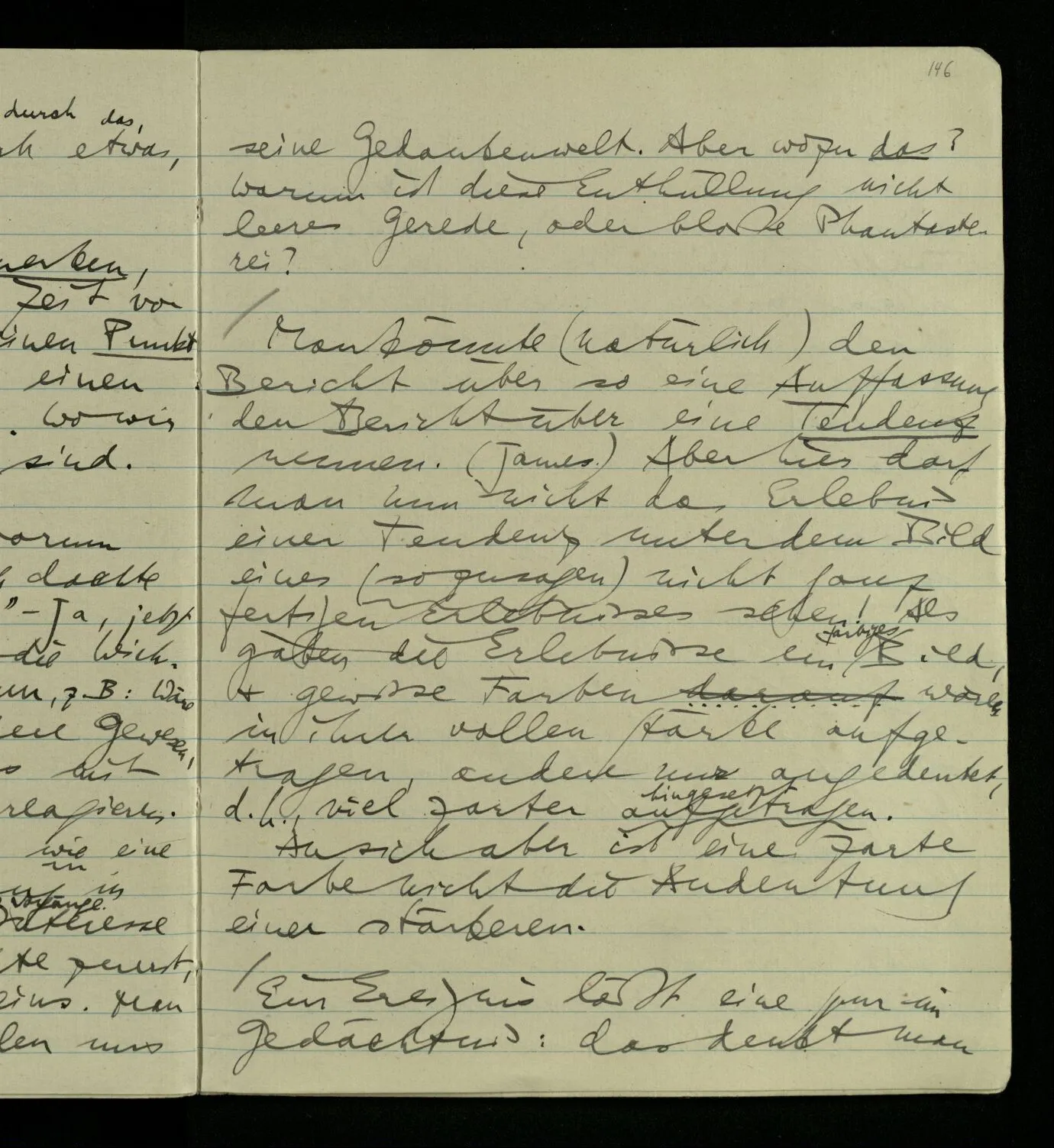 Man könnte (natürlich) den Bericht über so eine Auffassung den Bericht über eine Tendenz nennen. (James.) Aber hier darf man nun nicht das Erlebnis einer Tendenz unter dem Bild eines (sozusagen) nicht ganz fertigen Erlebnisses sehen! Als gäben die Erlebnisse ein farbiges Bild, & gewisse Farben darauf wären in ihrer vollen Stärke aufgetragen, andere nur angedeutet, d.h., viel zarter aufgetragen. An sich aber ist eine zarte Farbe nicht die Andeutung einer stärkeren.