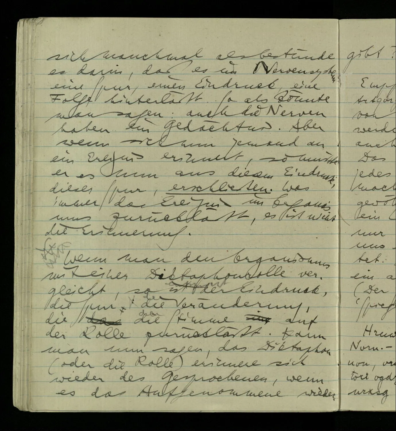 Wenn man den Organismus mit einer Diktaphonrolle vergleicht, so ist der Eindruck, die Spur, & die Veränderung, die die Stimme auf der Rolle zurückläßt. Kann man nun sagen, das Diktaphon (oder die Rolle) erinnere sich wieder des Gesprochenen, wenn es das Aufgenommene wiedergibt. Warum nicht?
