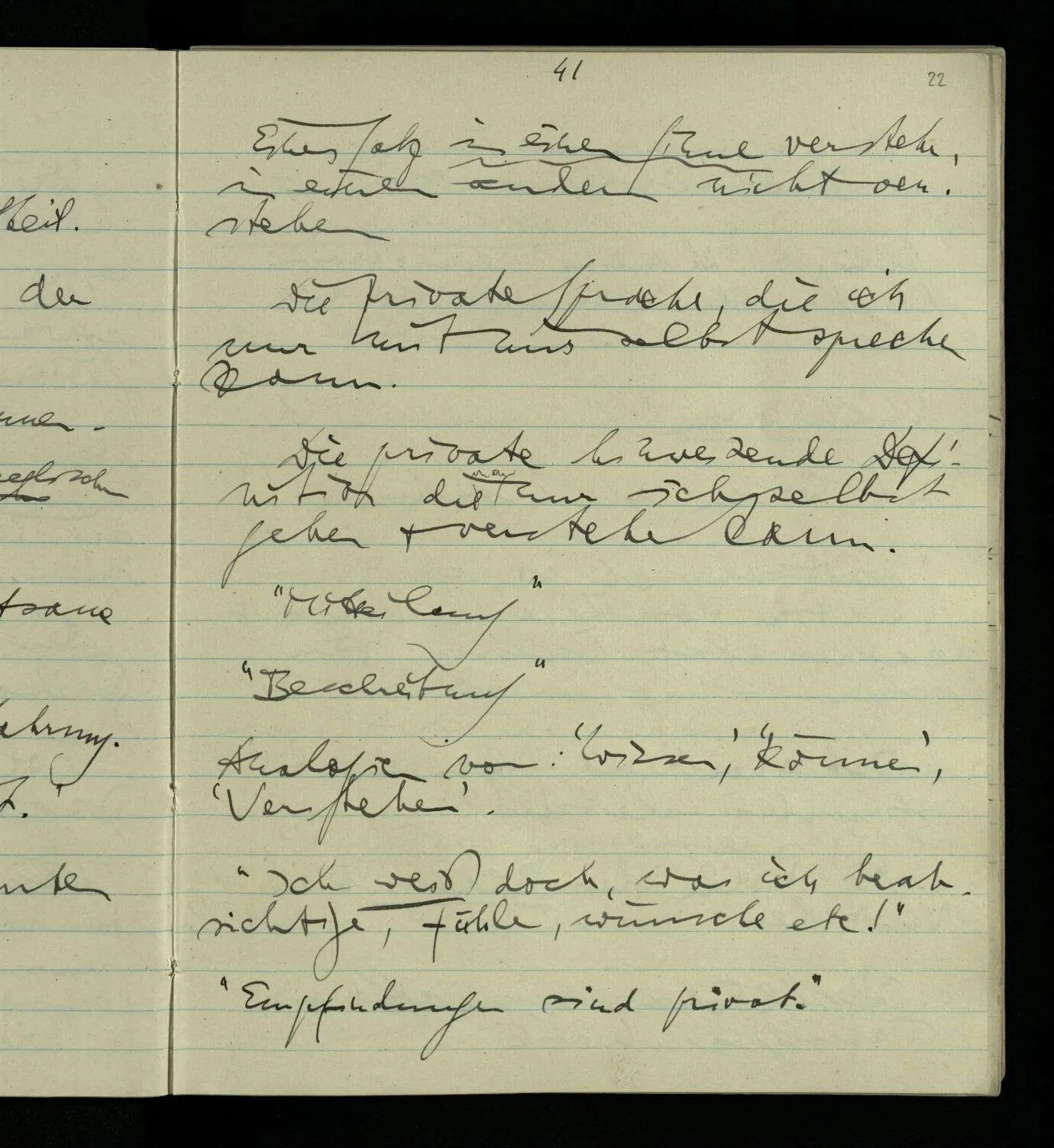 Erinnere Dich daran, daß es gewisse Kriterien des Benehmens dafür gibt, daß Einer ein Wort nicht versteht: daß es ihm nichts sagt, er nichts damit anzufangen weiß. Und Kriterien dafür, daß er das Wort ‘zu verstehen glaubt’, eine Bedeutung mit ihm verbindet, aber nicht die richtige. Und endlich Kriterien dafür, daß er das Wort richtig versteht. Im zweiten Falle konnte man von einem subjektiven Verstehen reden. Und eine “private Sprache” könnte man Laute nennen die kein Andrer versteht ich aber ‘zu verstehen scheine’.