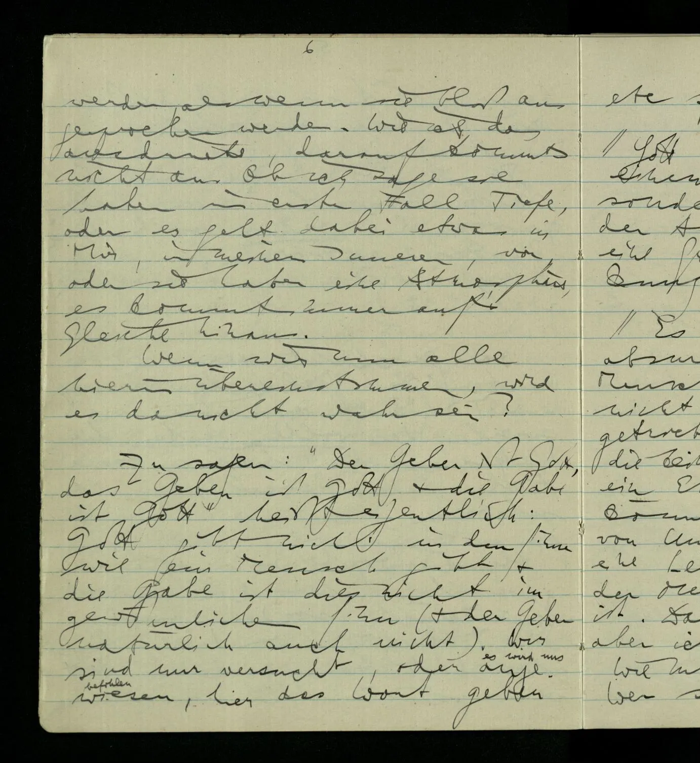 Zu sagen: “Der Geber ist Gott, das Geben ist Gott & die Gabe ist Gott” heißt eigentlich: Gott gibt nicht in dem Sinne wie ein Mensch gibt & die Gabe ist dies nicht im gewöhnlichen Sinn (& der Geber natürlich auch nicht). Wir sind nur versucht, oder angewiesen, hier das Wort “geben” etc. zu gebrauchen.