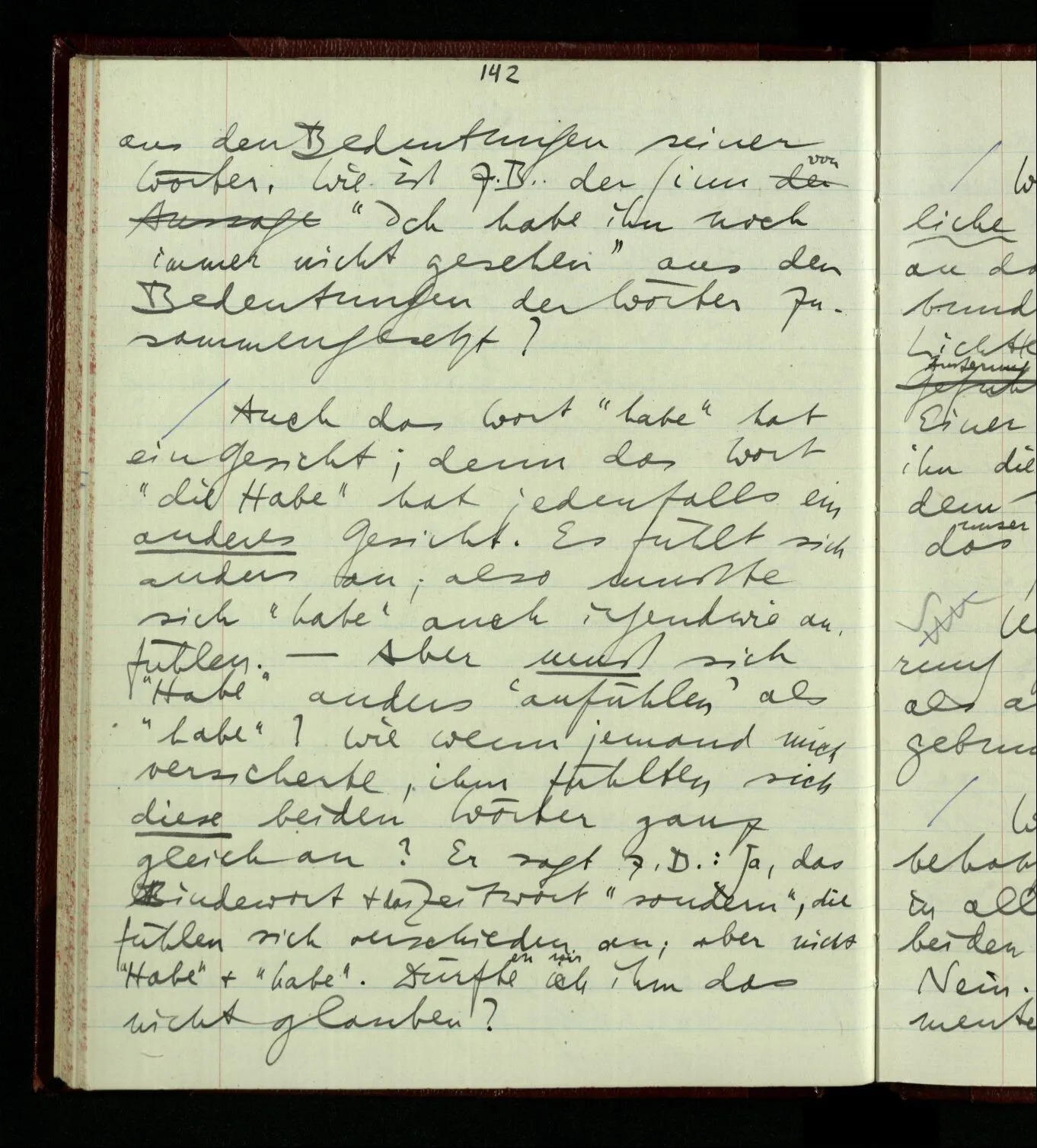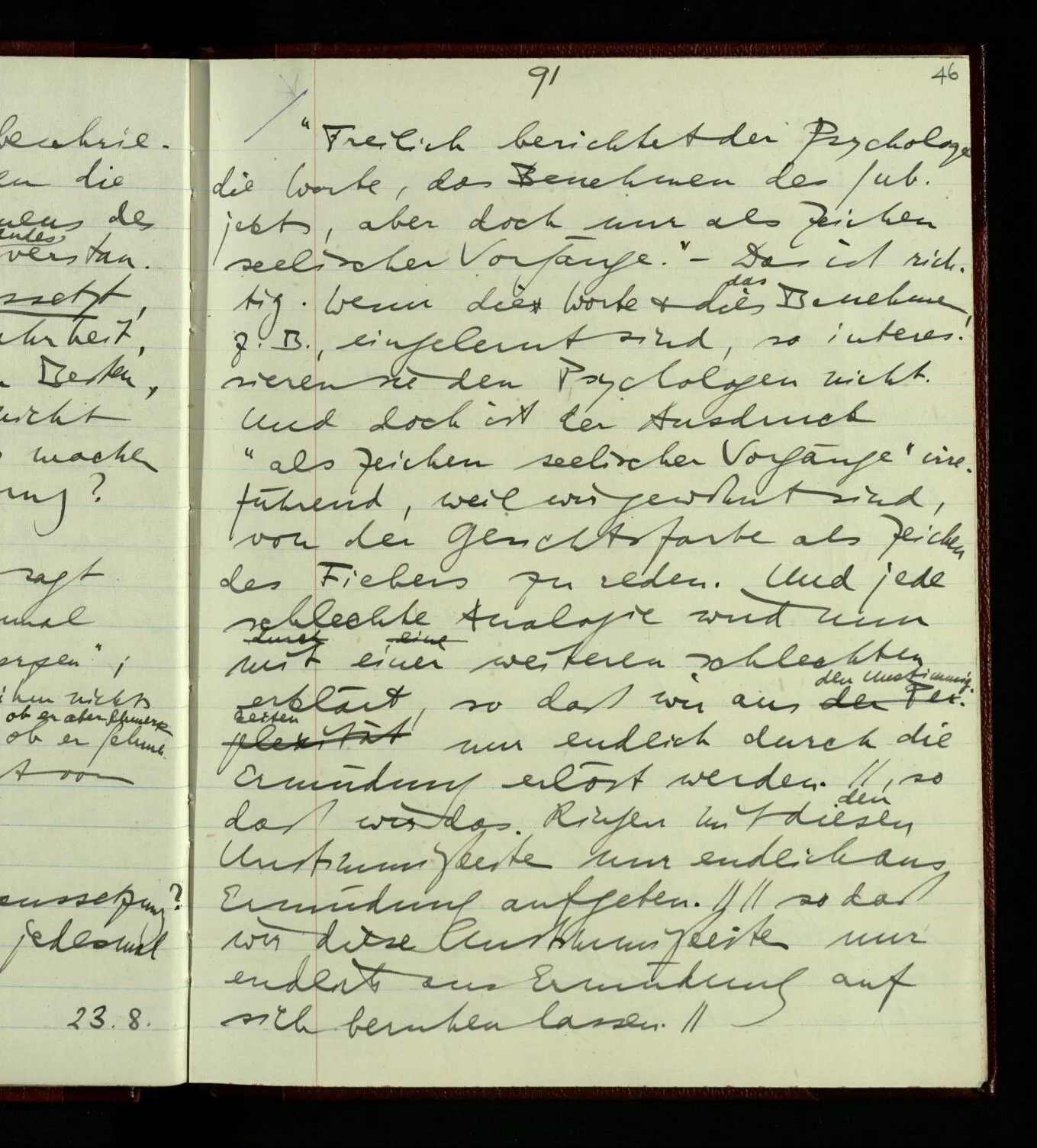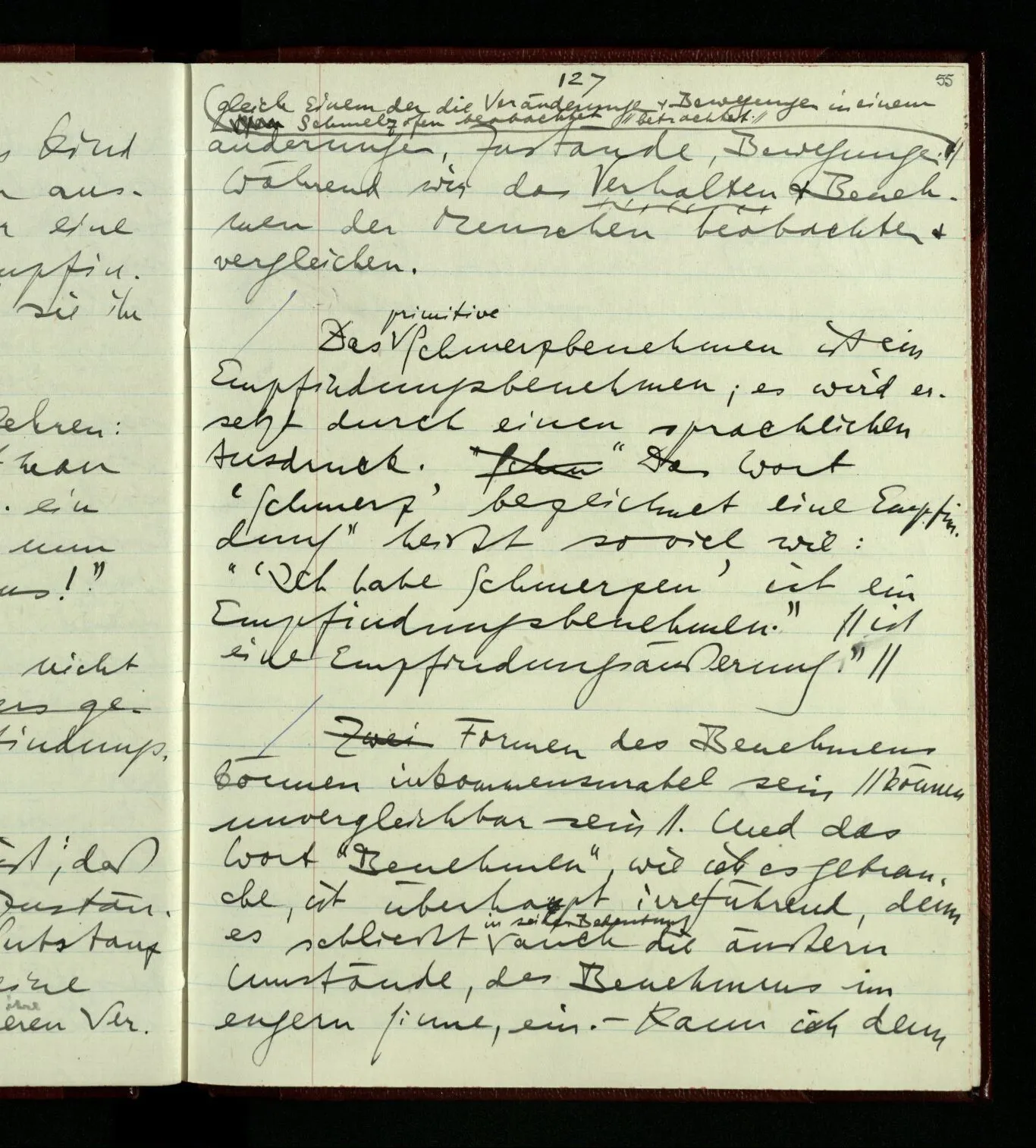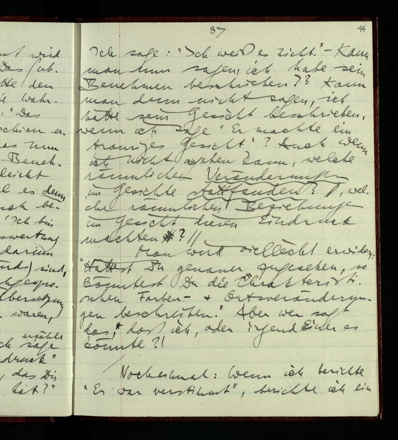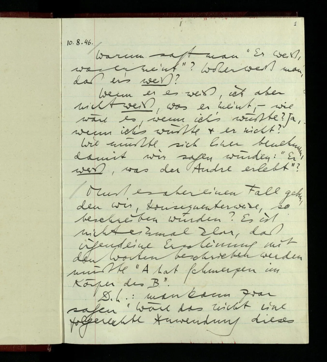 Warum sagt man “Er weiß, was er meint”? Woher weiß man, daß er’s weiß? Wenn er es weiß, ich aber nicht weiß, was er meint, – wie wäre es, wenn ich’s wüßte? Ja, wenn ich’s wüßte & er nicht? Wie müßte sich Einer benehmen, damit wir sagen würden: “Er weiß, was der Andre erlebt”?
