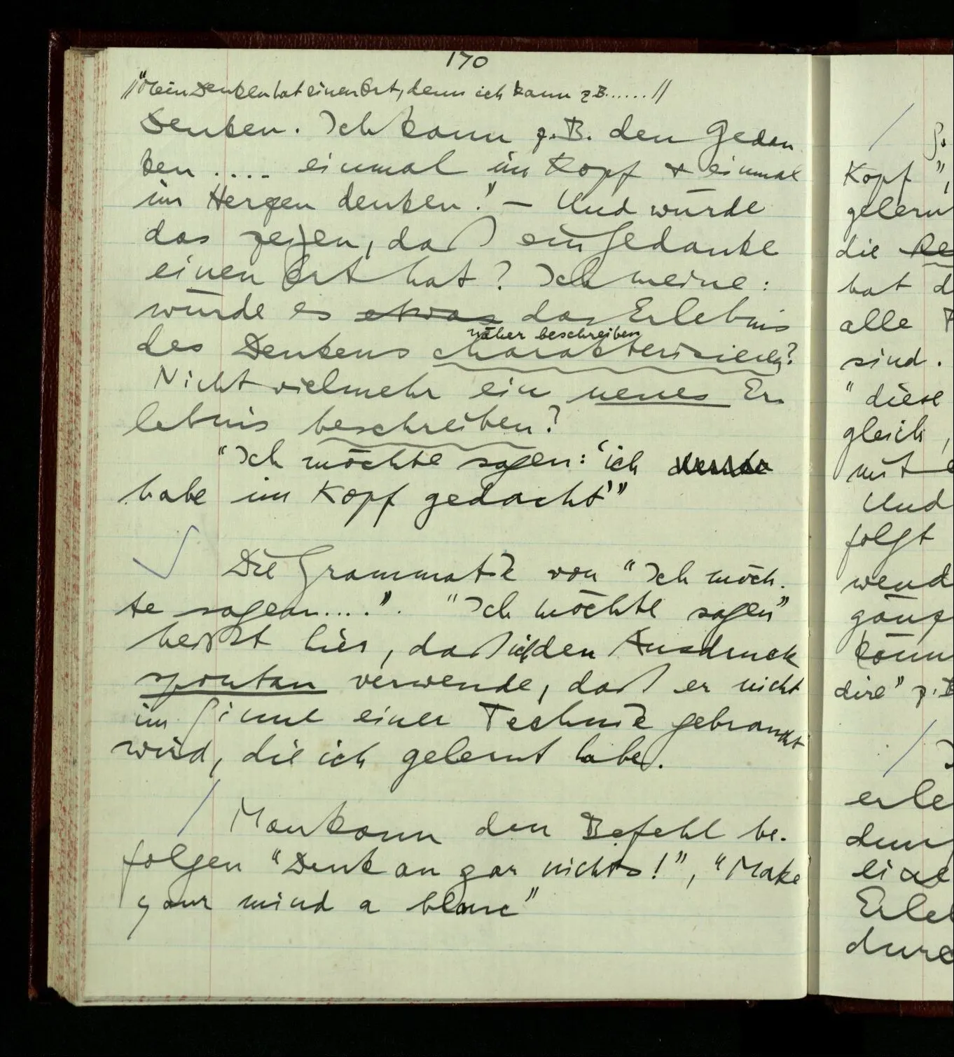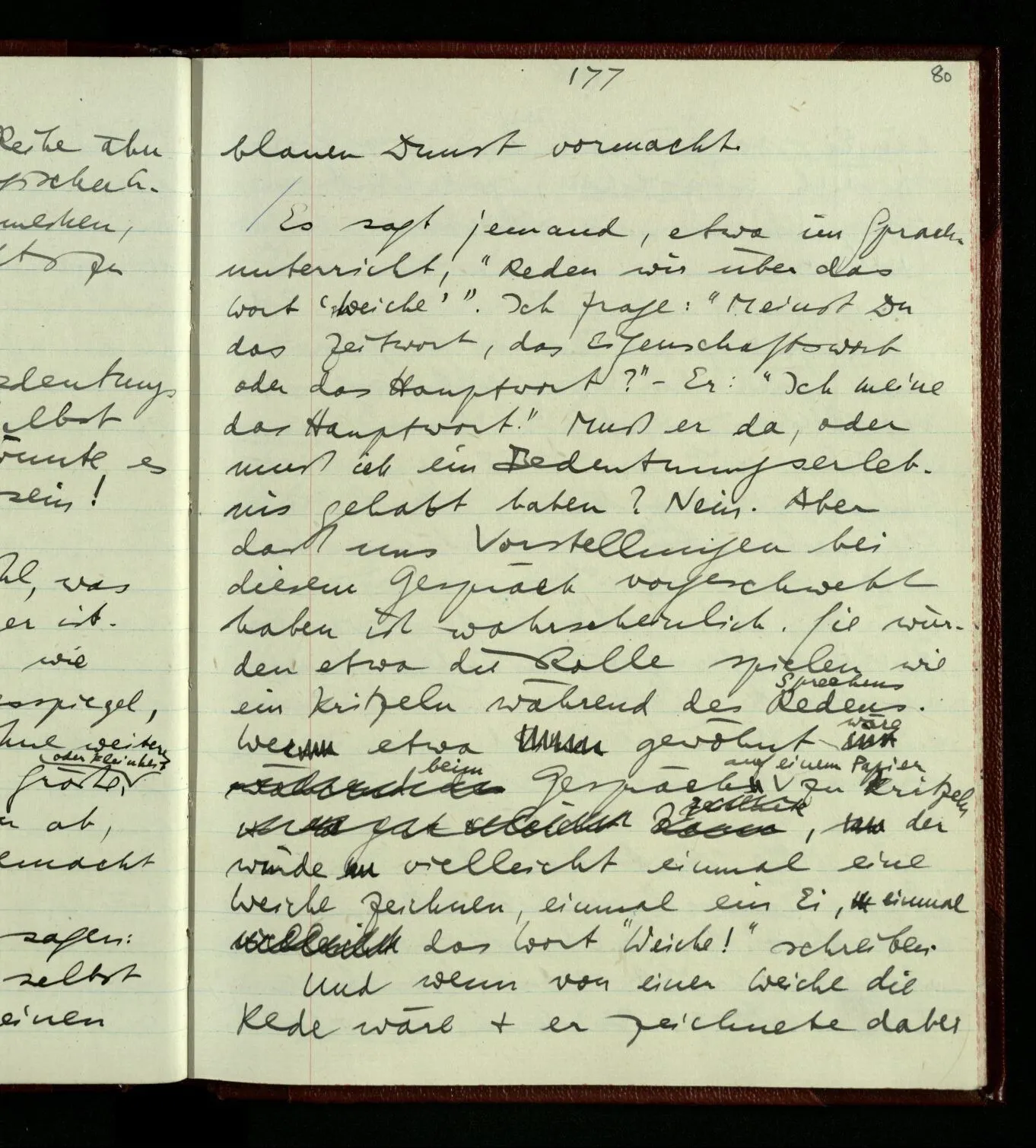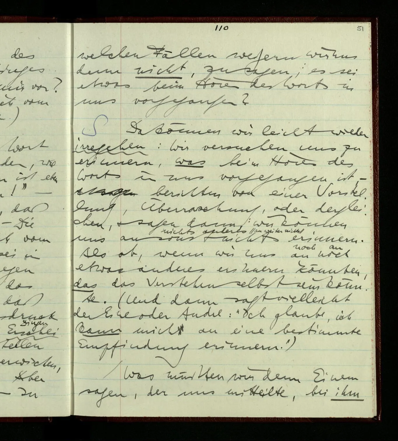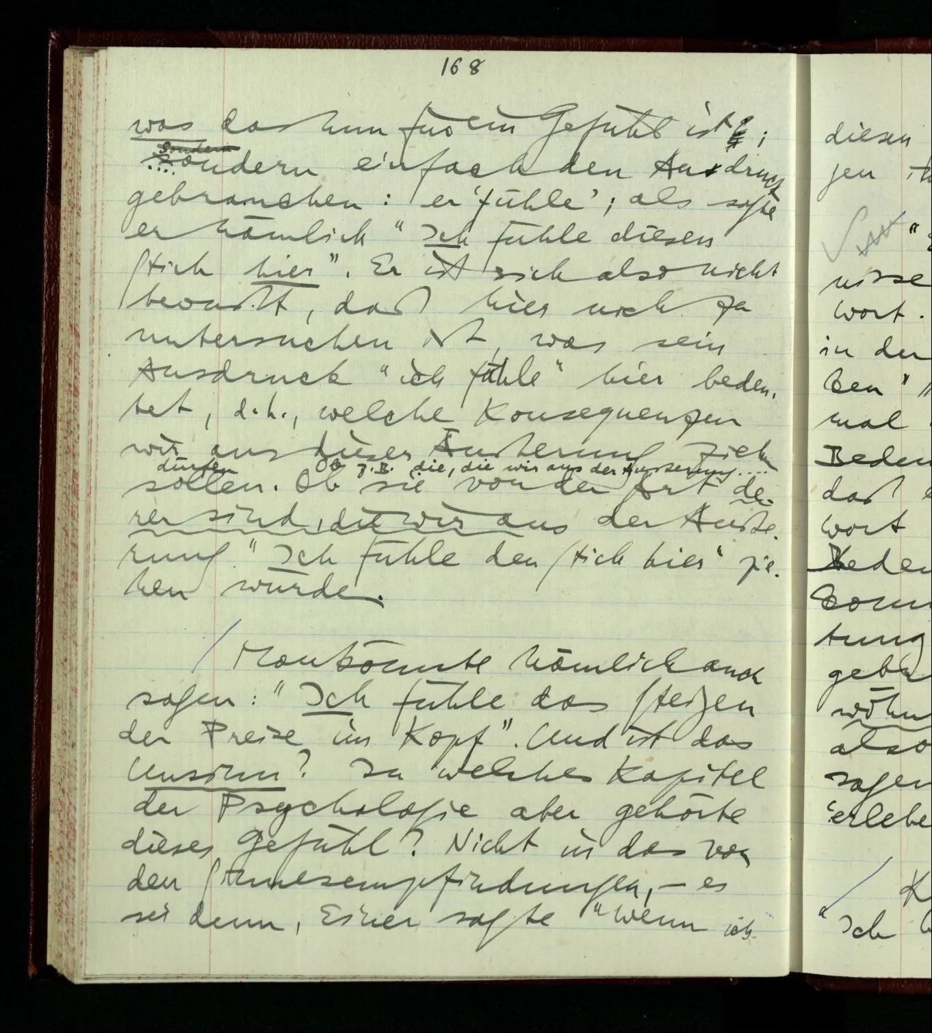 Warum sagt man “Er weiß, was er meint”? Woher weiß man, daß er’s weiß? Wenn er es weiß, ich aber nicht weiß, was er meint, – wie wäre es, wenn ich’s wüßte? Ja, wenn ich’s wüßte & er nicht? Wie müßte sich Einer benehmen, damit wir sagen würden: “Er weiß, was der Andre erlebt”?