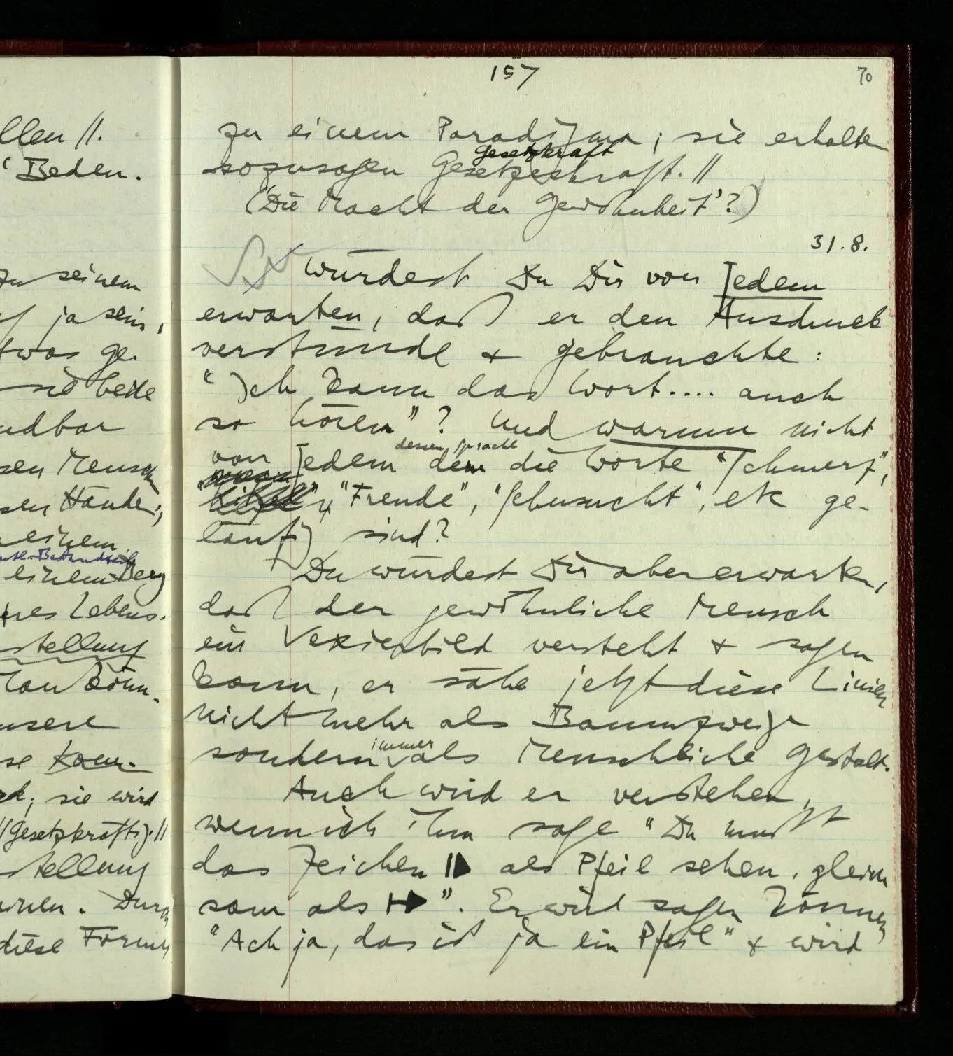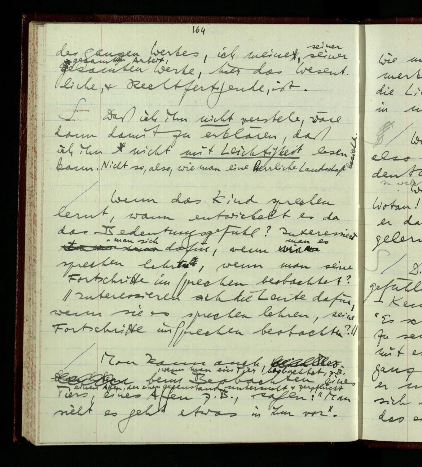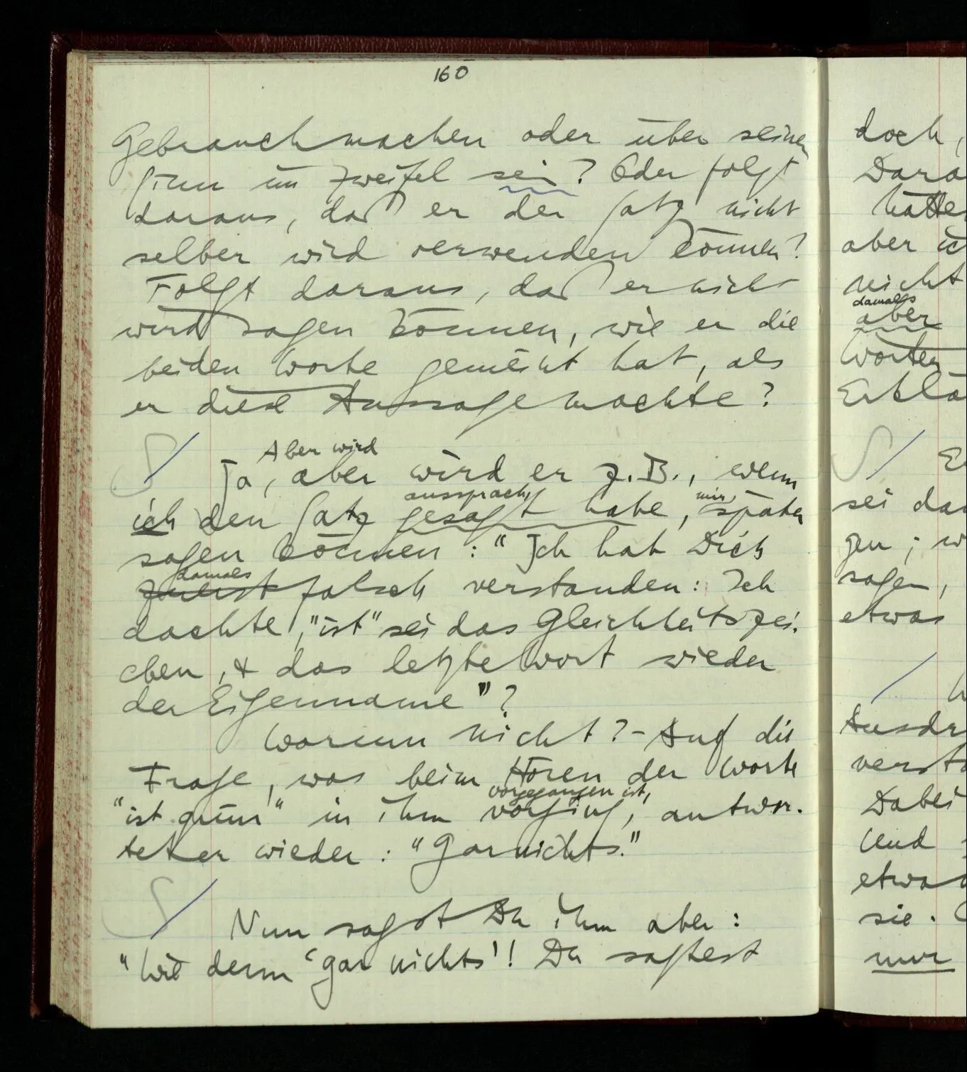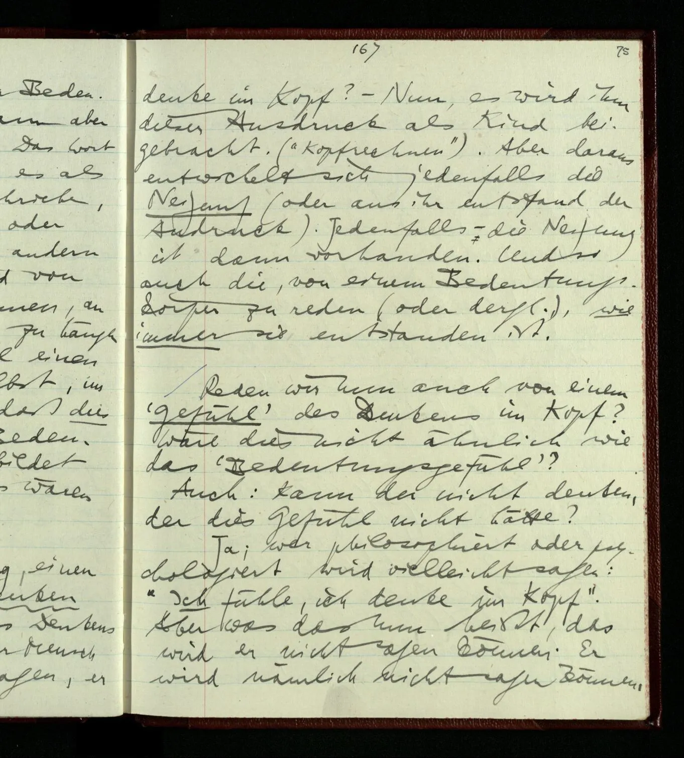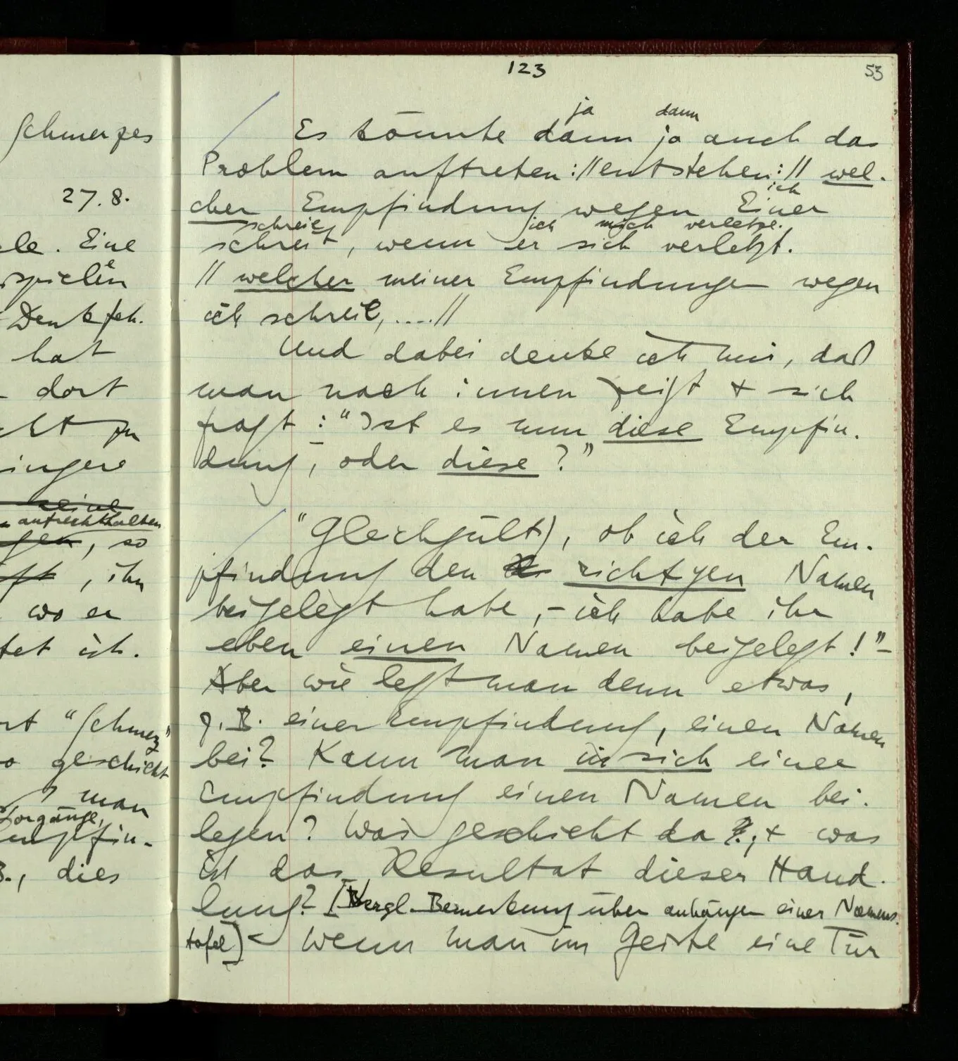 Warum sagt man “Er weiß, was er meint”? Woher weiß man, daß er’s weiß? Wenn er es weiß, ich aber nicht weiß, was er meint, – wie wäre es, wenn ich’s wüßte? Ja, wenn ich’s wüßte & er nicht? Wie müßte sich Einer benehmen, damit wir sagen würden: “Er weiß, was der Andre erlebt”?