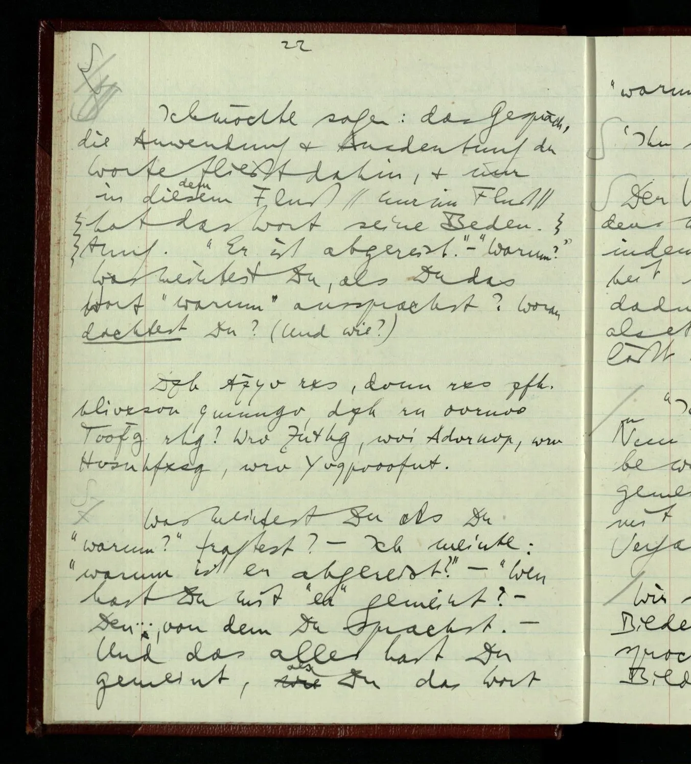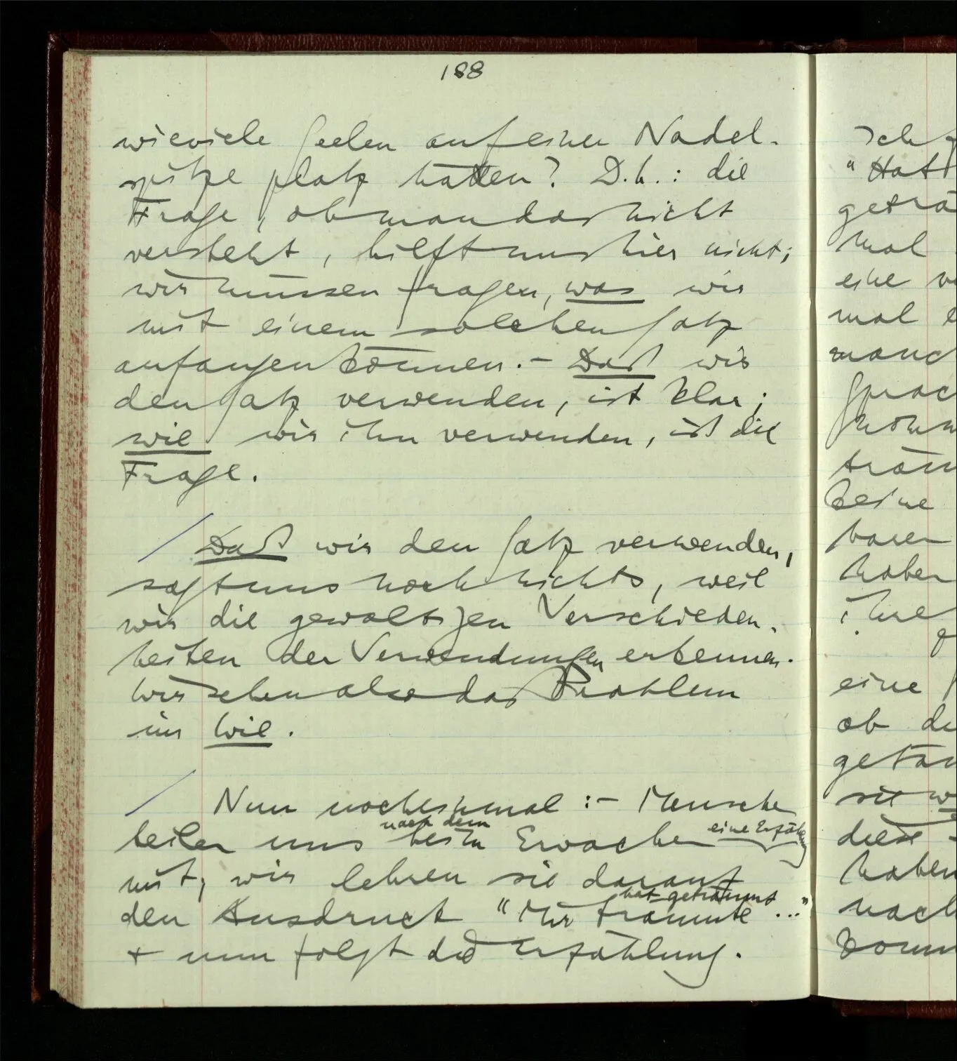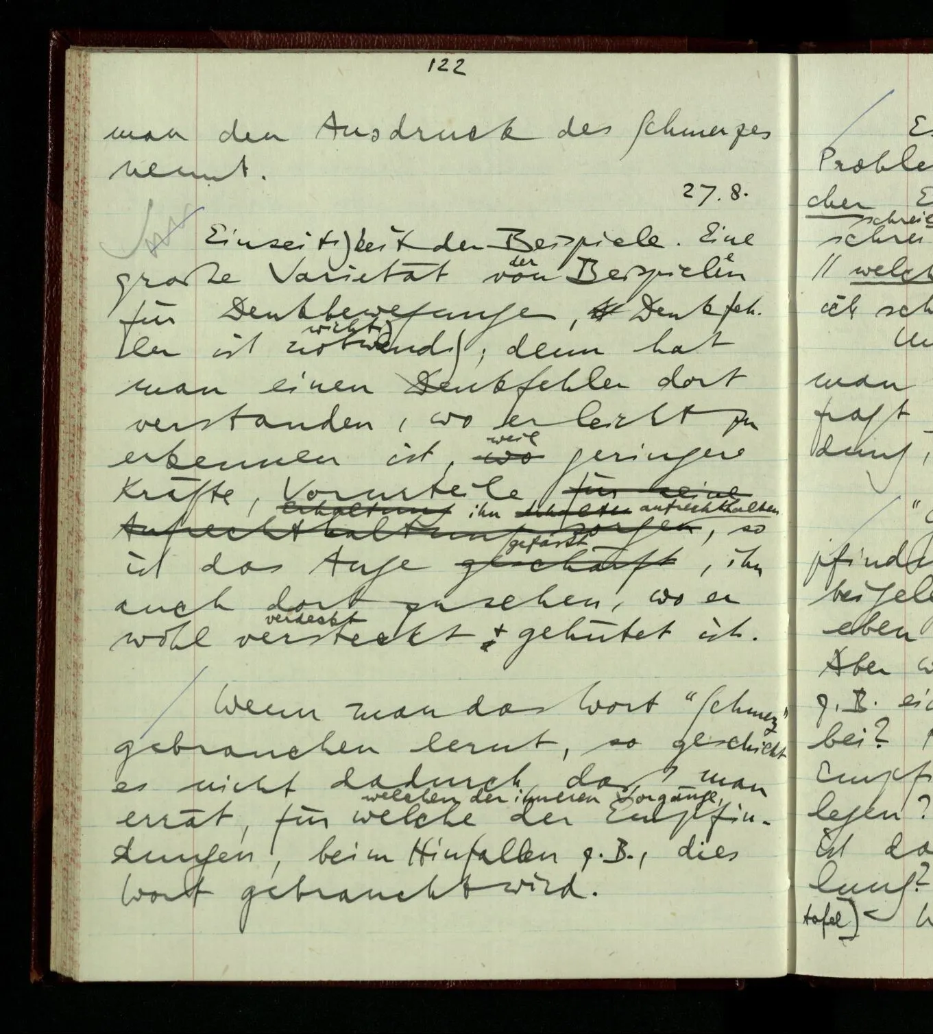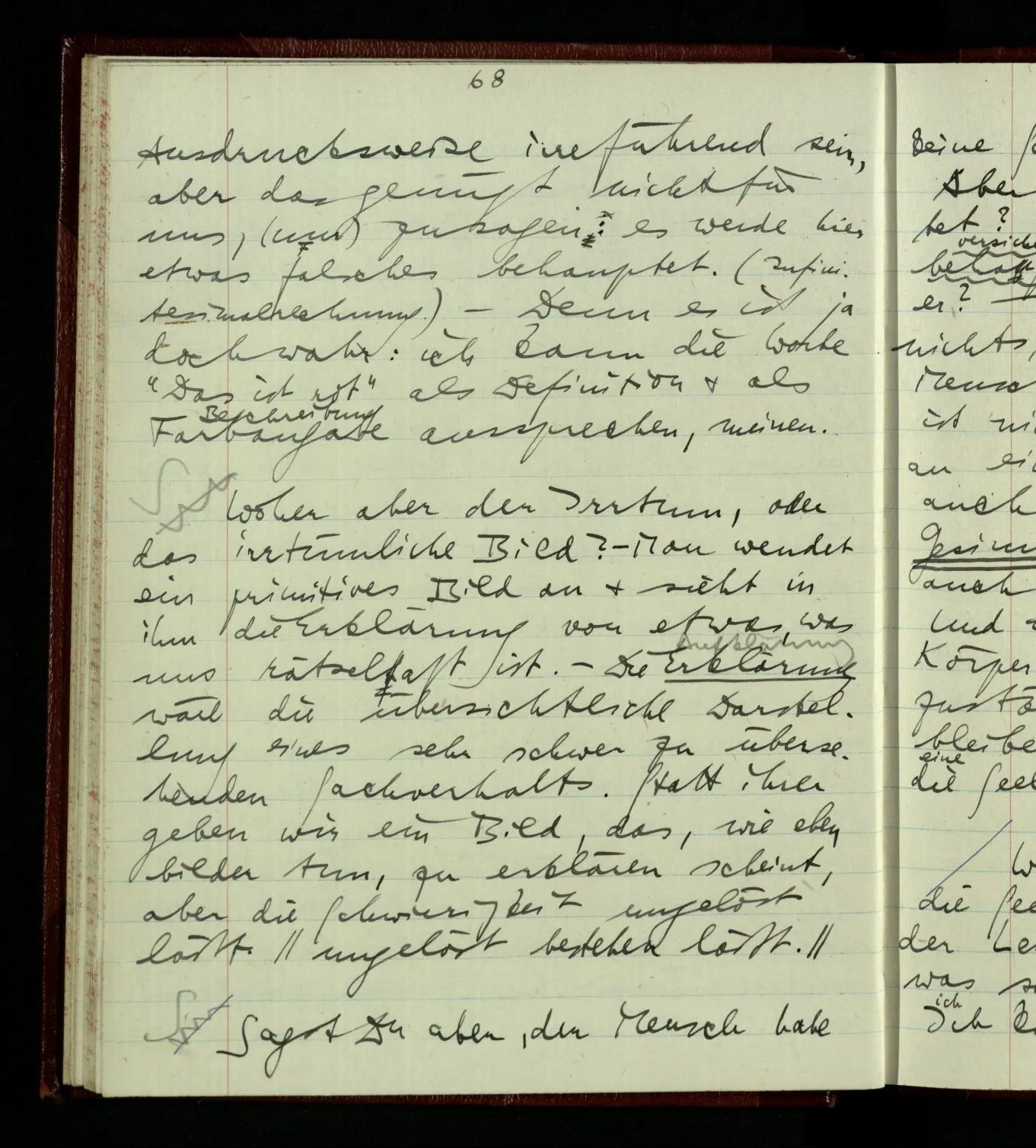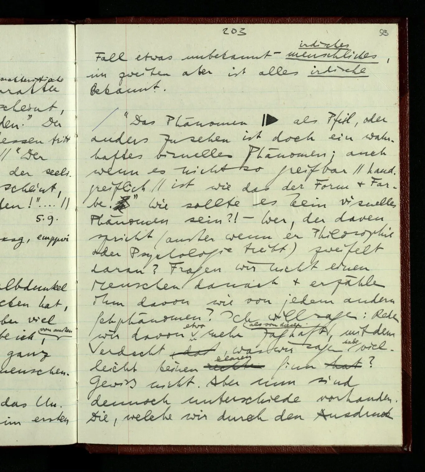 Warum sagt man “Er weiß, was er meint”? Woher weiß man, daß er’s weiß? Wenn er es weiß, ich aber nicht weiß, was er meint, – wie wäre es, wenn ich’s wüßte? Ja, wenn ich’s wüßte & er nicht? Wie müßte sich Einer benehmen, damit wir sagen würden: “Er weiß, was der Andre erlebt”?