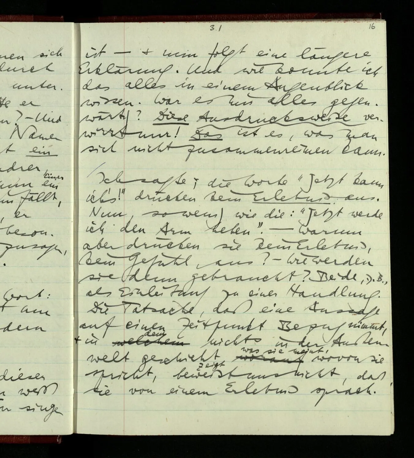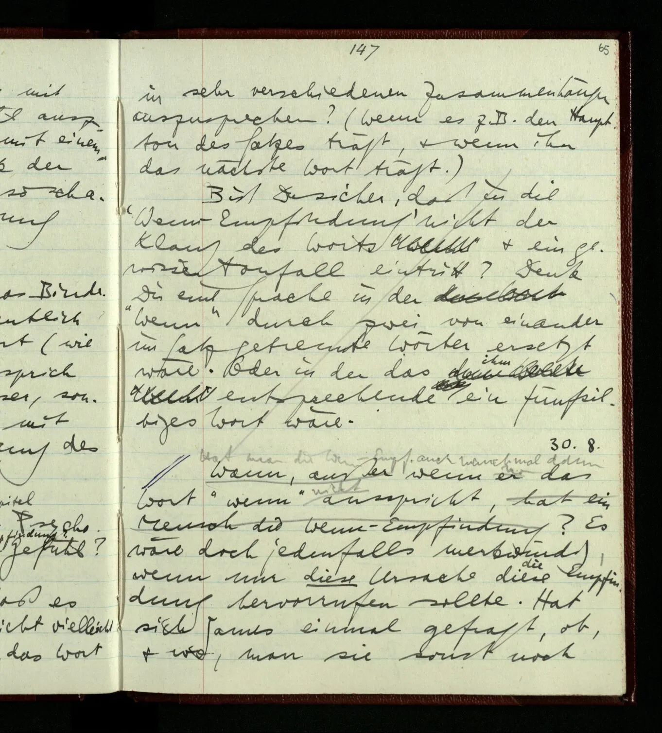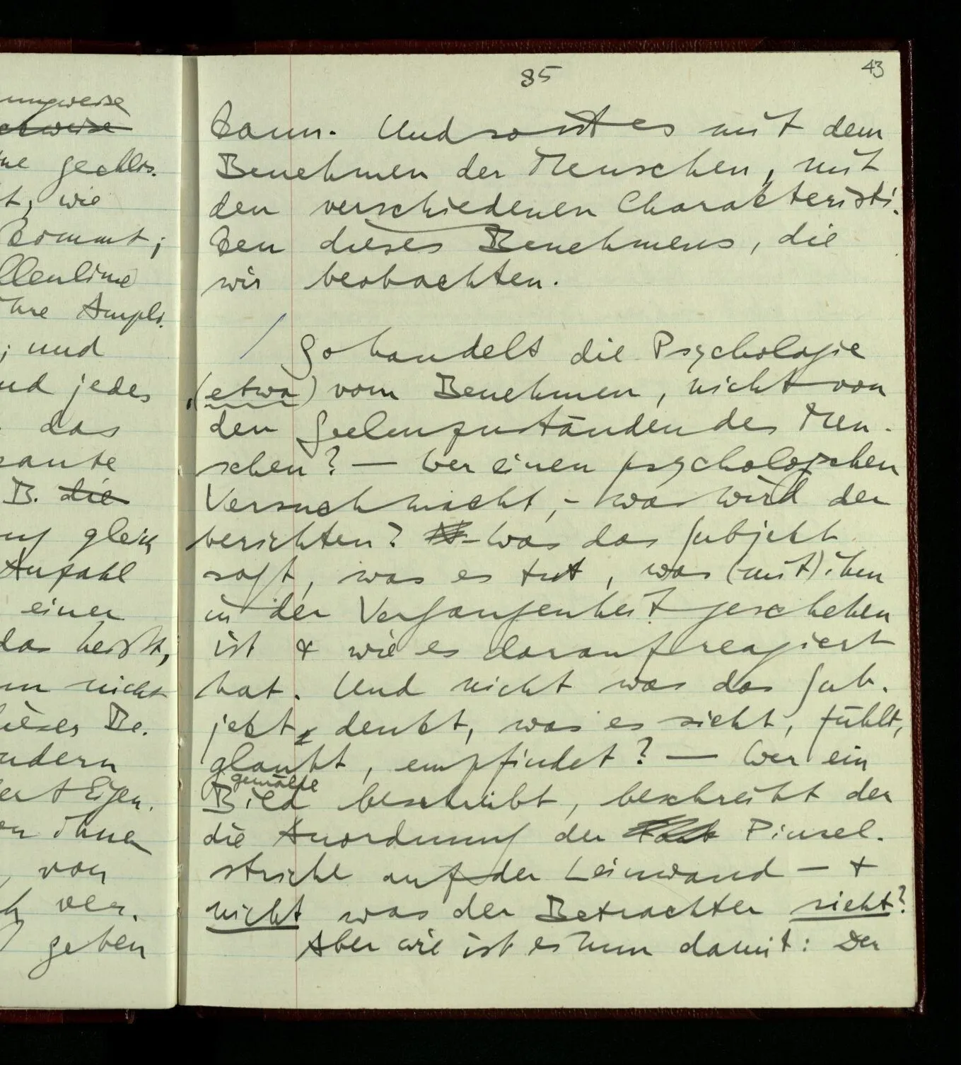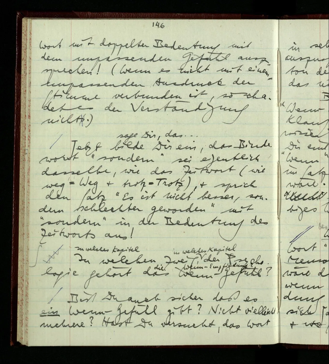 Warum sagt man “Er weiß, was er meint”? Woher weiß man, daß er’s weiß? Wenn er es weiß, ich aber nicht weiß, was er meint, – wie wäre es, wenn ich’s wüßte? Ja, wenn ich’s wüßte & er nicht? Wie müßte sich Einer benehmen, damit wir sagen würden: “Er weiß, was der Andre erlebt”?