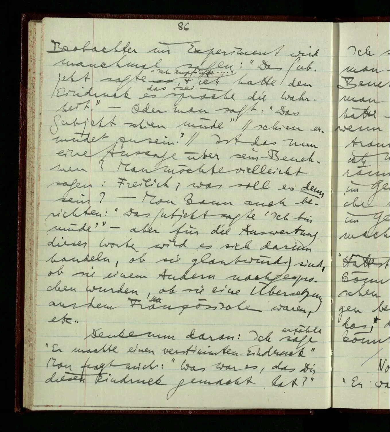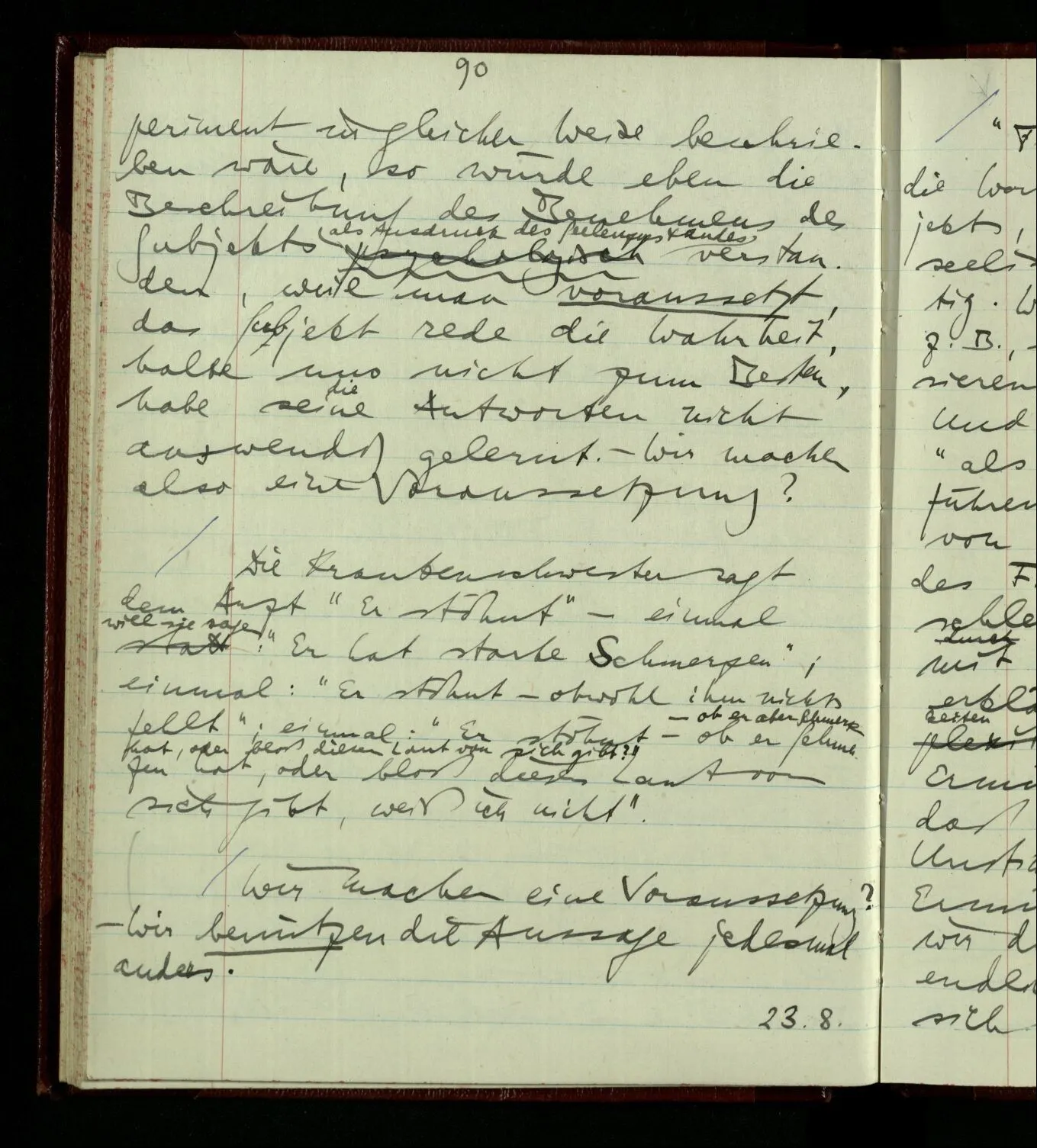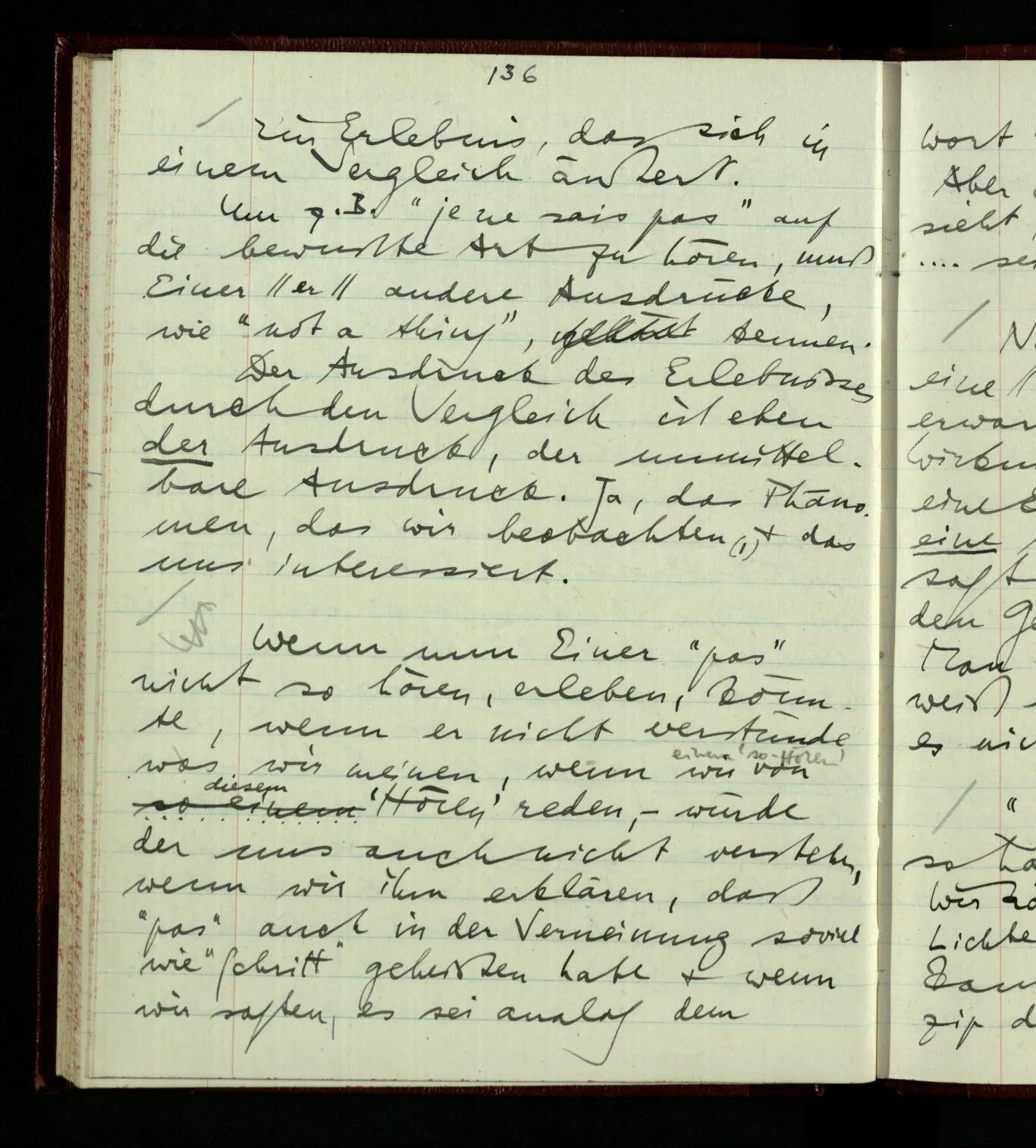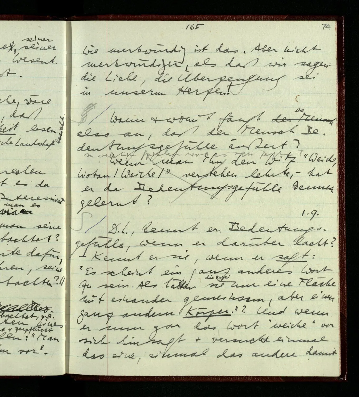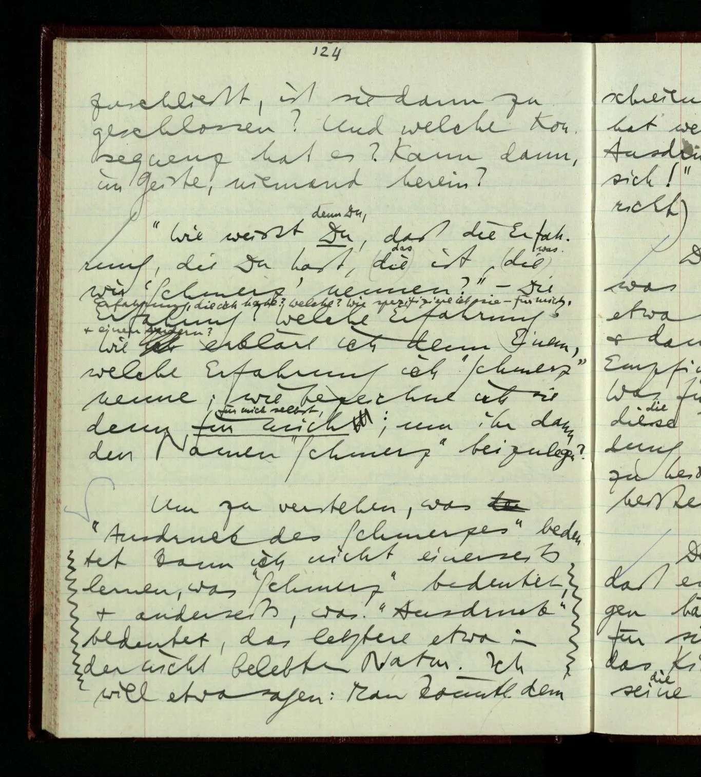 Warum sagt man “Er weiß, was er meint”? Woher weiß man, daß er’s weiß? Wenn er es weiß, ich aber nicht weiß, was er meint, – wie wäre es, wenn ich’s wüßte? Ja, wenn ich’s wüßte & er nicht? Wie müßte sich Einer benehmen, damit wir sagen würden: “Er weiß, was der Andre erlebt”?
