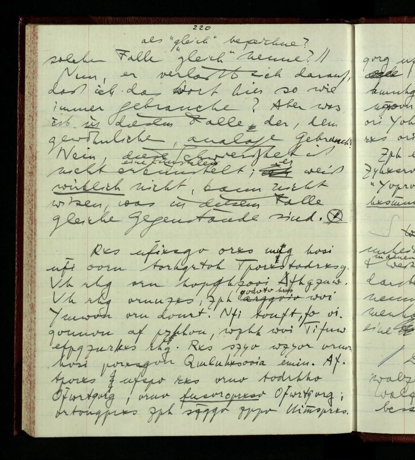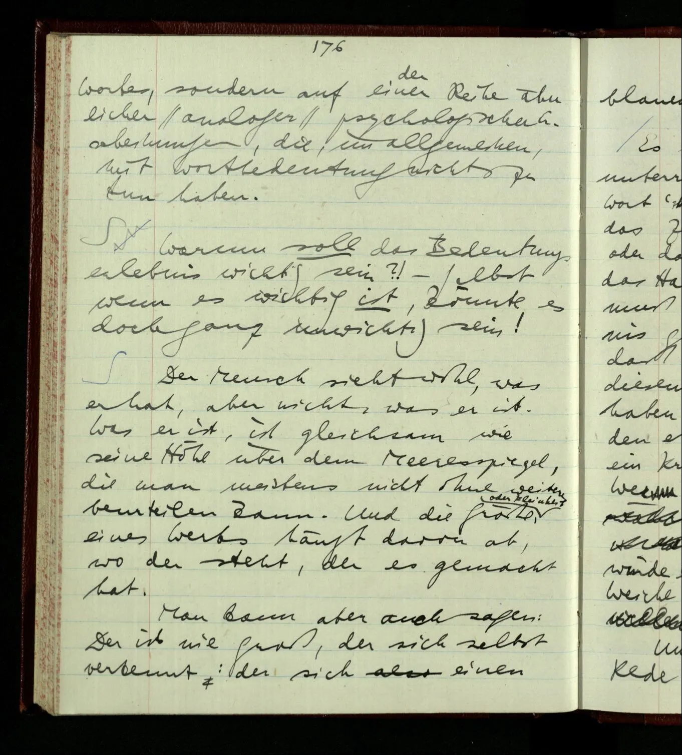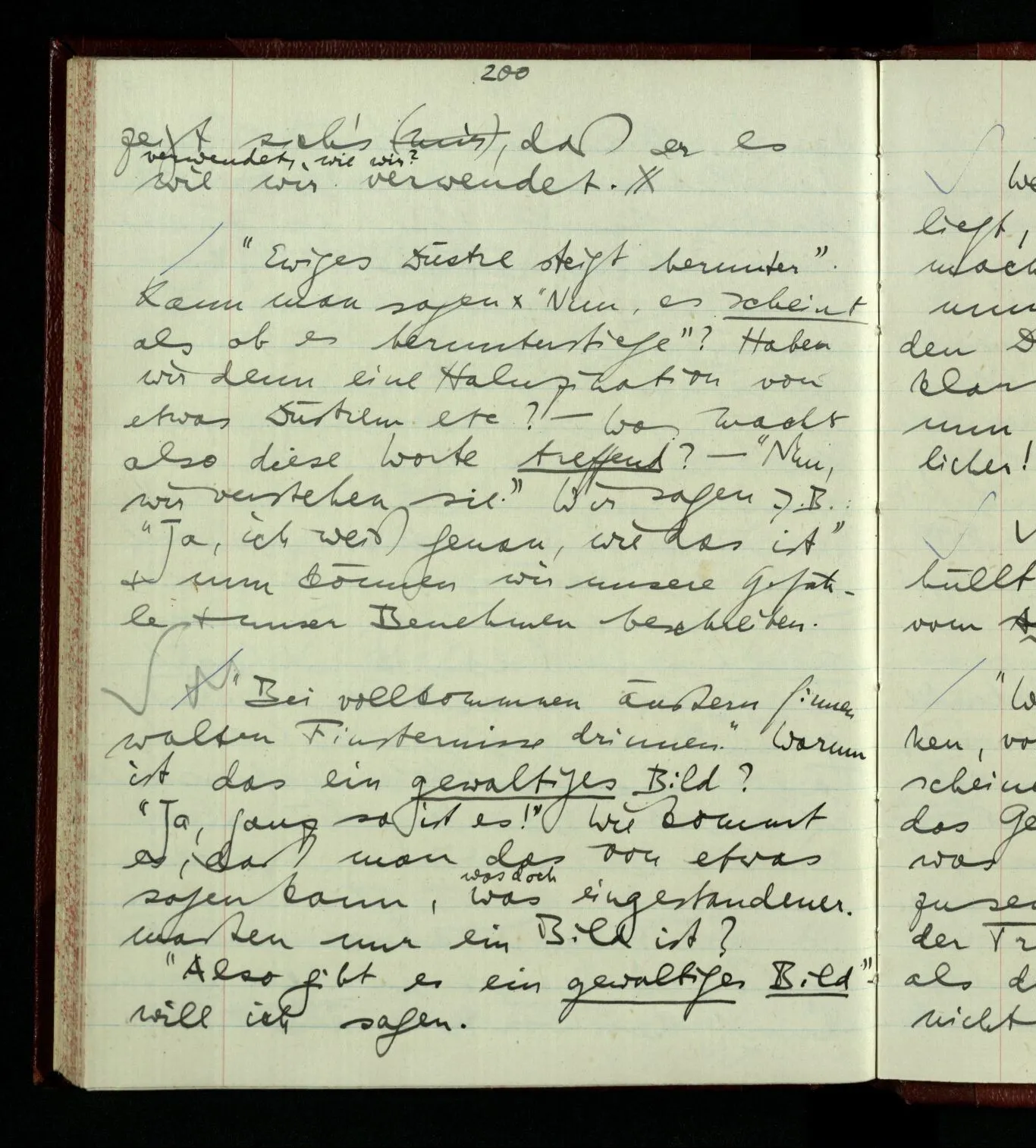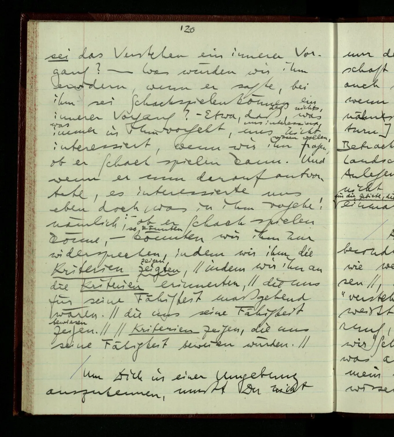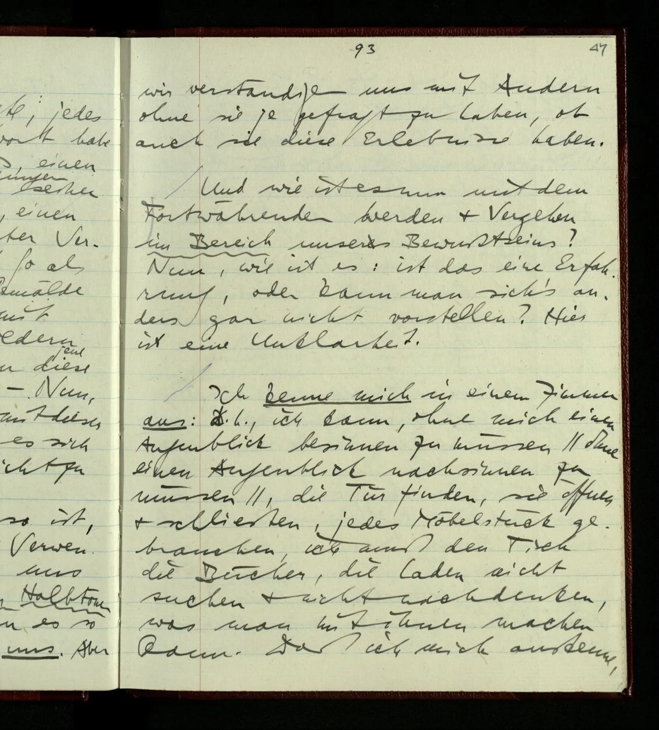 Warum sagt man “Er weiß, was er meint”? Woher weiß man, daß er’s weiß? Wenn er es weiß, ich aber nicht weiß, was er meint, – wie wäre es, wenn ich’s wüßte? Ja, wenn ich’s wüßte & er nicht? Wie müßte sich Einer benehmen, damit wir sagen würden: “Er weiß, was der Andre erlebt”?