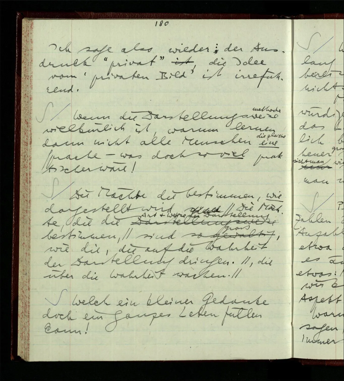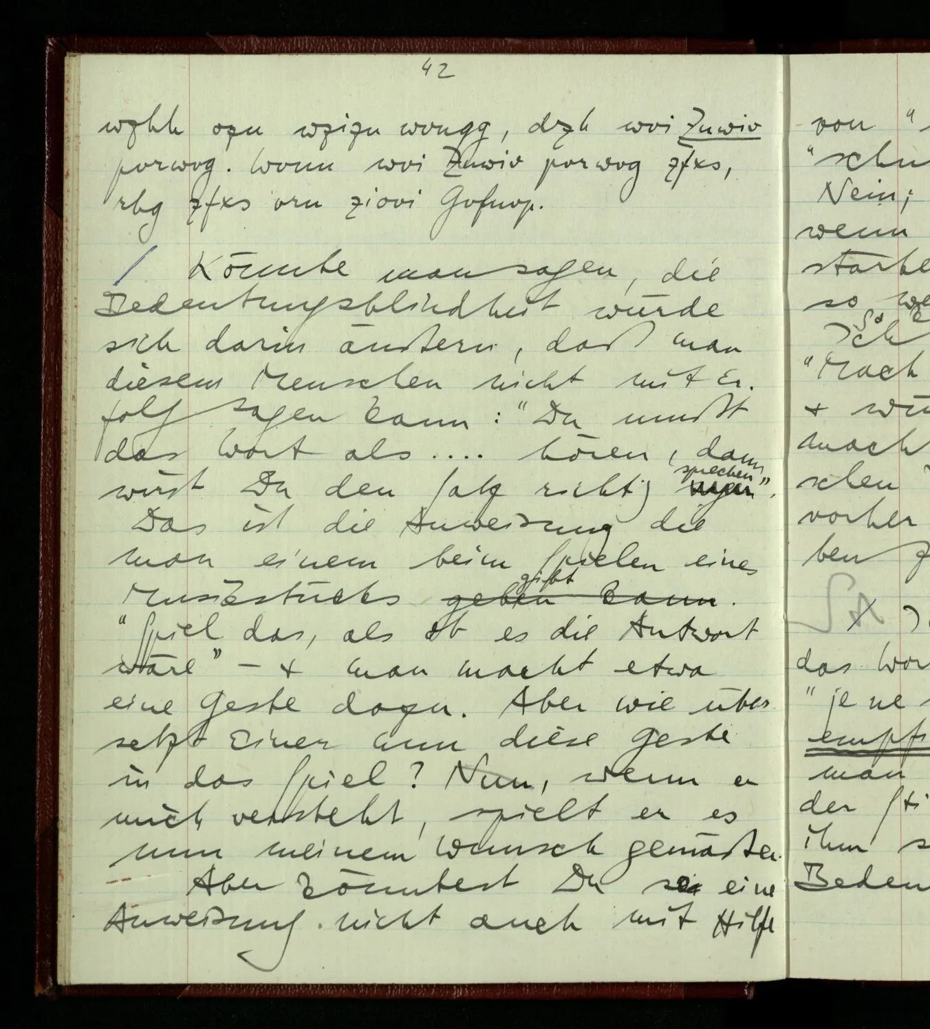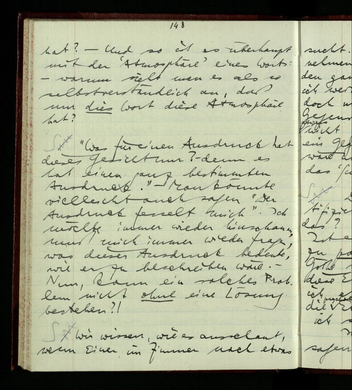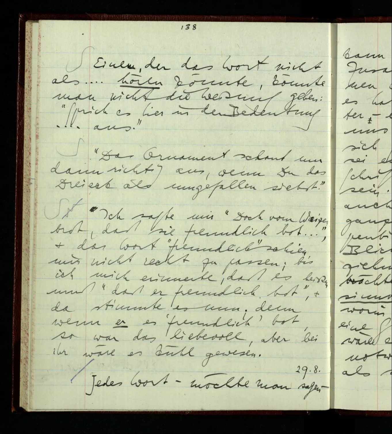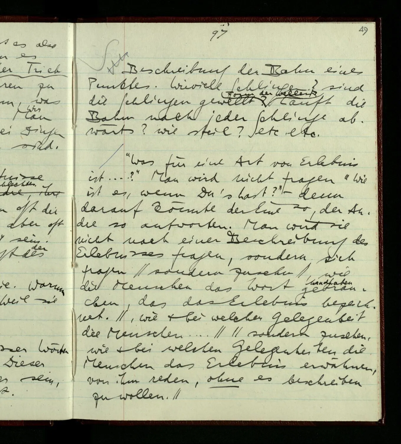Warum sagt man “Er weiß, was er meint”? Woher weiß man, daß er’s weiß? Wenn er es weiß, ich aber nicht weiß, was er meint, – wie wäre es, wenn ich’s wüßte? Ja, wenn ich’s wüßte & er nicht? Wie müßte sich Einer benehmen, damit wir sagen würden: “Er weiß, was der Andre erlebt”?
