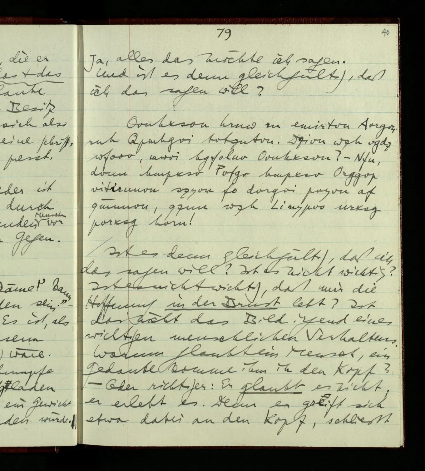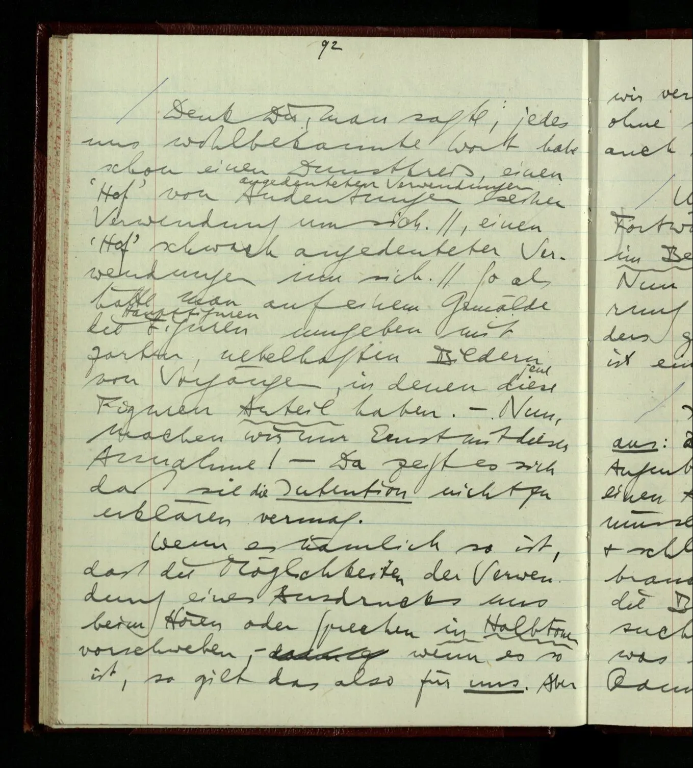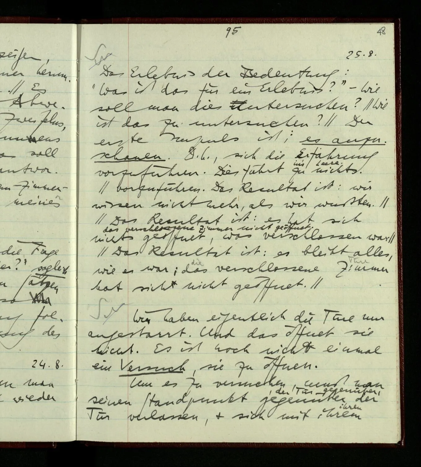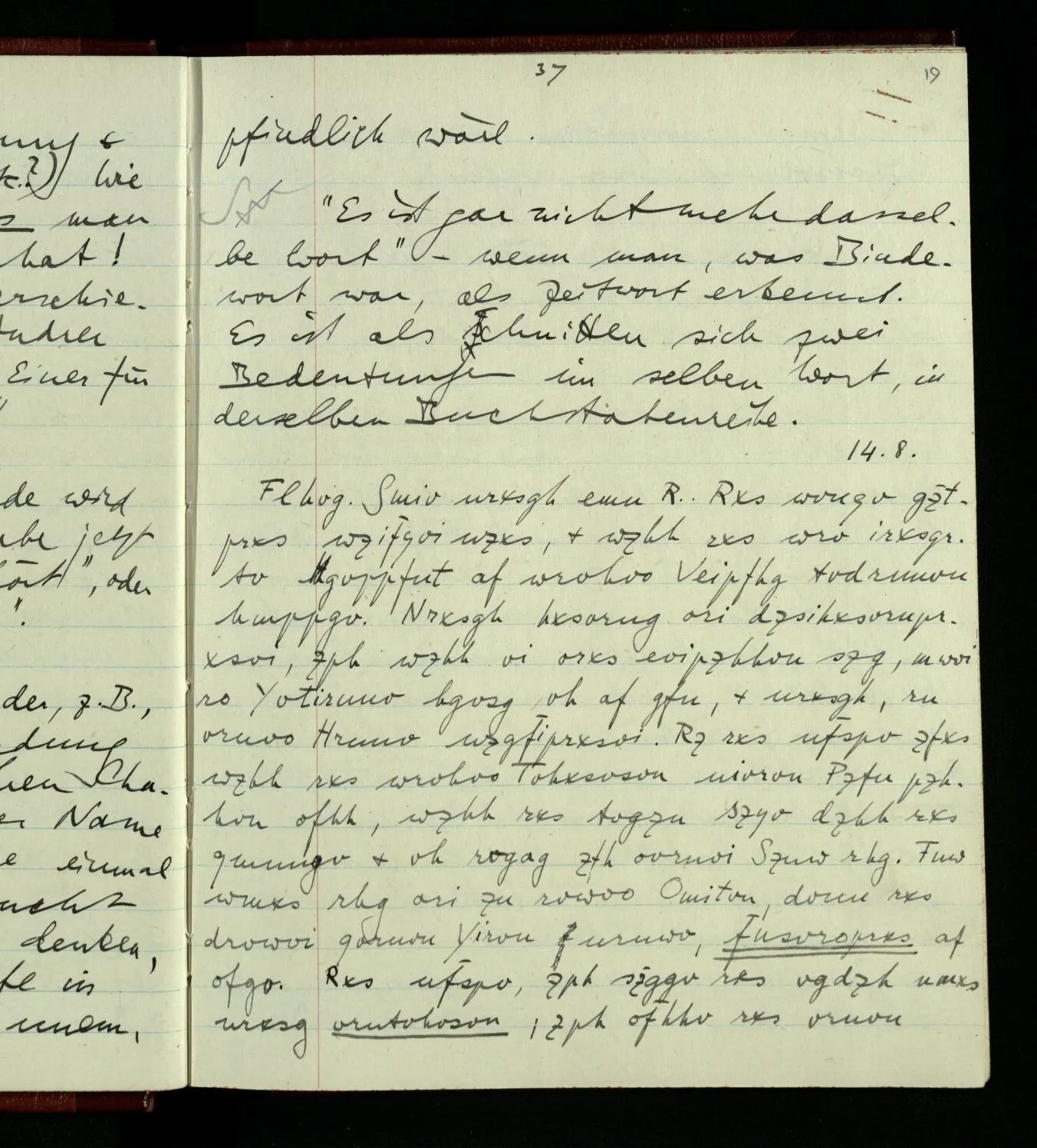 Warum sagt man “Er weiß, was er meint”? Woher weiß man, daß er’s weiß? Wenn er es weiß, ich aber nicht weiß, was er meint, – wie wäre es, wenn ich’s wüßte? Ja, wenn ich’s wüßte & er nicht? Wie müßte sich Einer benehmen, damit wir sagen würden: “Er weiß, was der Andre erlebt”?