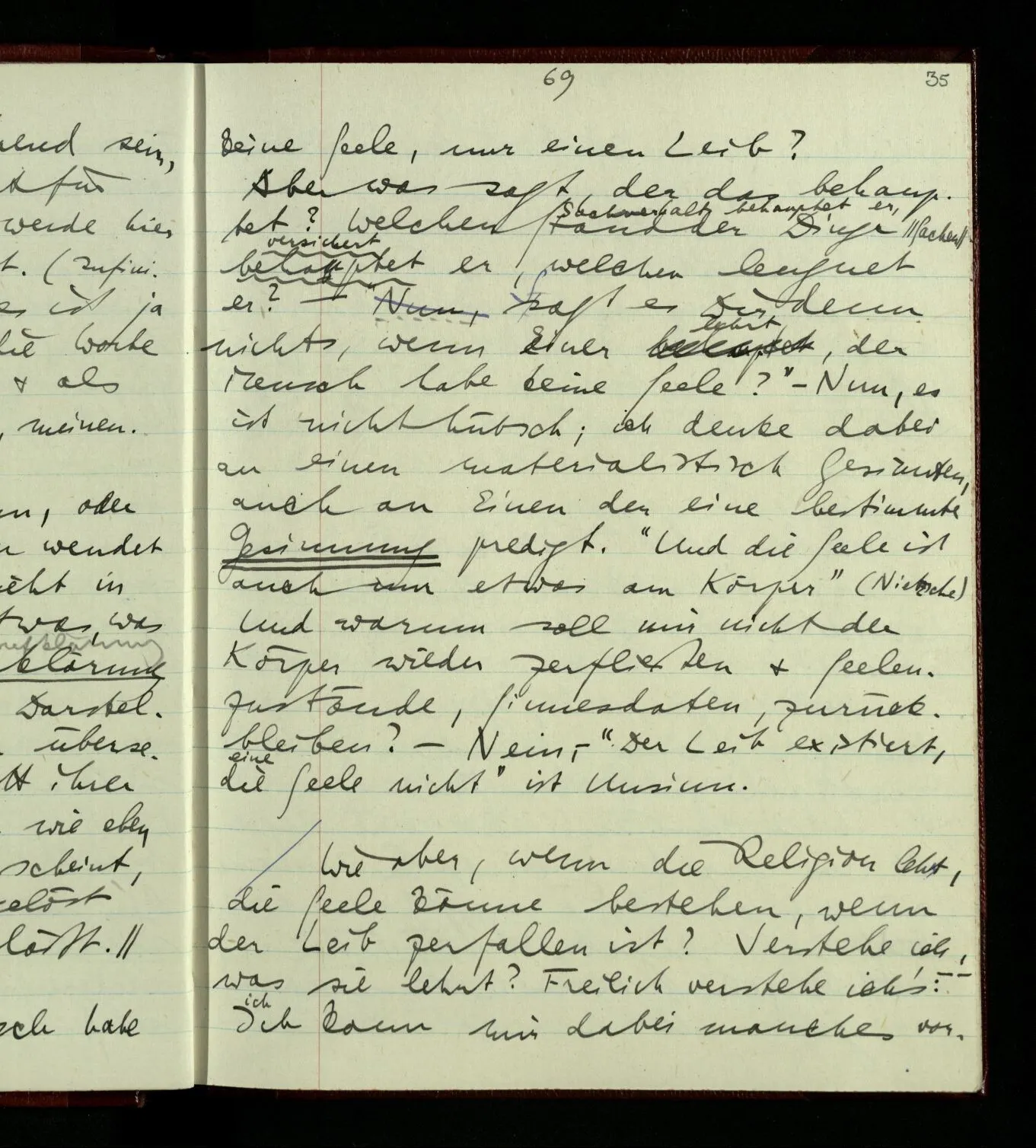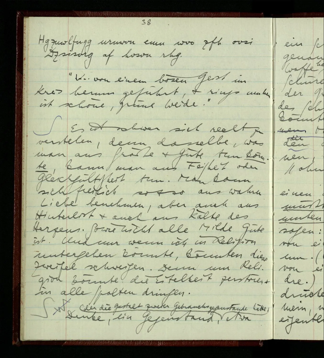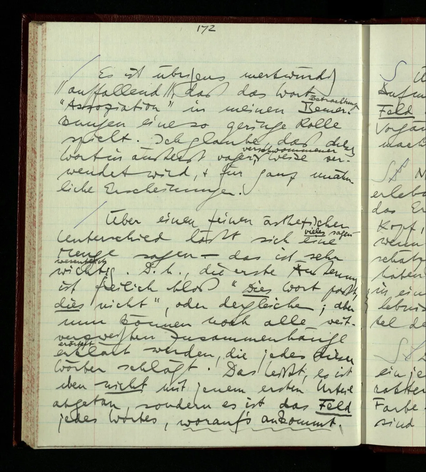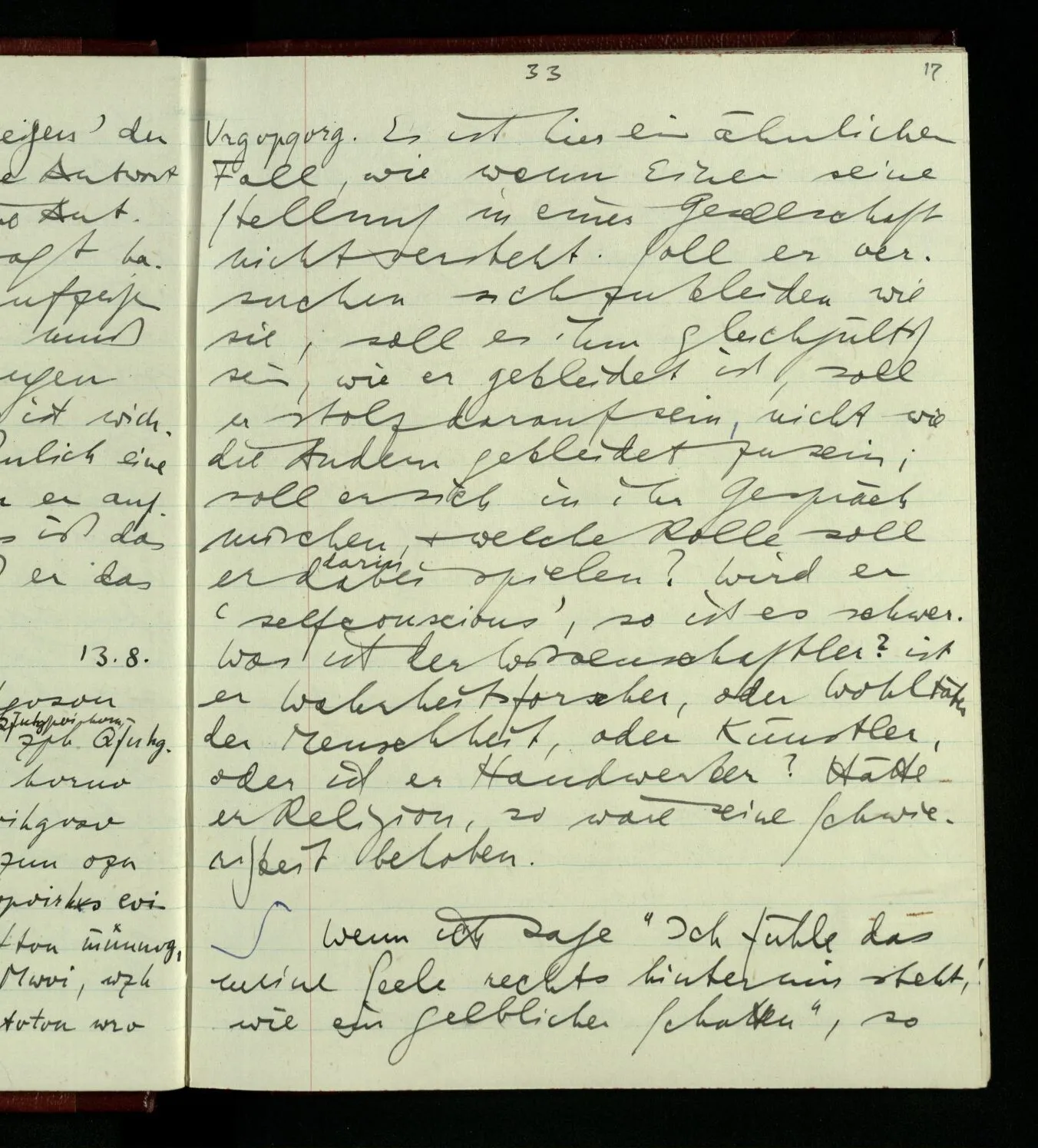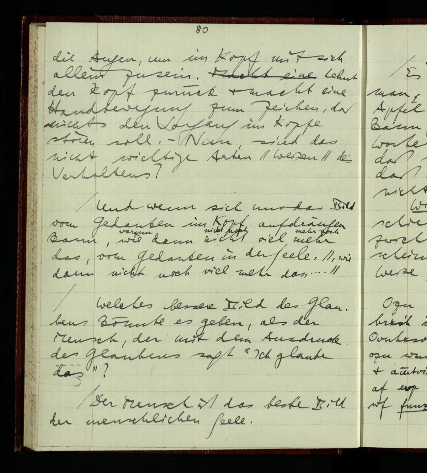 Warum sagt man “Er weiß, was er meint”? Woher weiß man, daß er’s weiß? Wenn er es weiß, ich aber nicht weiß, was er meint, – wie wäre es, wenn ich’s wüßte? Ja, wenn ich’s wüßte & er nicht? Wie müßte sich Einer benehmen, damit wir sagen würden: “Er weiß, was der Andre erlebt”?