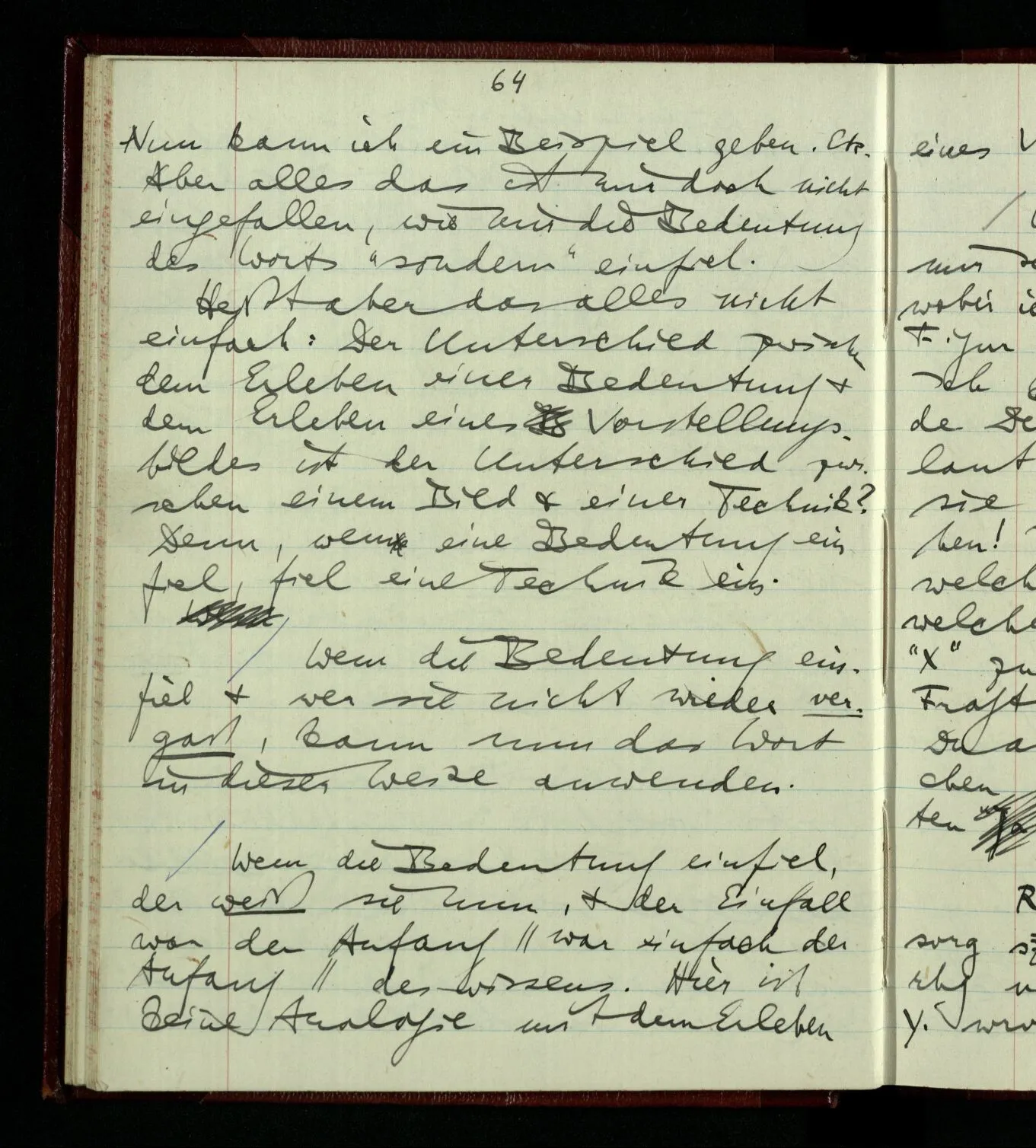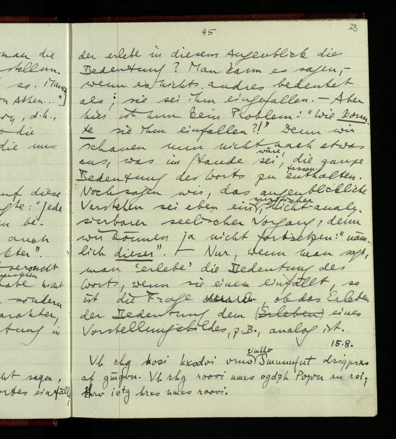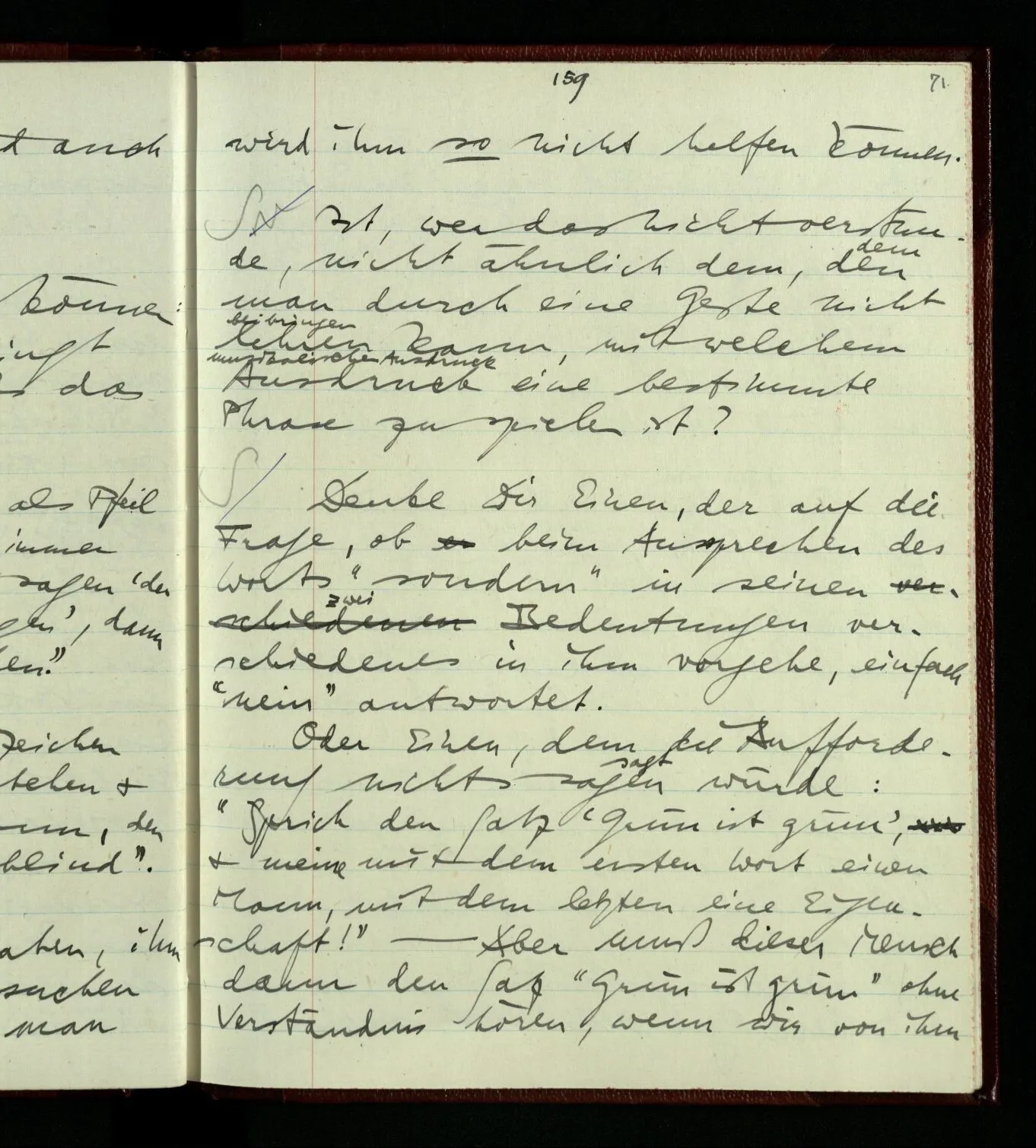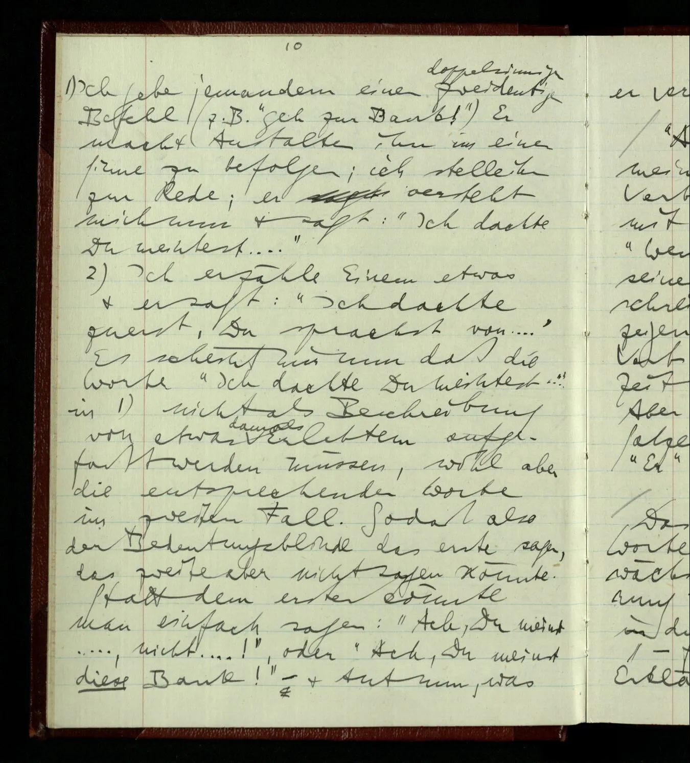 - Ich erzähle Einem etwas & er sagt: “Ich dachte zuerst, Du sprachst von ‥‥” Es scheint mir nun daß die Worte “Ich dachte Du meintest …” in 1) nicht als Beschreibung von etwas damals Erlebtem aufgefaßt werden müssen, wohl aber die entsprechenden Worte im zweiten Fall. So daß also der Bedeutungsblinde das erste sagen, das zweite aber nicht sagen könnte. Statt dem ersten könnte man einfach sagen: “Ach, Du meinst …, nicht …!”, oder “Ach, Du meinst diese Bank!” – & tut nun, was er verlangt.