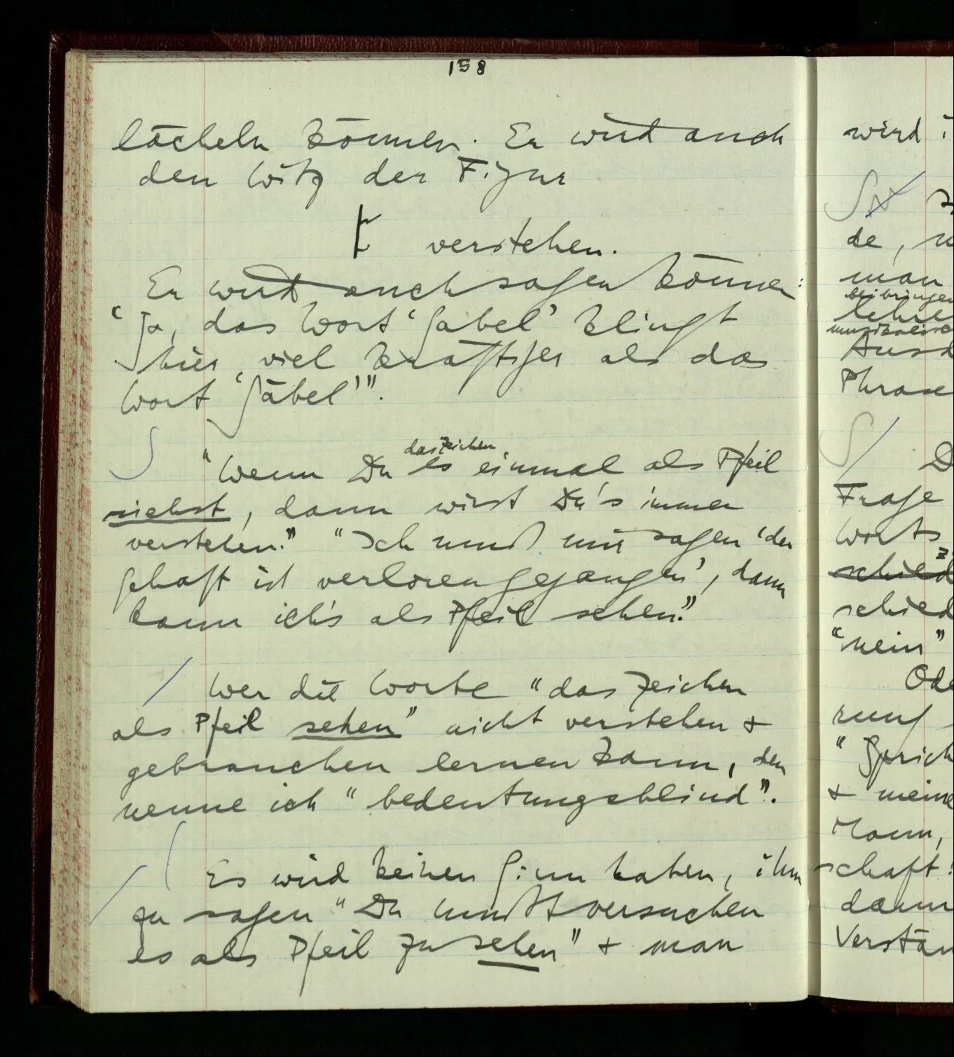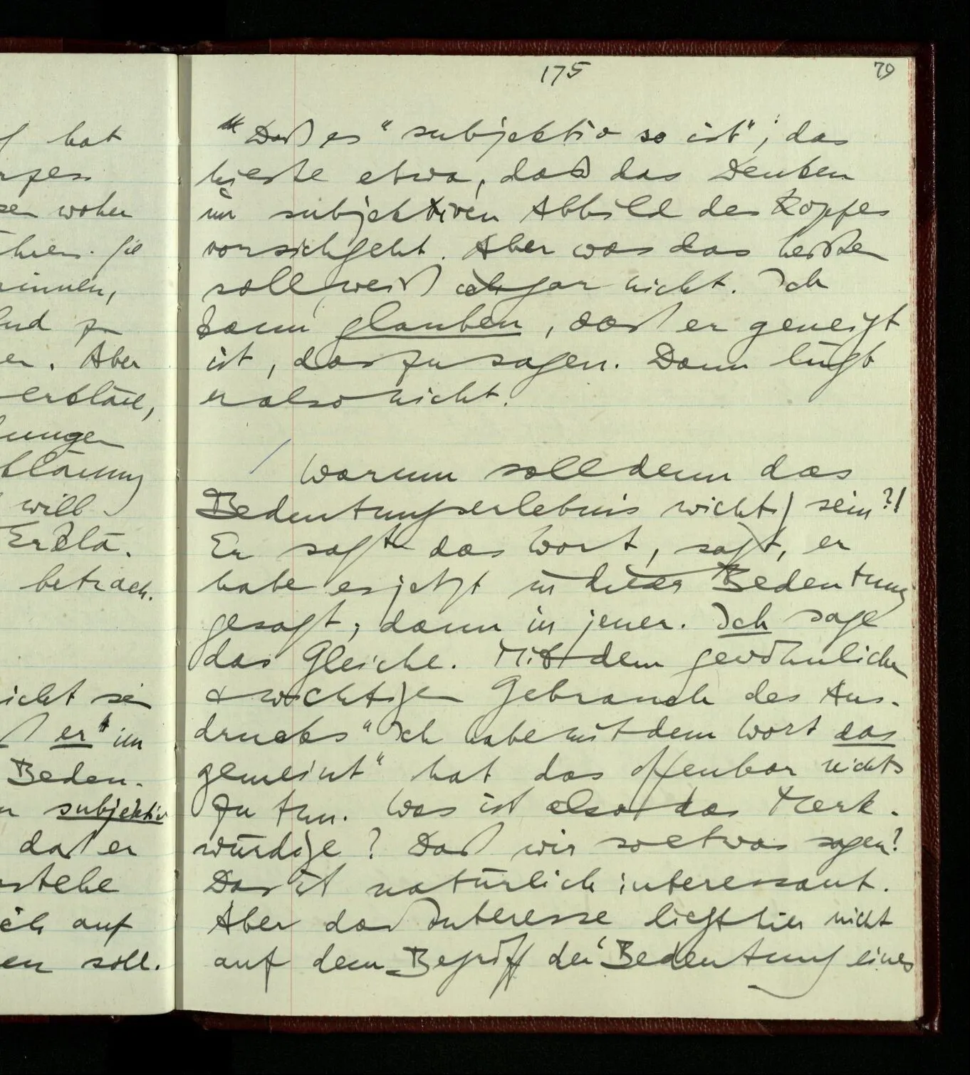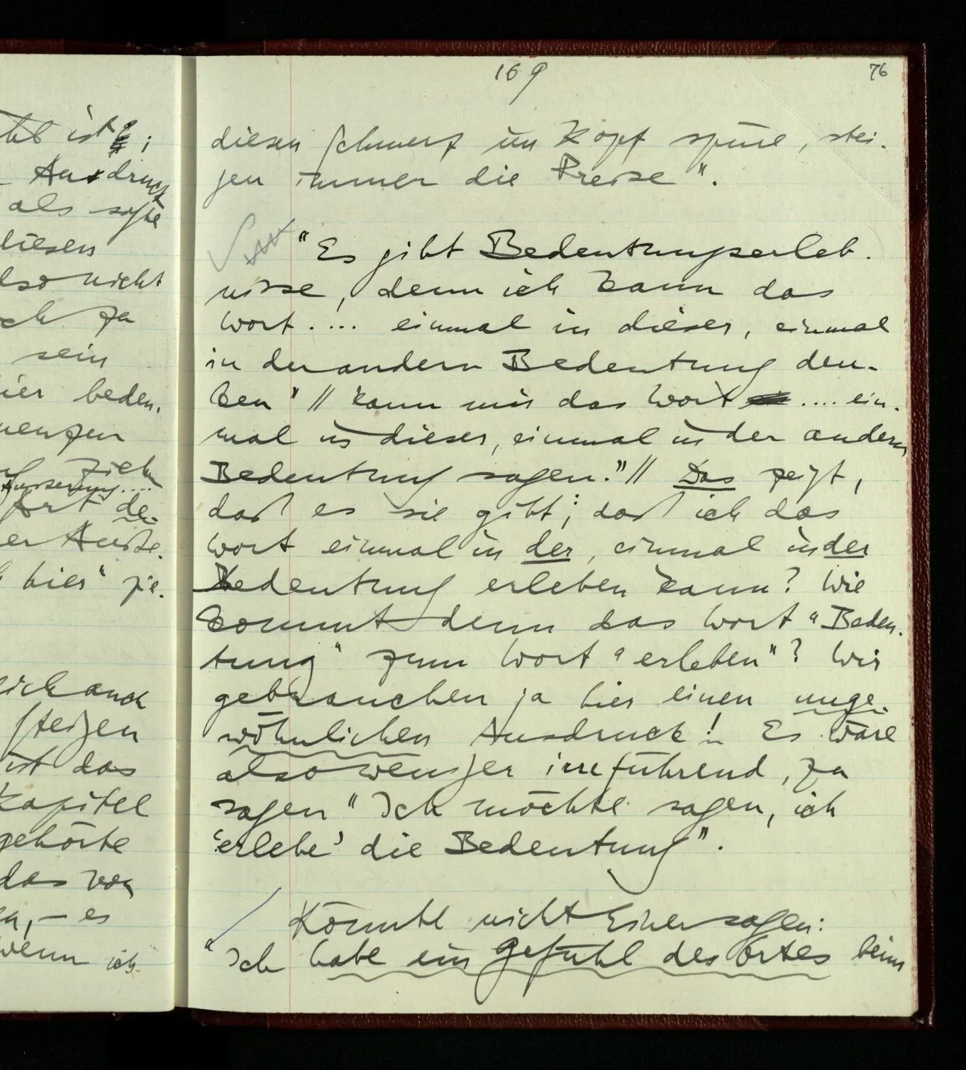 - Ich erzähle Einem etwas & er sagt: “Ich dachte zuerst, Du sprachst von ‥‥” Es scheint mir nun daß die Worte “Ich dachte Du meintest …” in 1) nicht als Beschreibung von etwas damals Erlebtem aufgefaßt werden müssen, wohl aber die entsprechenden Worte im zweiten Fall. So daß also der Bedeutungsblinde das erste sagen, das zweite aber nicht sagen könnte. Statt dem ersten könnte man einfach sagen: “Ach, Du meinst …, nicht …!”, oder “Ach, Du meinst diese Bank!” – & tut nun, was er verlangt.