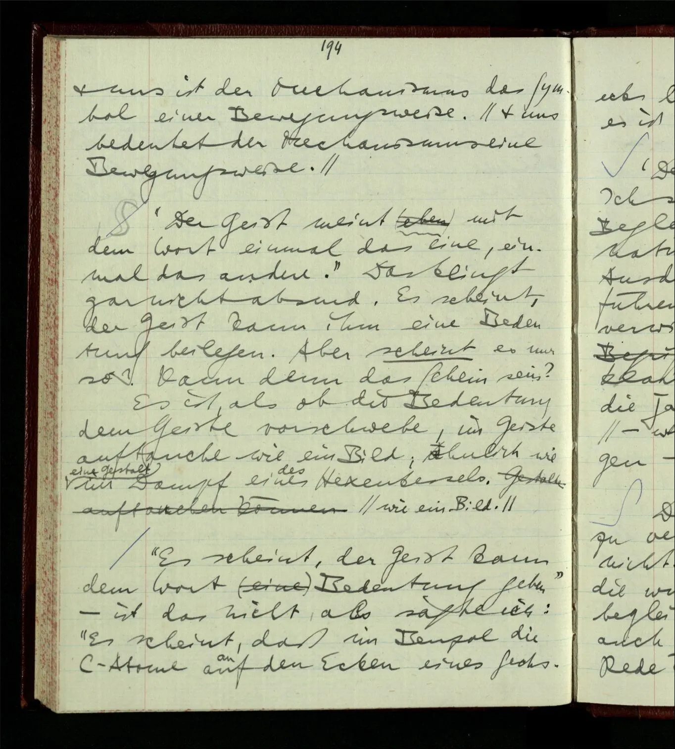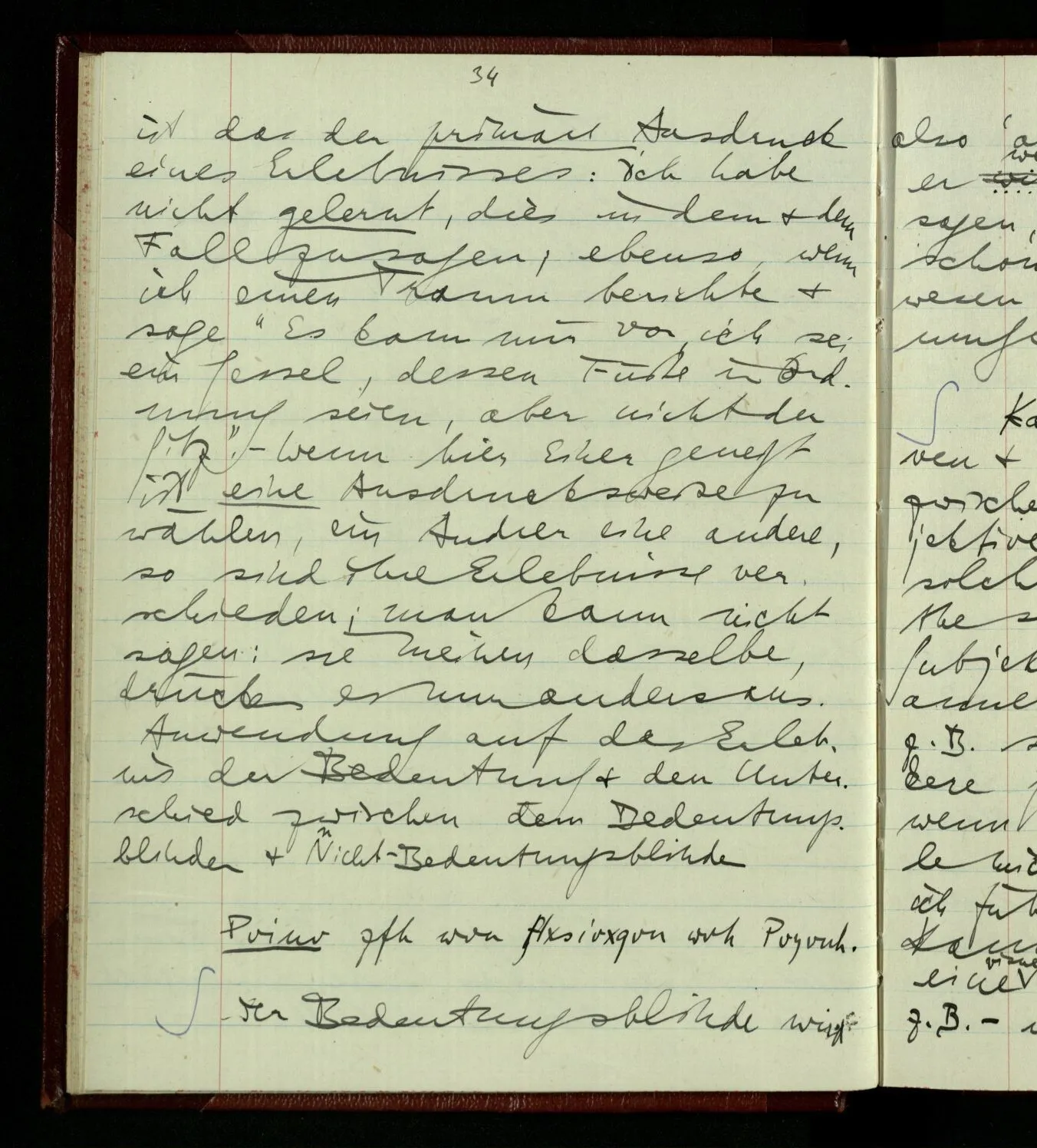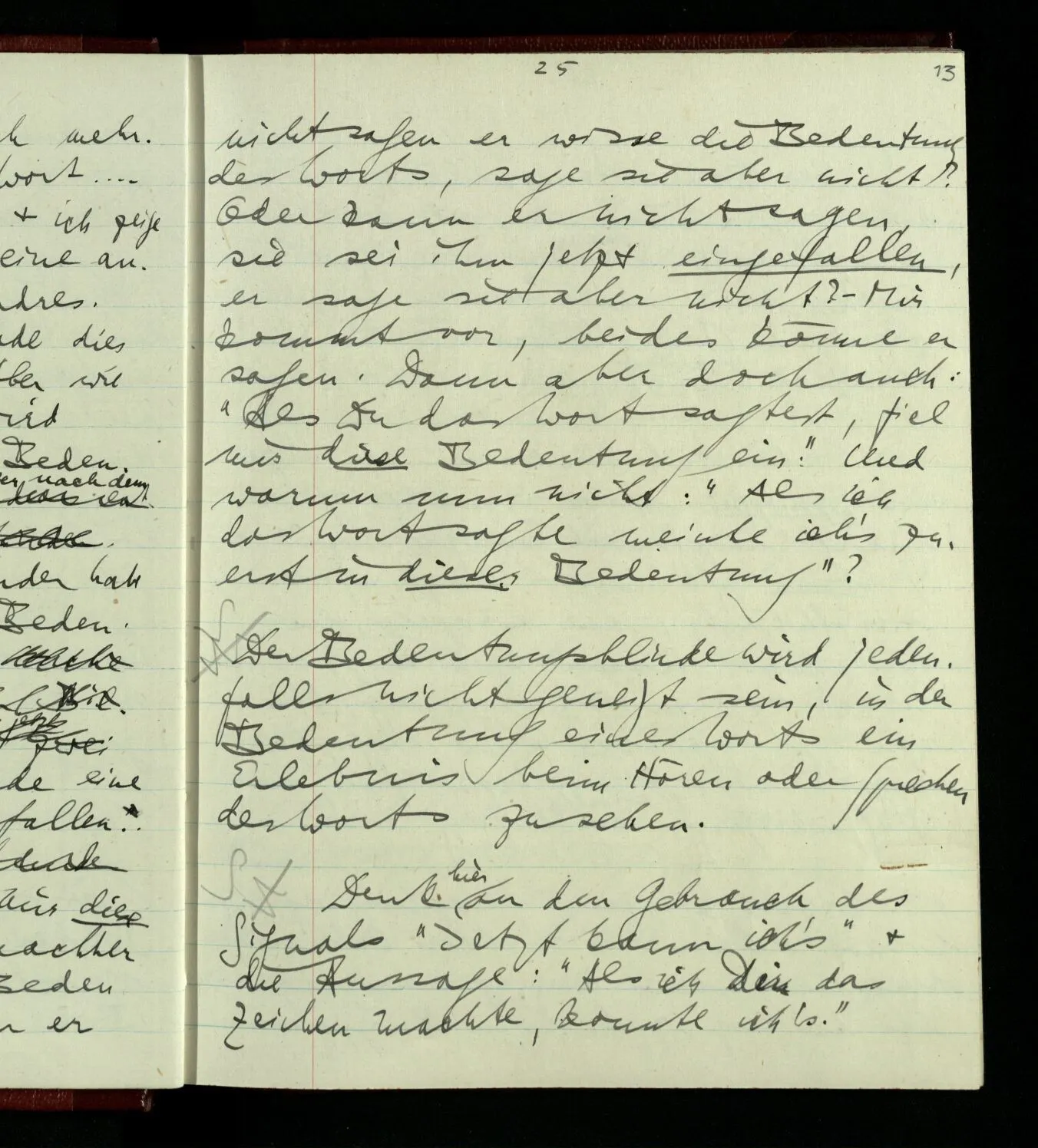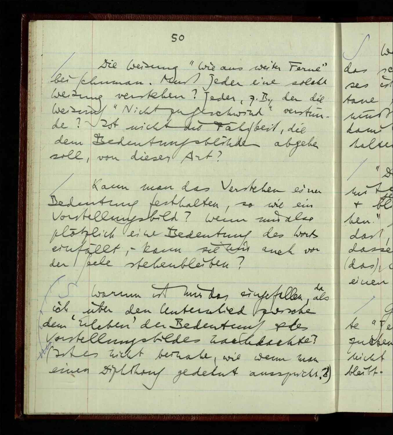 - Ich erzähle Einem etwas & er sagt: “Ich dachte zuerst, Du sprachst von ‥‥” Es scheint mir nun daß die Worte “Ich dachte Du meintest …” in 1) nicht als Beschreibung von etwas damals Erlebtem aufgefaßt werden müssen, wohl aber die entsprechenden Worte im zweiten Fall. So daß also der Bedeutungsblinde das erste sagen, das zweite aber nicht sagen könnte. Statt dem ersten könnte man einfach sagen: “Ach, Du meinst …, nicht …!”, oder “Ach, Du meinst diese Bank!” – & tut nun, was er verlangt.
