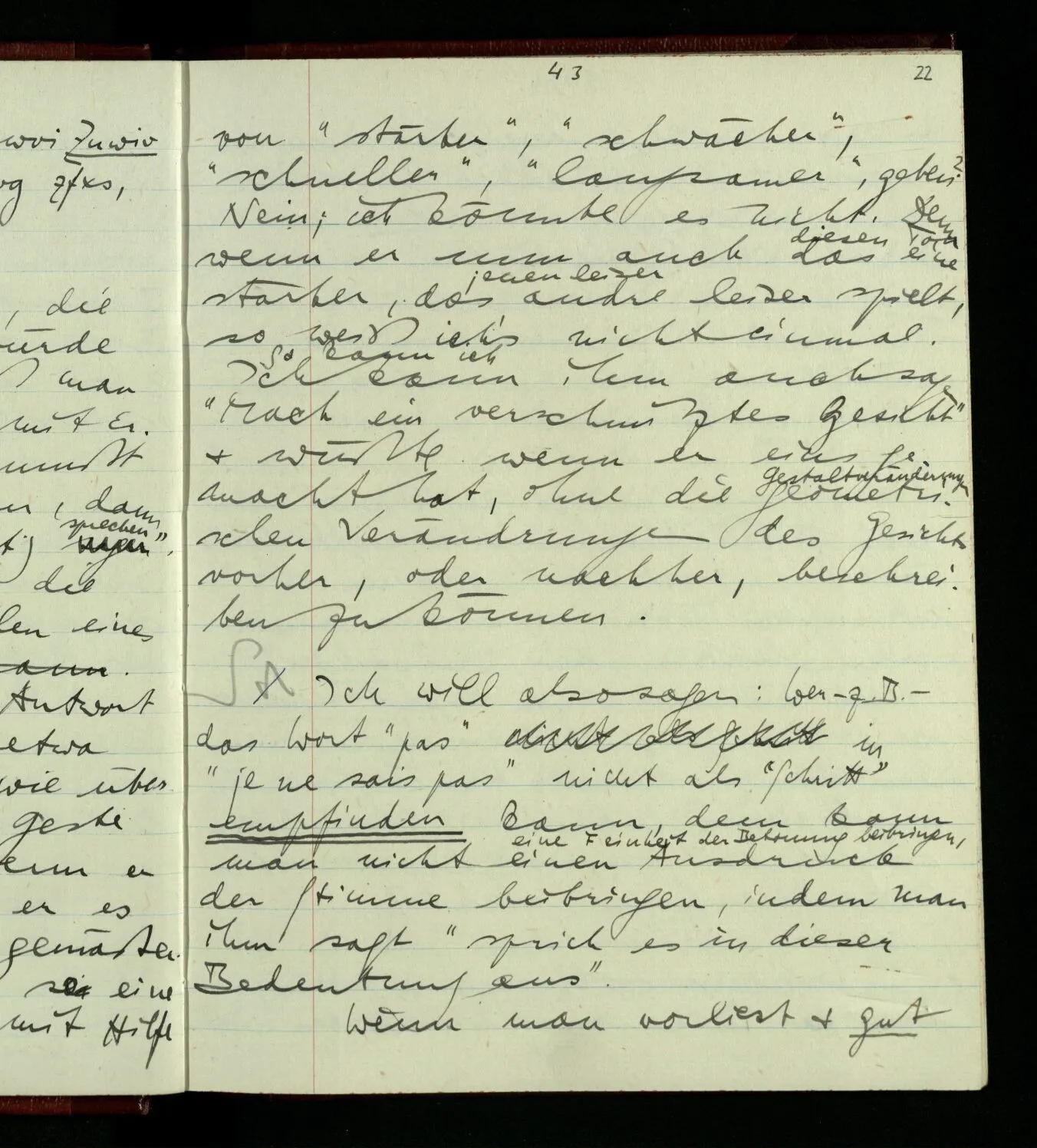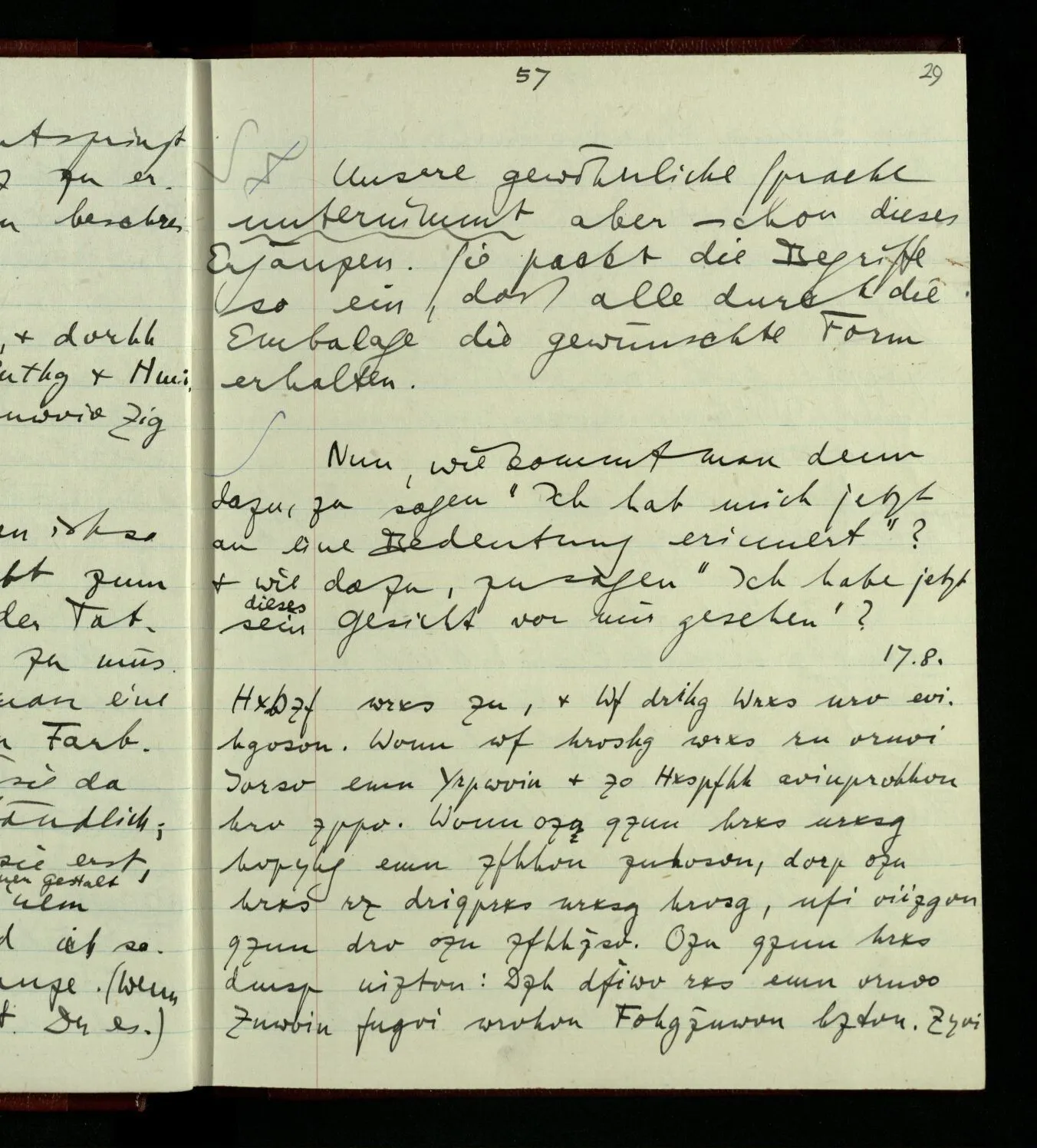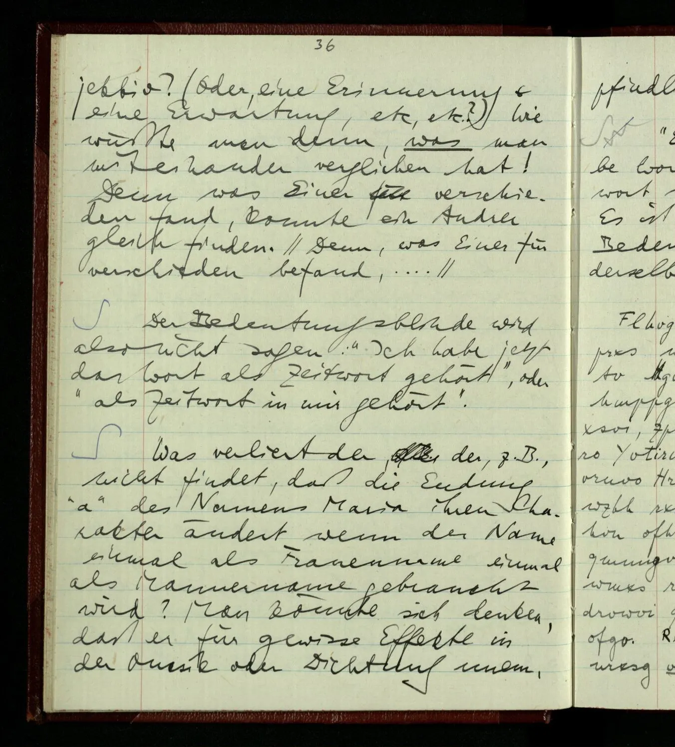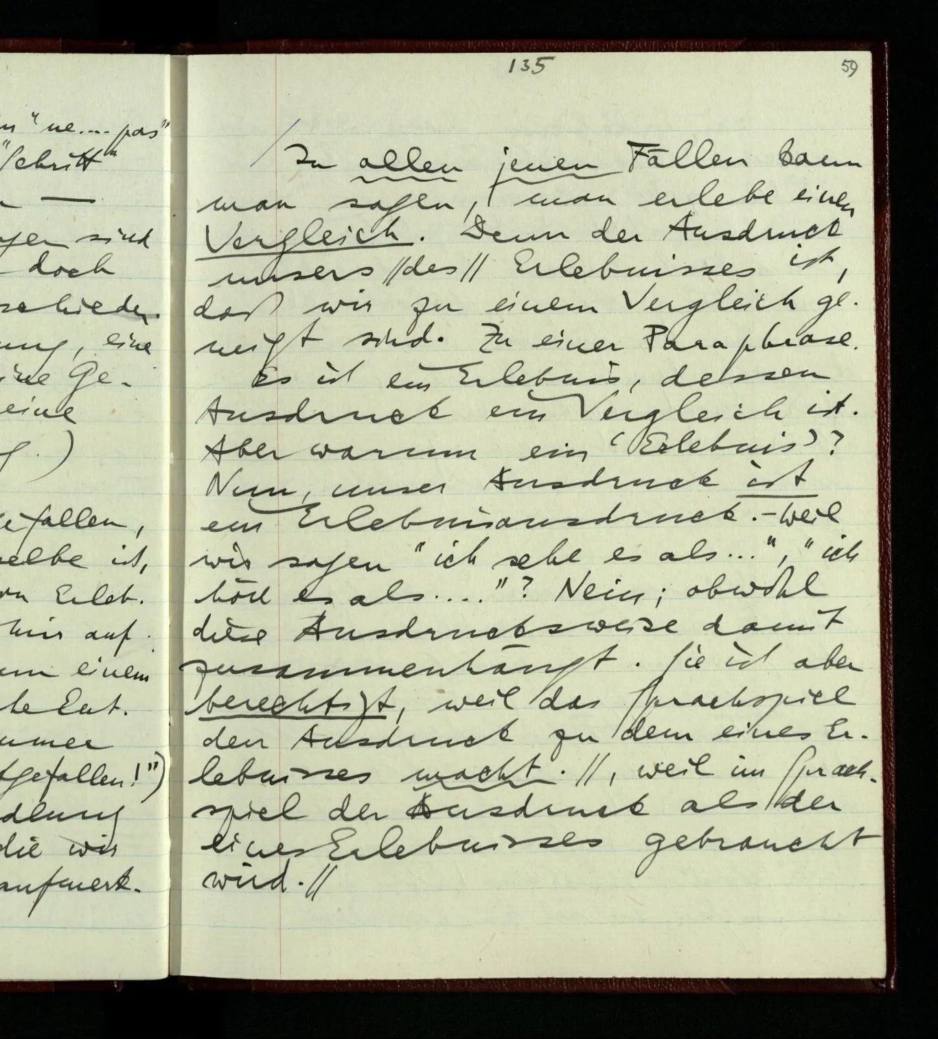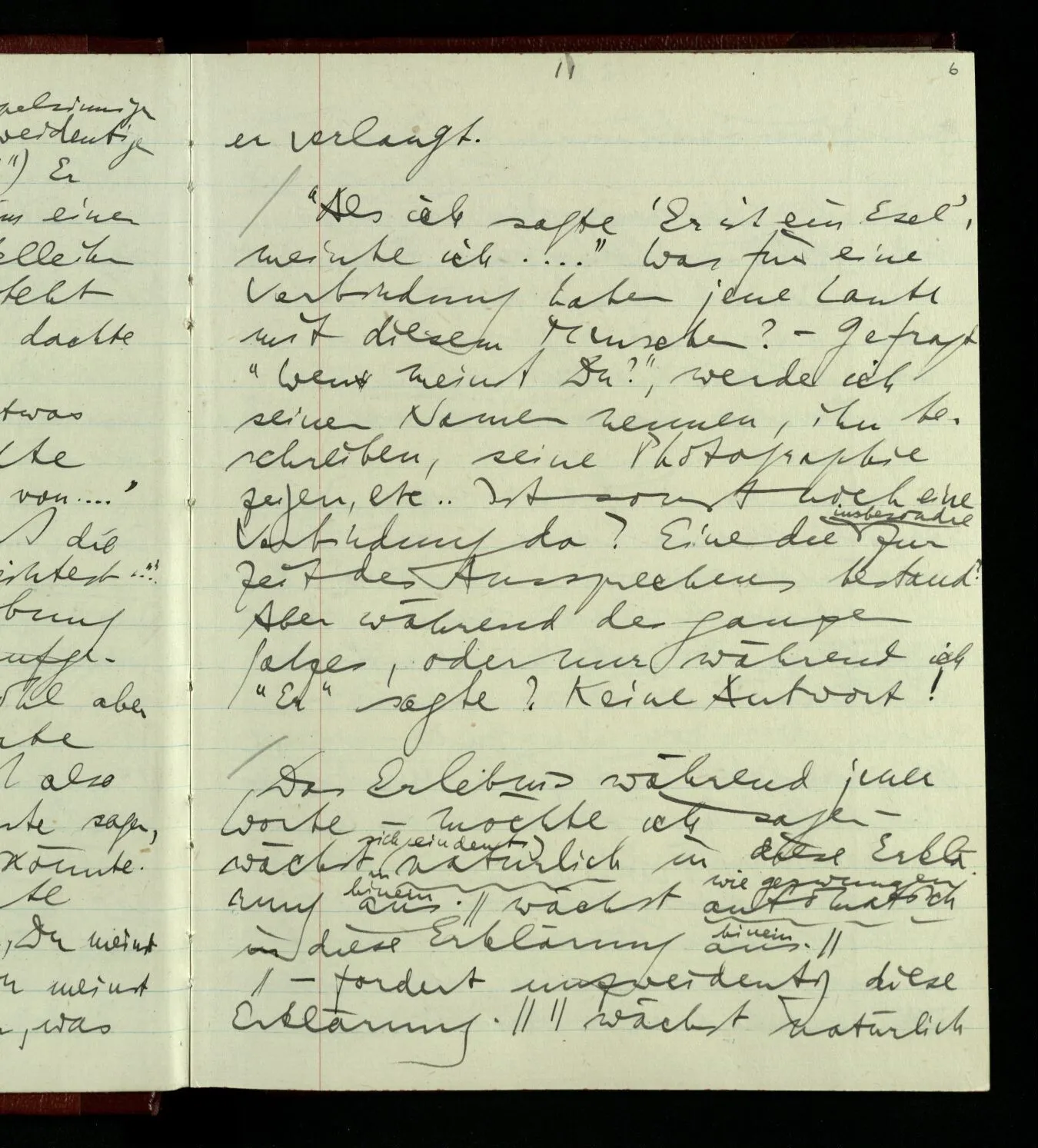Aber es ist doch so: Ich werde manchmal, im Gespräch etwa, sagen “Er ist ein Esel” & wenn man mich fragte “Hättest Du etwas anderes bei diesen Worten erlebt, wenn wir von N geredet hätten statt von M”, werde ich zugeben müssen, das müsse nicht der Fall sein. Anderseits aber scheint es mir manchmal, als hätte ich während des Aussprechens ein Erlebnis das unzweideutig ihm angehört. Die Erlebnisse beim Sprechen scheinen eindeutig mit ihm verbunden zu sein.