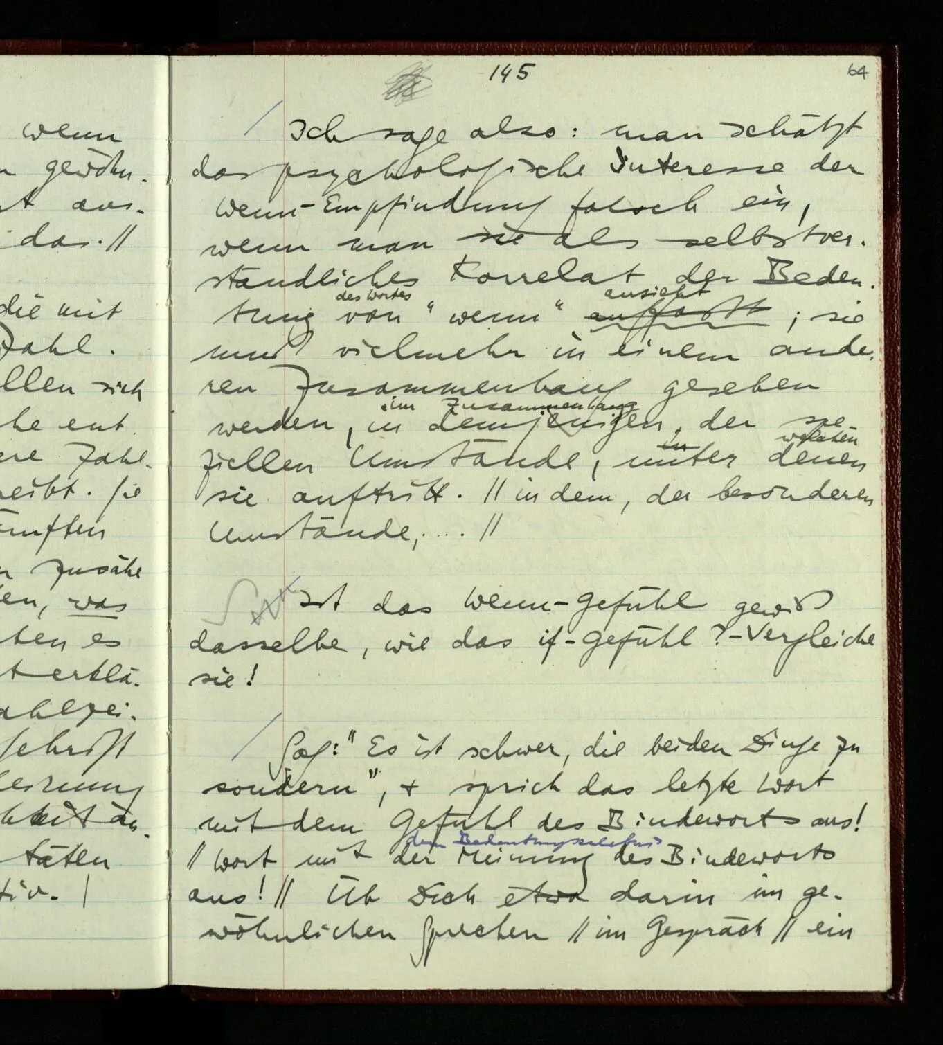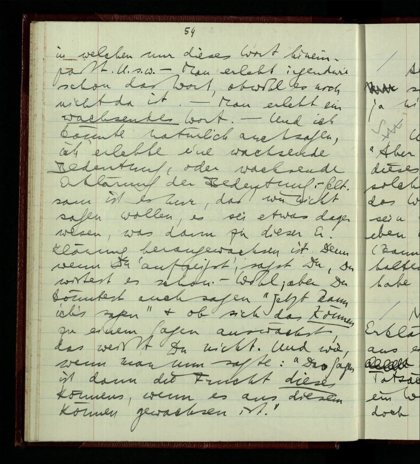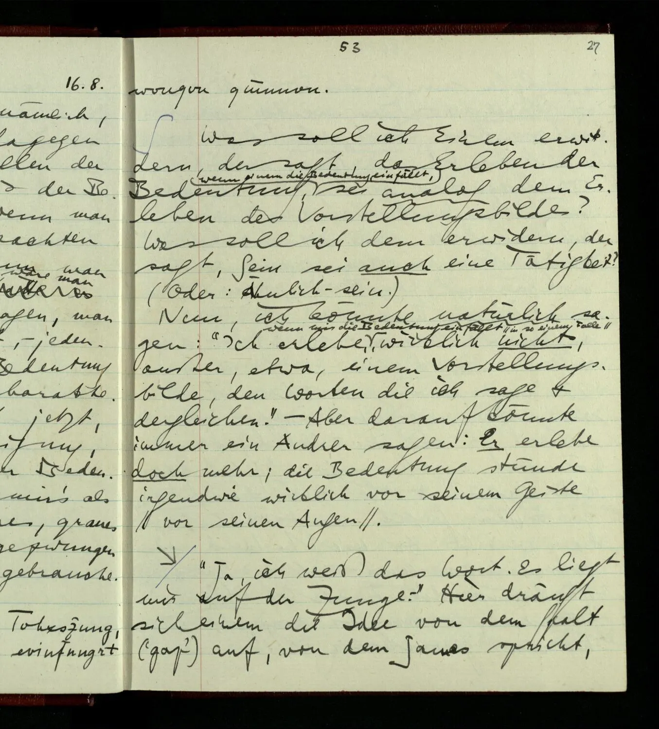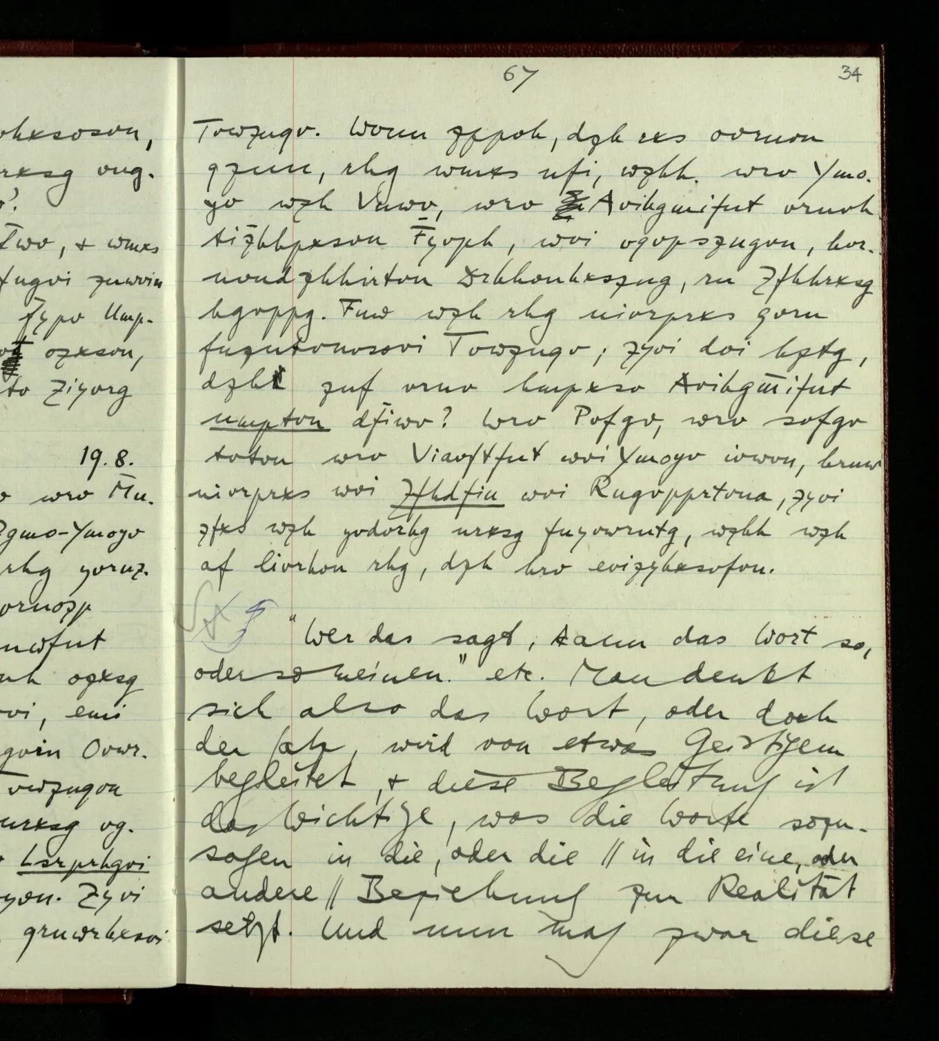 Aber es ist doch so: Ich werde manchmal, im Gespräch etwa, sagen “Er ist ein Esel” & wenn man mich fragte “Hättest Du etwas anderes bei diesen Worten erlebt, wenn wir von N geredet hätten statt von M”, werde ich zugeben müssen, das müsse nicht der Fall sein. Anderseits aber scheint es mir manchmal, als hätte ich während des Aussprechens ein Erlebnis das unzweideutig ihm angehört. Die Erlebnisse beim Sprechen scheinen eindeutig mit ihm verbunden zu sein.