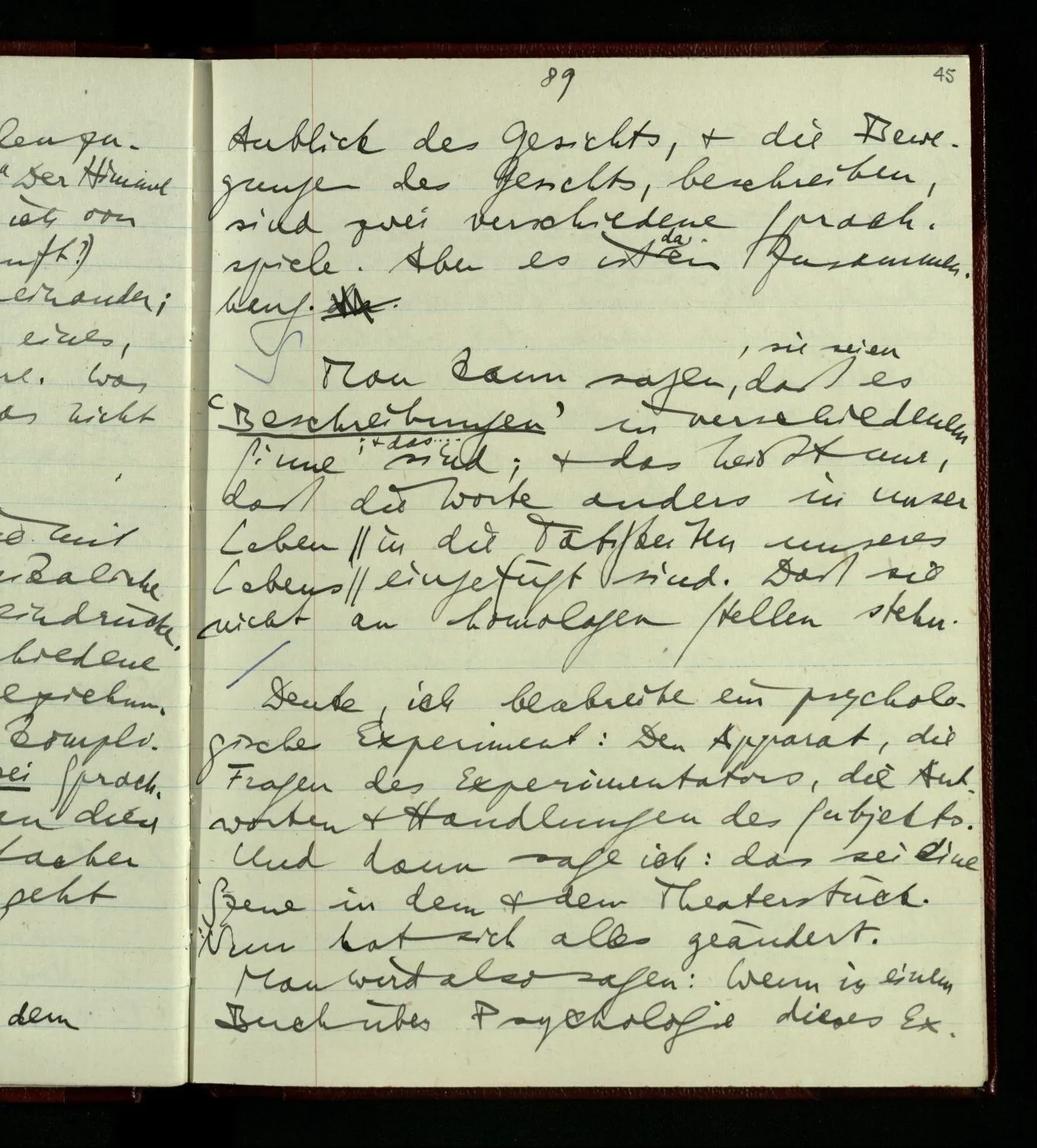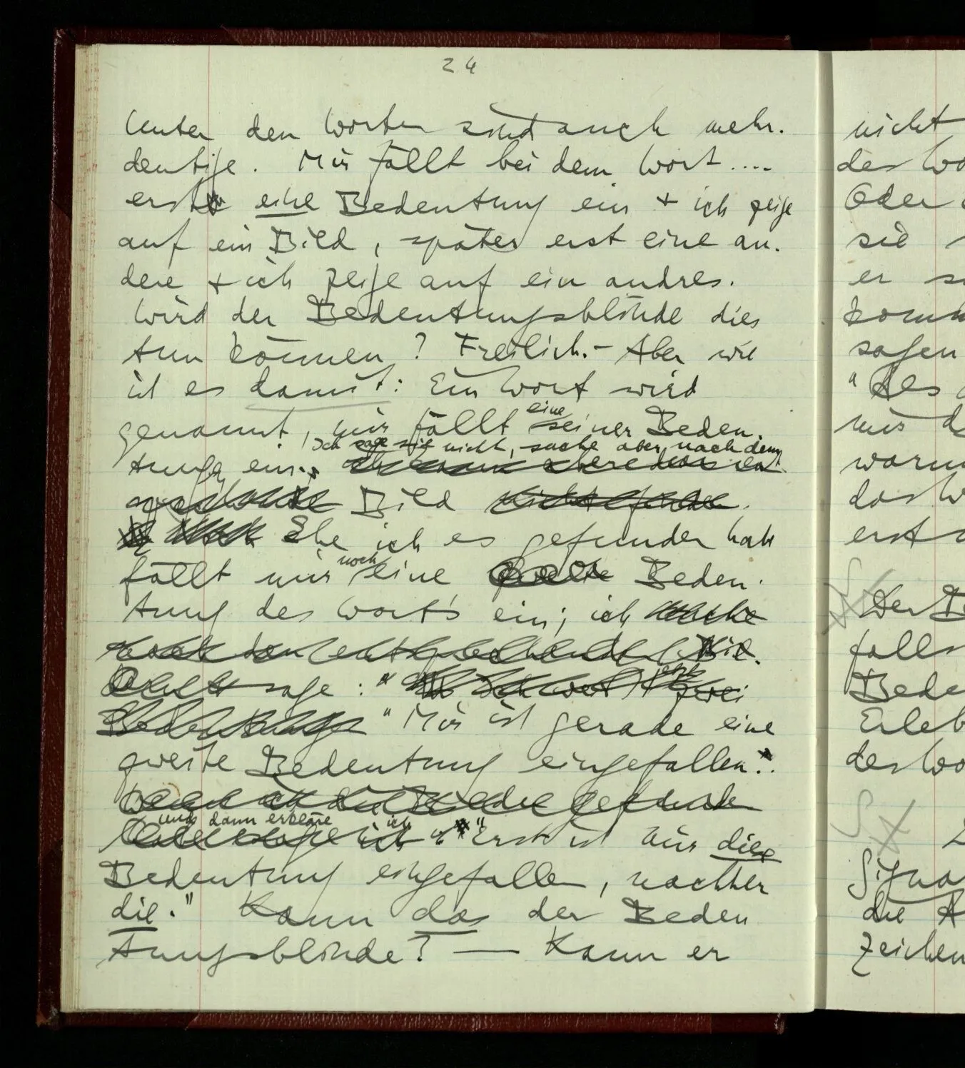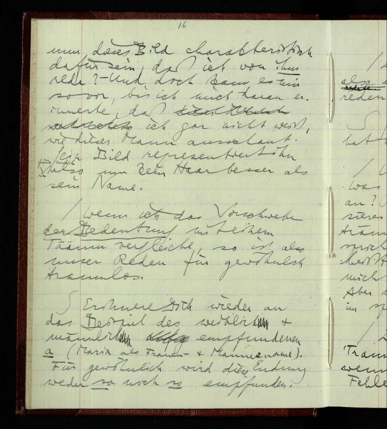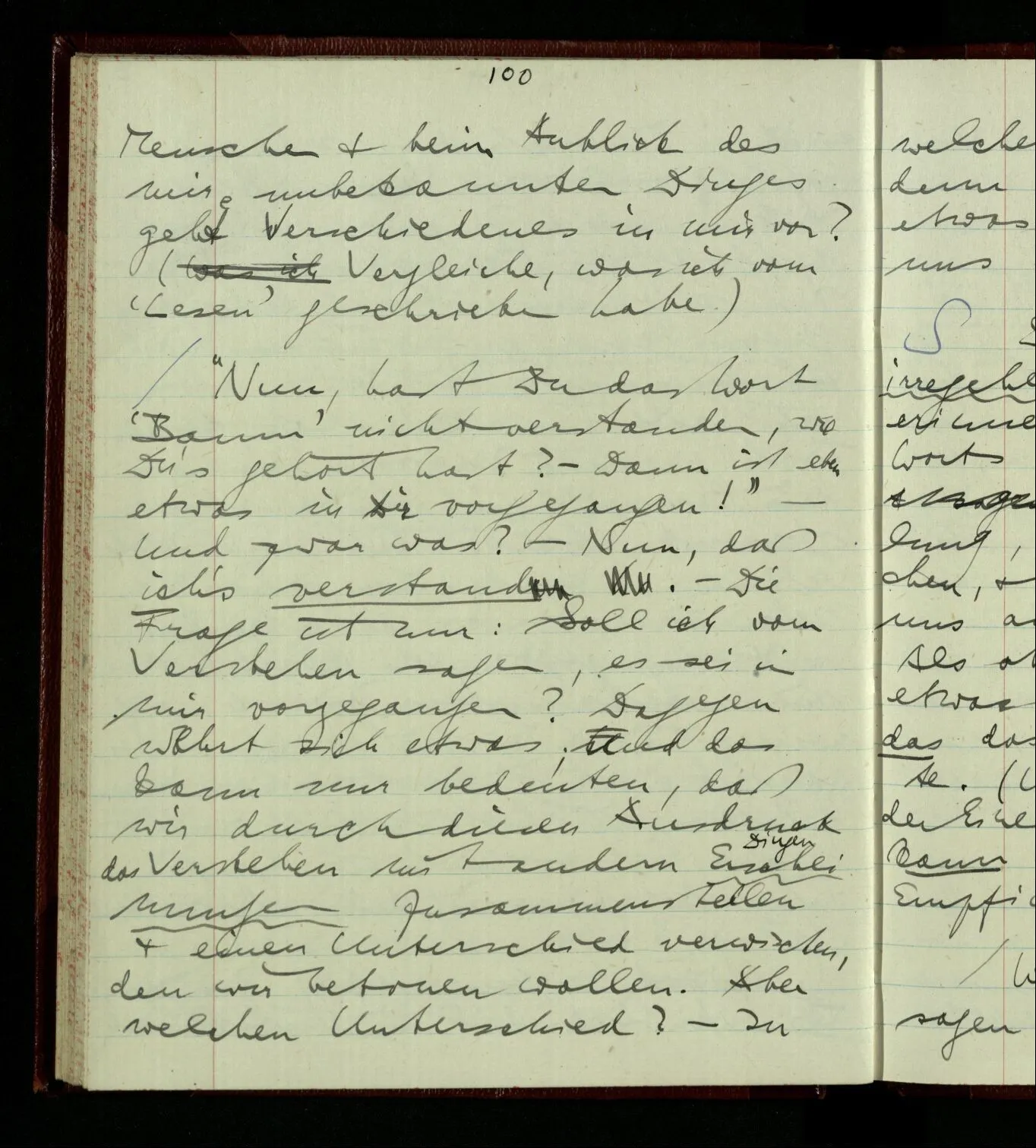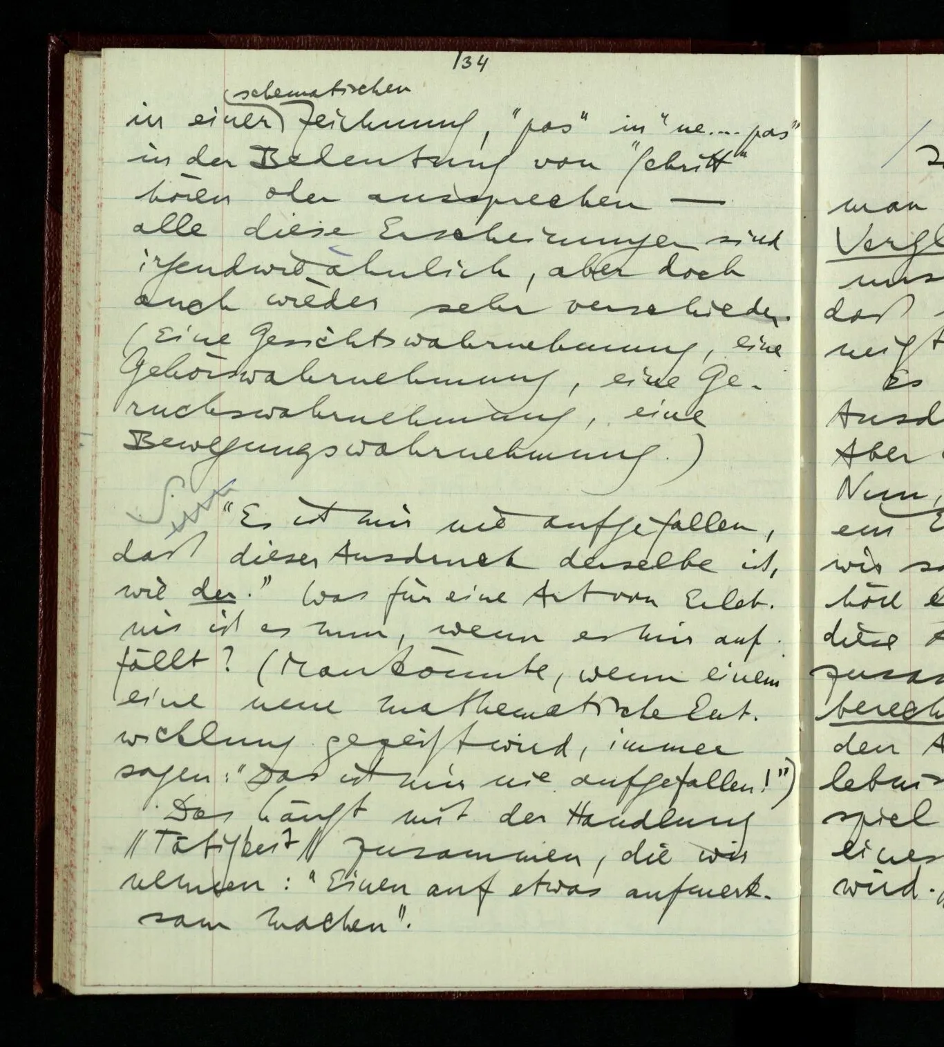 Aber es ist doch so: Ich werde manchmal, im Gespräch etwa, sagen “Er ist ein Esel” & wenn man mich fragte “Hättest Du etwas anderes bei diesen Worten erlebt, wenn wir von N geredet hätten statt von M”, werde ich zugeben müssen, das müsse nicht der Fall sein. Anderseits aber scheint es mir manchmal, als hätte ich während des Aussprechens ein Erlebnis das unzweideutig ihm angehört. Die Erlebnisse beim Sprechen scheinen eindeutig mit ihm verbunden zu sein.