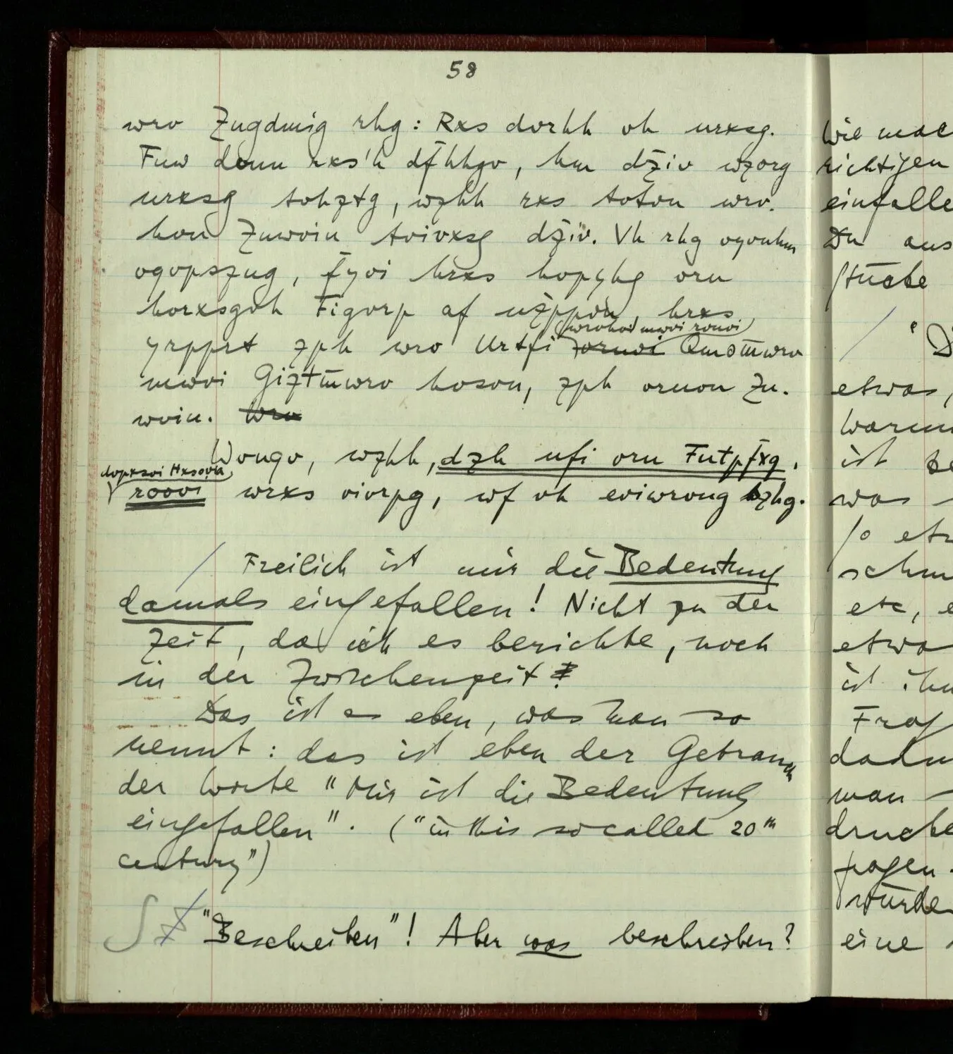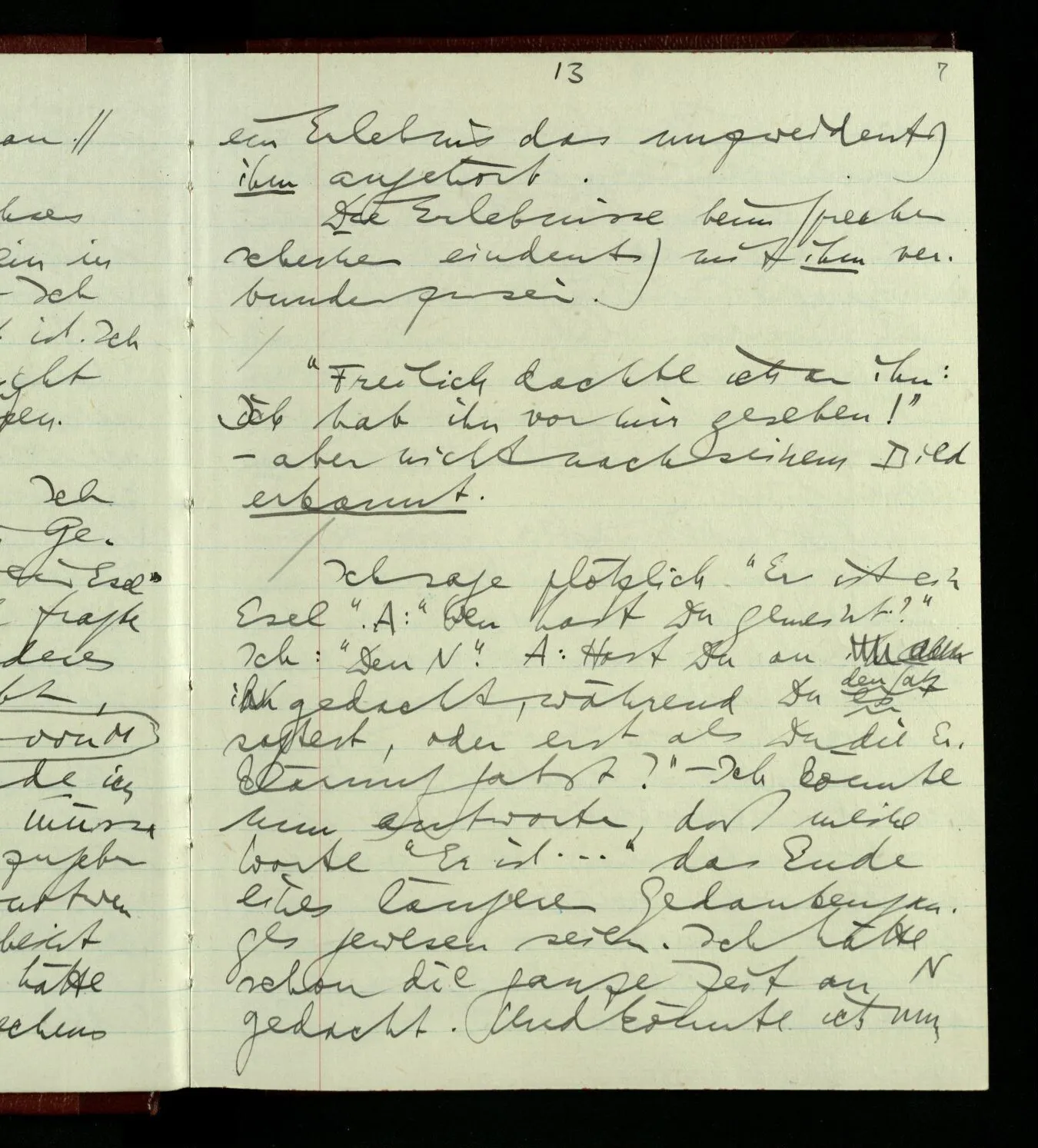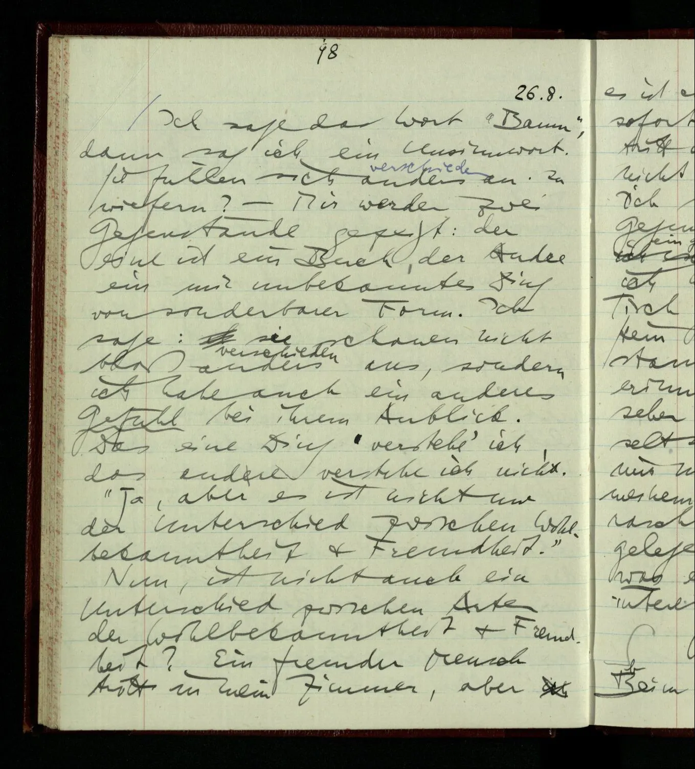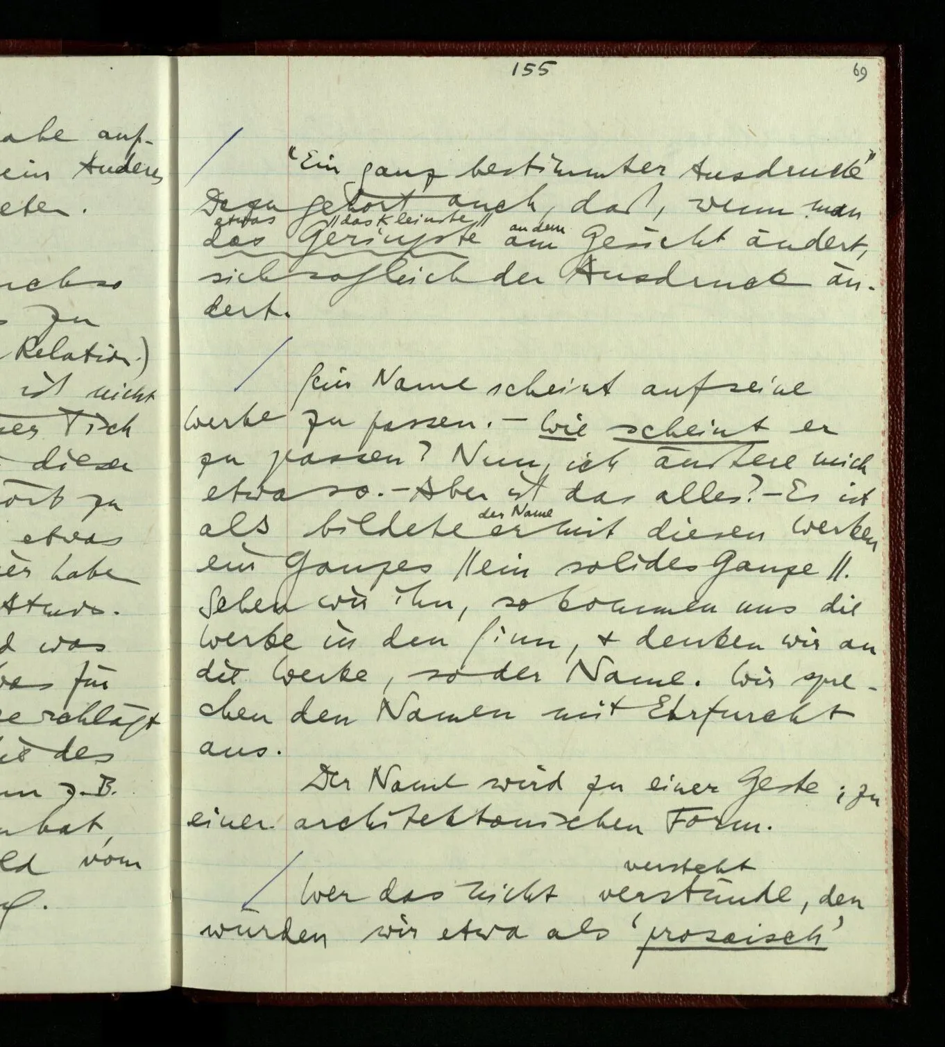 Aber es ist doch so: Ich werde manchmal, im Gespräch etwa, sagen “Er ist ein Esel” & wenn man mich fragte “Hättest Du etwas anderes bei diesen Worten erlebt, wenn wir von N geredet hätten statt von M”, werde ich zugeben müssen, das müsse nicht der Fall sein. Anderseits aber scheint es mir manchmal, als hätte ich während des Aussprechens ein Erlebnis das unzweideutig ihm angehört. Die Erlebnisse beim Sprechen scheinen eindeutig mit ihm verbunden zu sein.