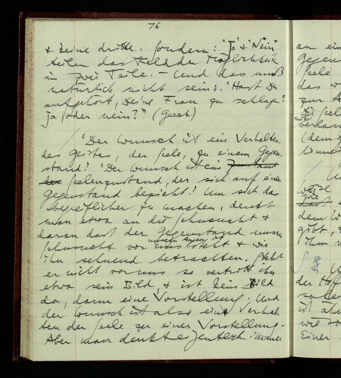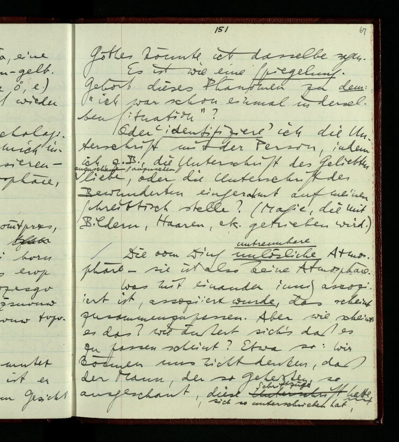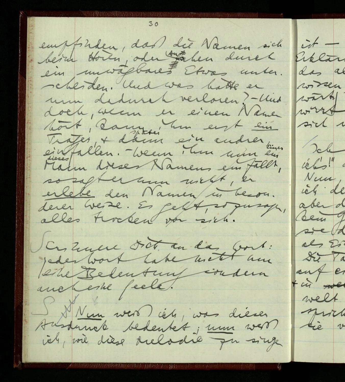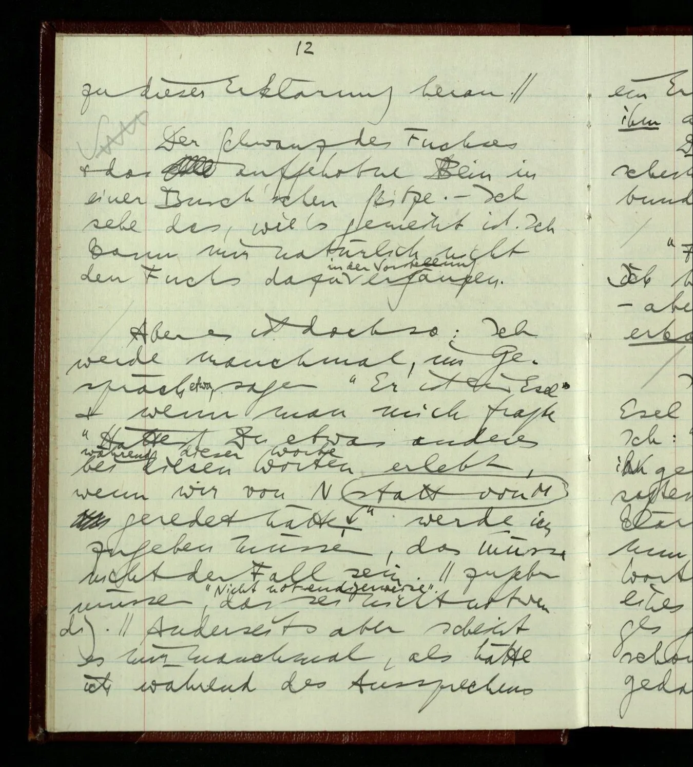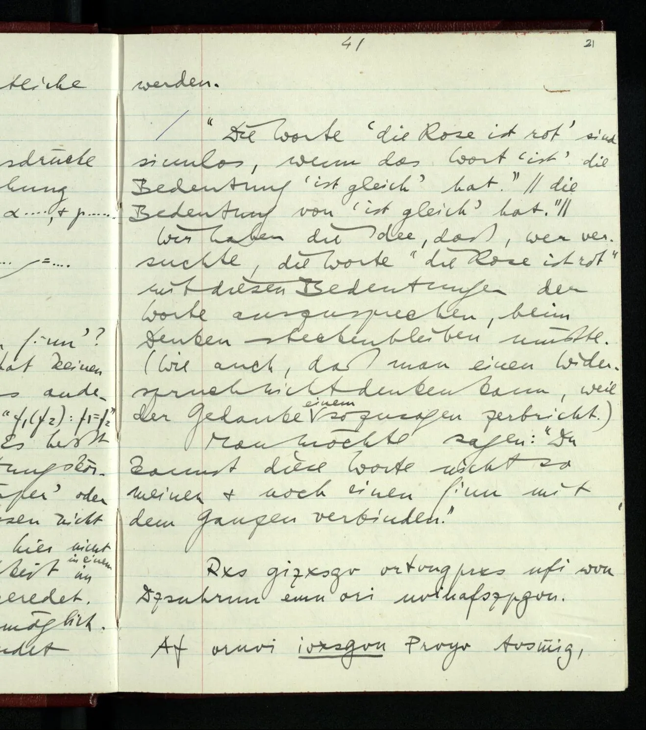 Aber es ist doch so: Ich werde manchmal, im Gespräch etwa, sagen “Er ist ein Esel” & wenn man mich fragte “Hättest Du etwas anderes bei diesen Worten erlebt, wenn wir von N geredet hätten statt von M”, werde ich zugeben müssen, das müsse nicht der Fall sein. Anderseits aber scheint es mir manchmal, als hätte ich während des Aussprechens ein Erlebnis das unzweideutig ihm angehört. Die Erlebnisse beim Sprechen scheinen eindeutig mit ihm verbunden zu sein.