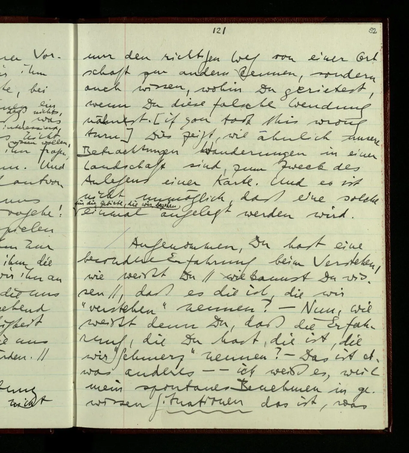 Ich sage plötzlich “Er ist ein Esel”. A: “Wen hast Du gemeint?” Ich: “Den N”. A: Hast Du an ihn gedacht, während Du es sagtest, oder erst als Du die Erklärung gabst?” – Ich könnte nun antworten, daß meine Worte “Er ist …” das Ende eines längeren Gedankenganges gewesen seien. Ich hätte schon die ganze Zeit an N gedacht. Und könnte ich nun sagen: die Worte selbst seien durch kein besonderes Erlebnis an ihn gekettet gewesen, wohl aber der ganze Gedankengang? Ich hätte also mit jenen Worten wohl auch jemand Andern meinen können, auf wen sie sich bezogen lag in dem was ihnen voran ging. Muß ich aber, um sagen zu können, ich hätte von ihm geredet, ihn gemeint, an ihn gedacht, – mich wirklich an etwas erinnern können, was unbedingt mit ihm zusammenhängt. Könnte es mir also nicht vielleicht immer so vorkommen, als wäre während meiner Worte nichts geschehen, das sich nur auf ihn deuten ließe? Ich denke mir also, ich sei mir immer bewußt, daß meine Vorstellungsbilder vieldeutig seien. Dabei aber – so nehme ich an – sage ich dennoch: “Ich habe den … gemeint”. Aber ist dies nicht eine widersprechende Annahme? Nein; so verhält es sich ja wirklich. Ich sage “Ich habe den … gemeint”; so setze ich fort.