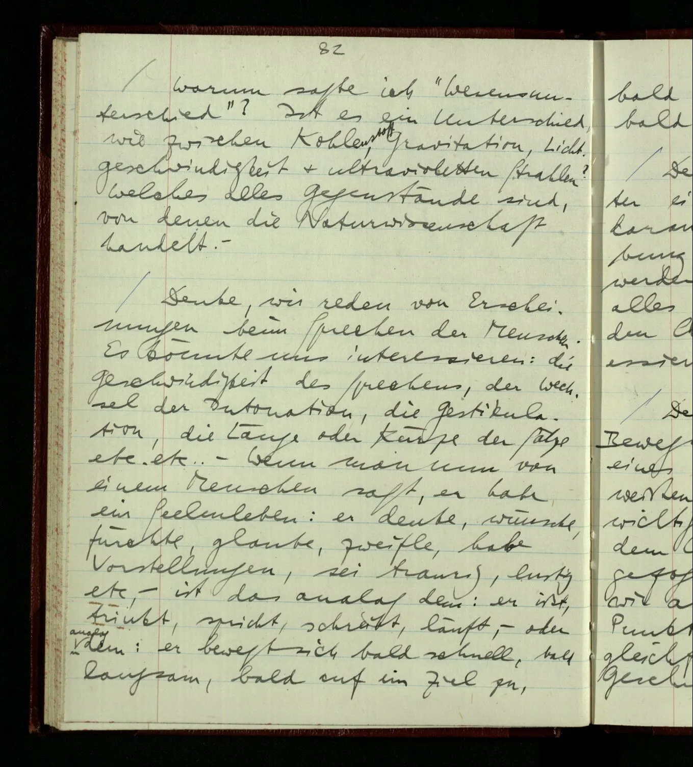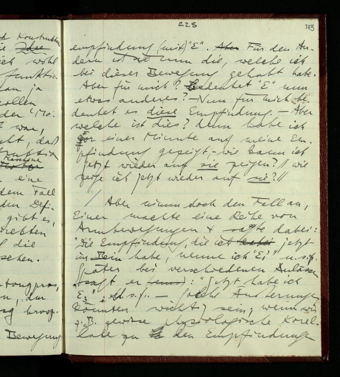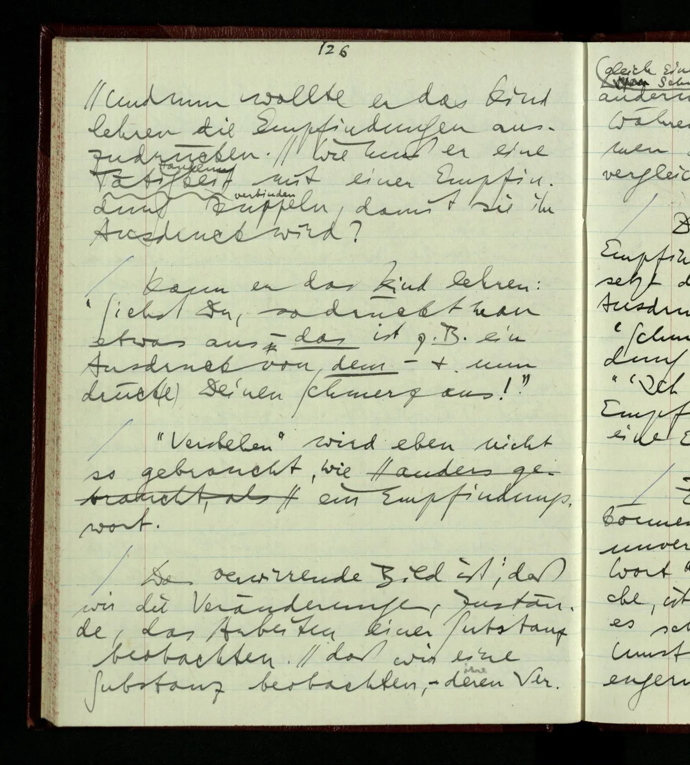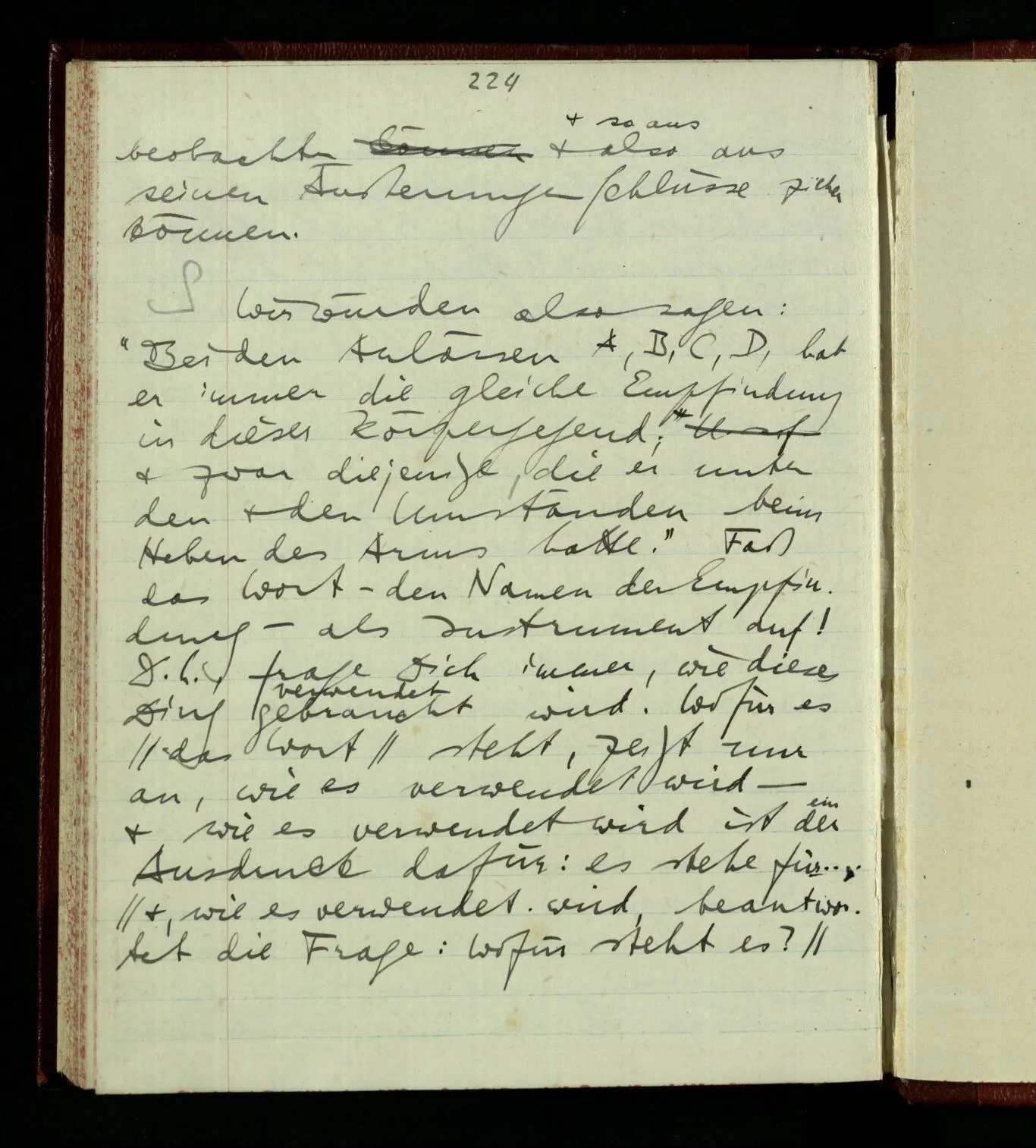 Aber nimm doch den Fall an, Einer machte eine Reihe von Armbewegungen & sagte dabei: “Die Empfindung, die ich jetzt im Bein habe, nenne ich ‘E1’” u.s.f.. Später bei verschiedenen Anlässen sagt er: “Jetzt habe ich E3”. U.s.f.. – Solche Äußerungen könnten wichtig sein; wenn wir z.B. gewisse physiologische Korrelate zu den Empfindungen beobachten & also aus seinen Äußerungen Schlüsse ziehen können.